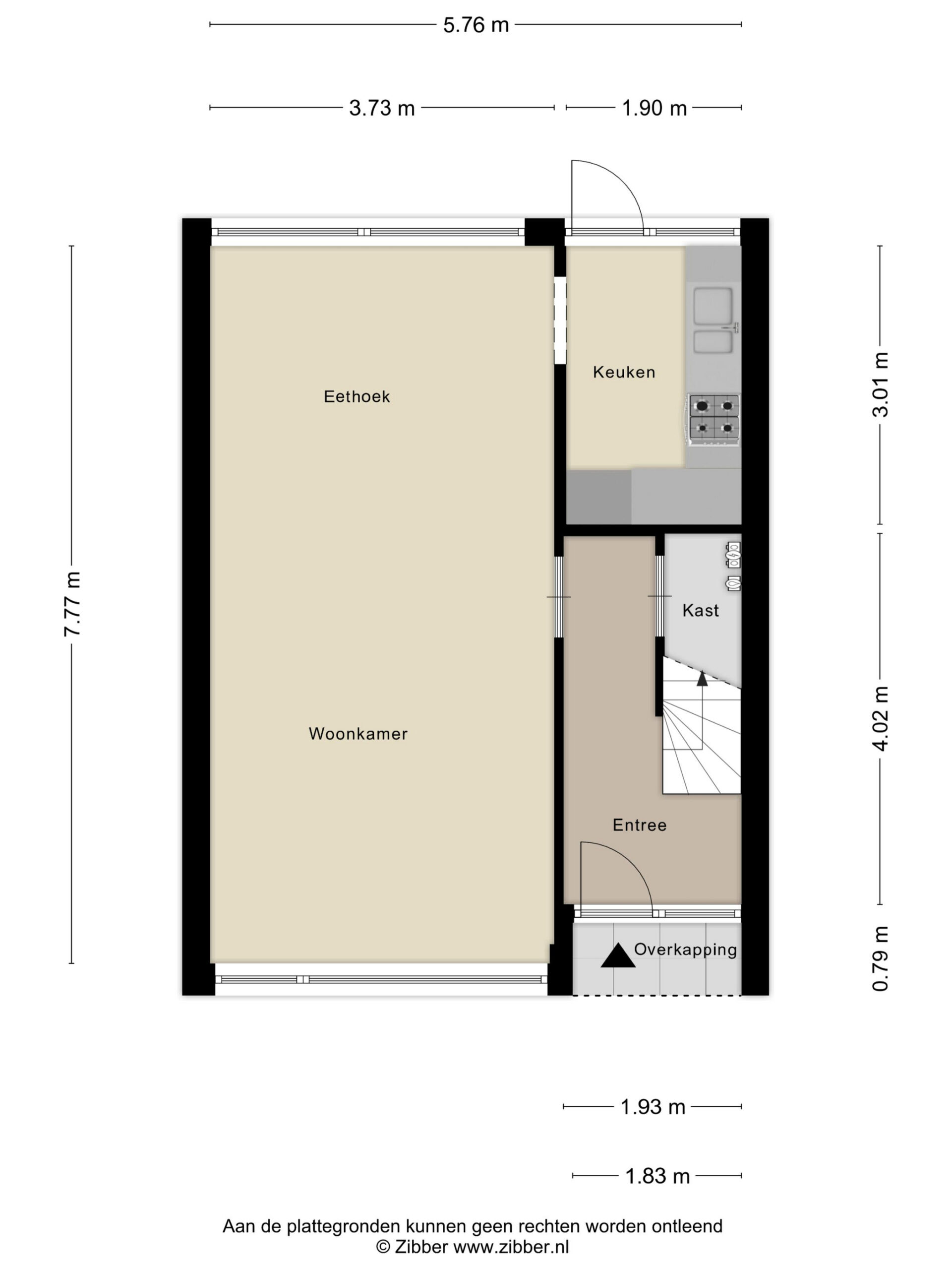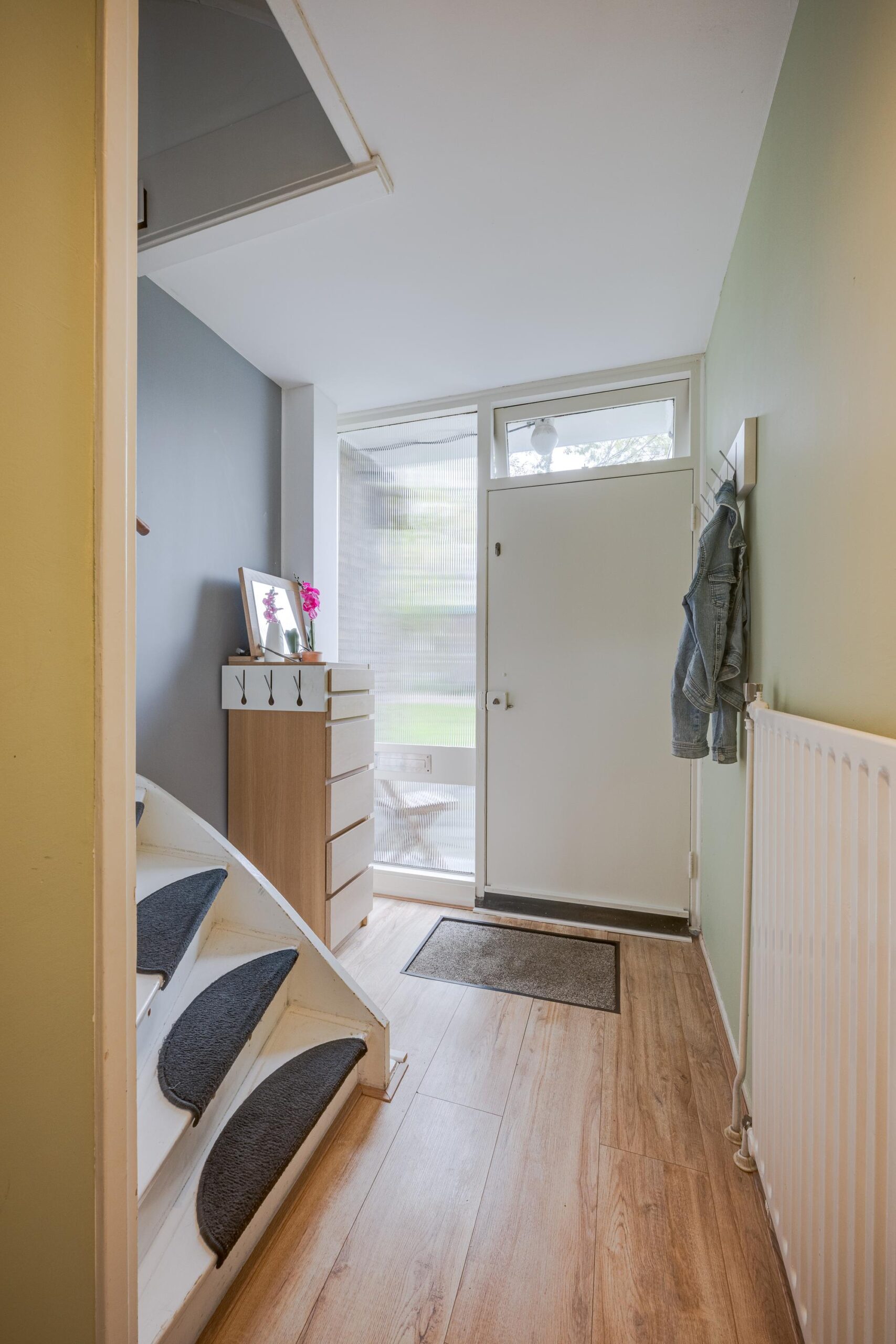 Begane grond: Voortuin en entree van de woning met een garderobe, meterkast, een separaat toilet en trap naar de eerste verdieping. Vanuit de hal een deur naar de woonkamer. De woonkamer, die uitkijkt op de voortuin, loopt over naar het eetgedeelte. Vanuit de eethoek bereik je via de keuken de deur naar de tuin.
