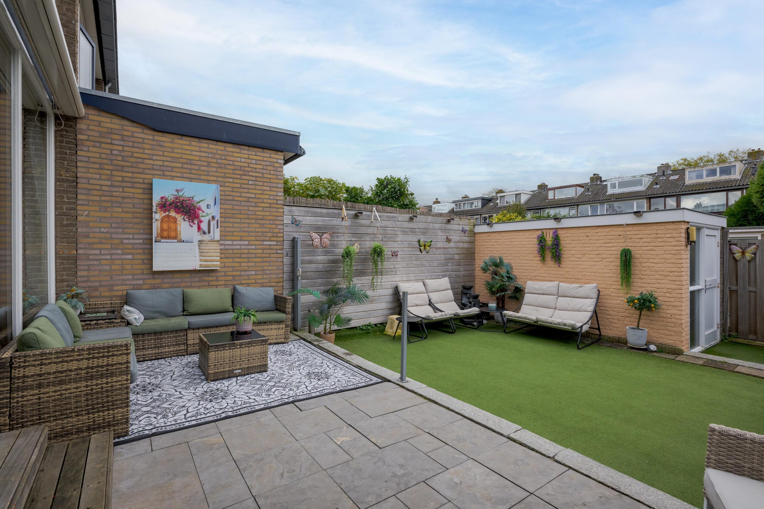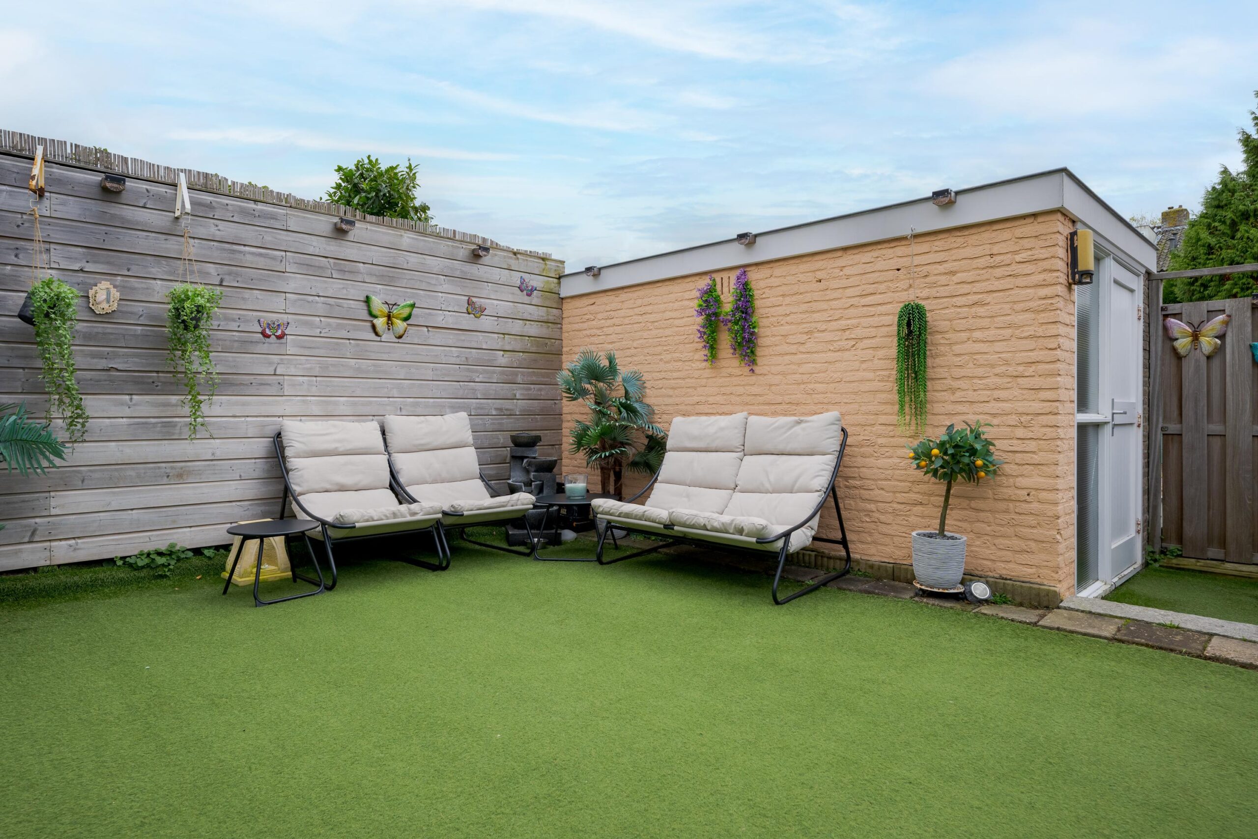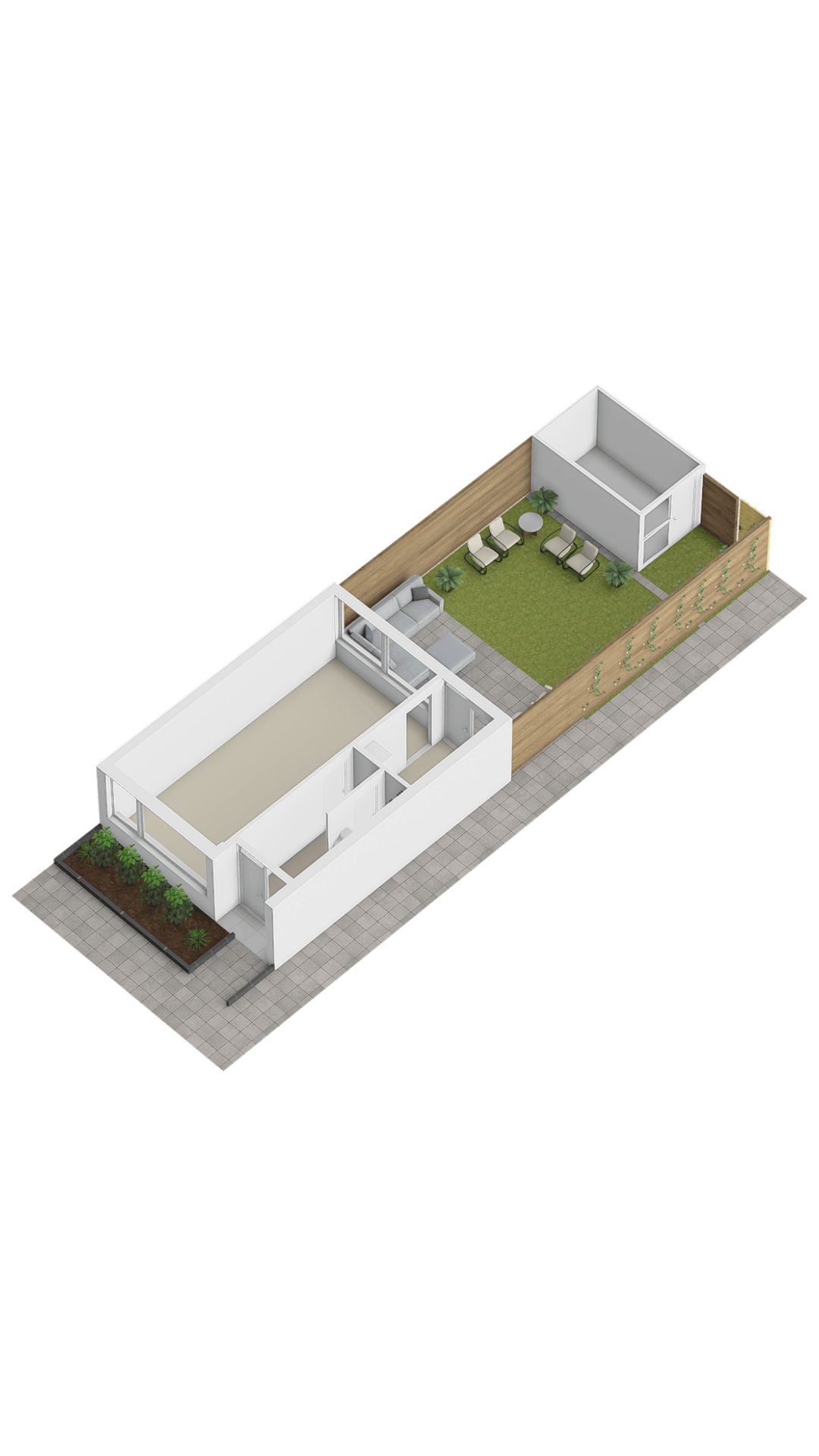 Tuin: grote tuin met verlaging, waardoor je twee zitruimtes creëert, een stenen berging en achterom.