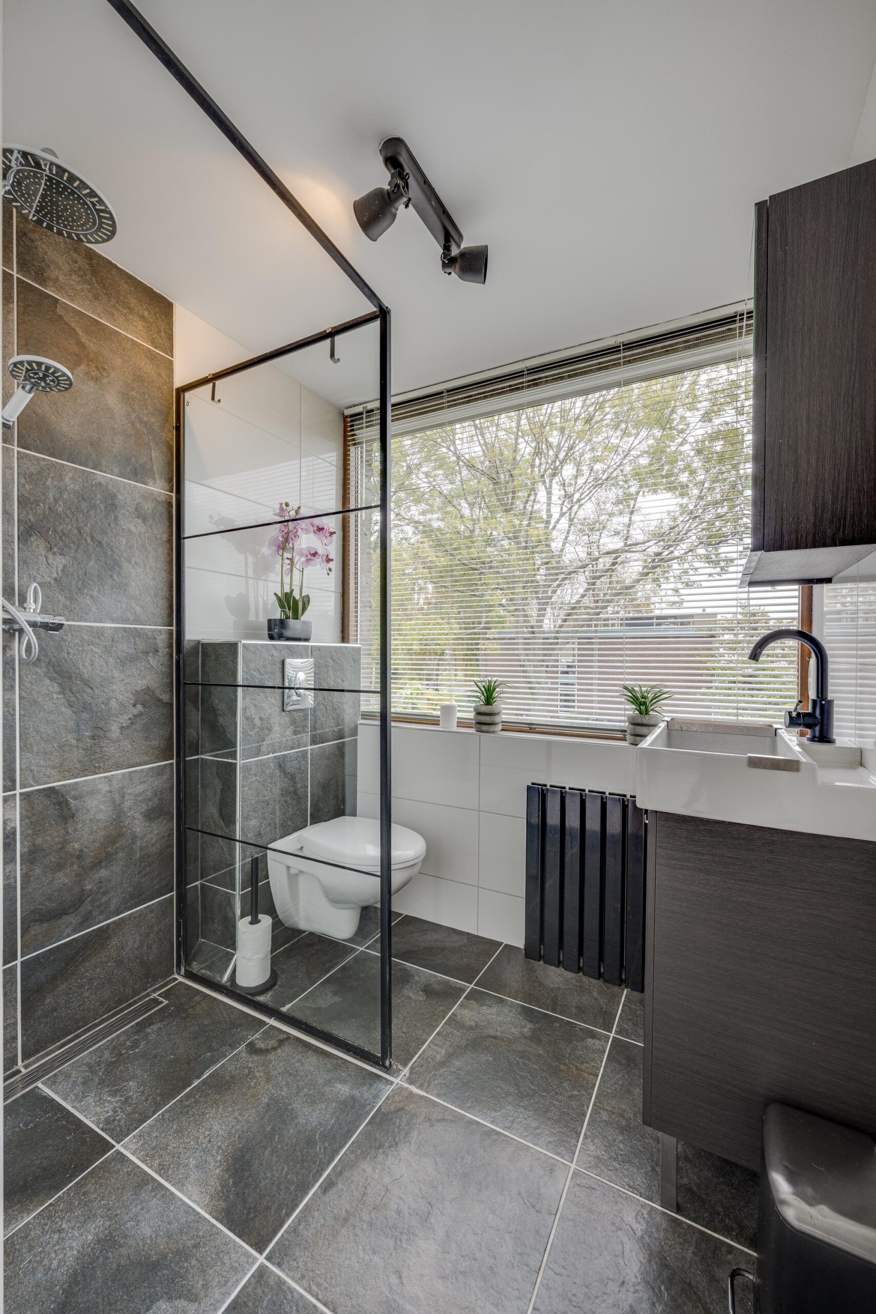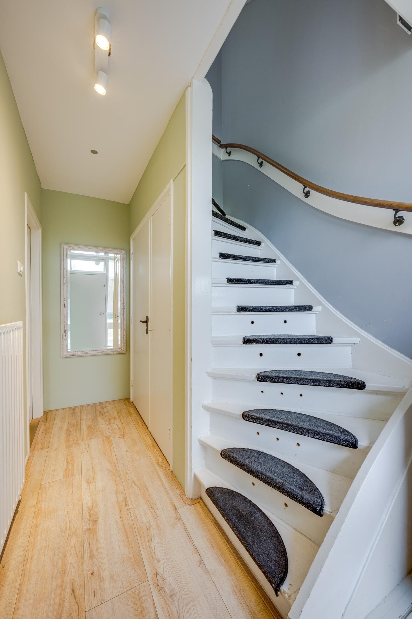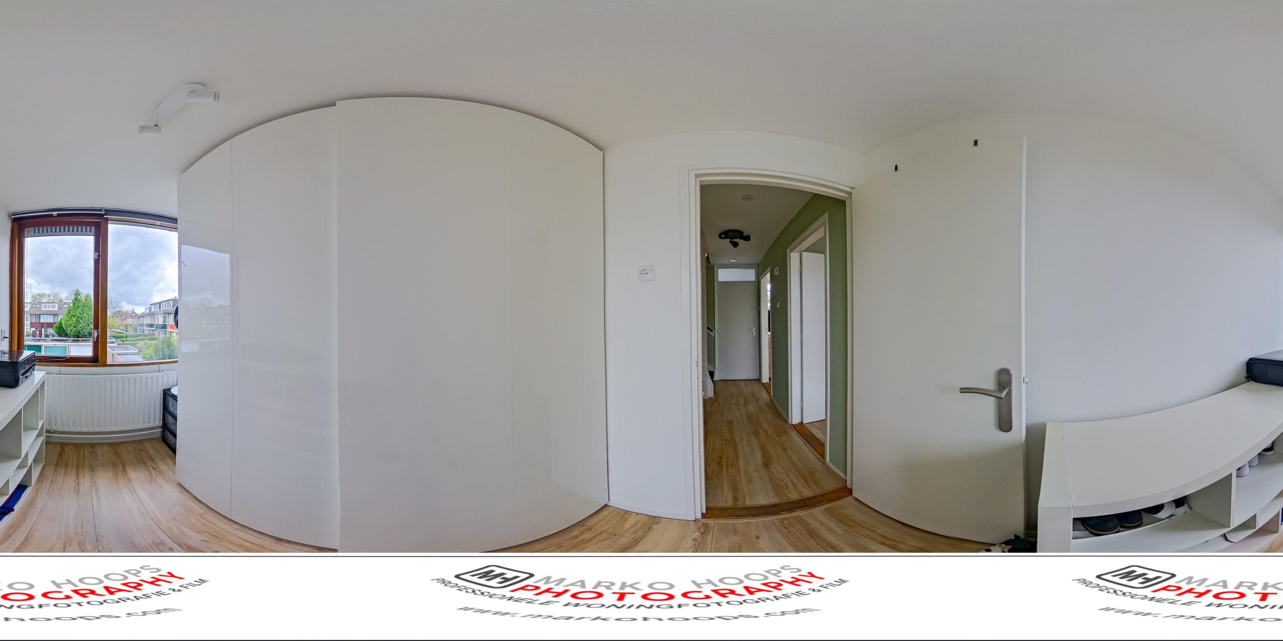 Eerste verdieping: Overloop met diverse deuren naar maar liefst drie slaapkamers. Slaapkamer een en twee kijken uit op de achtertuin, en slaapkamer drie kijkt uit op de voortuin. De moderne badkamer is voorzien van een toilet, was meubel en inloopdouche. Trap naar de tweede verdieping.
