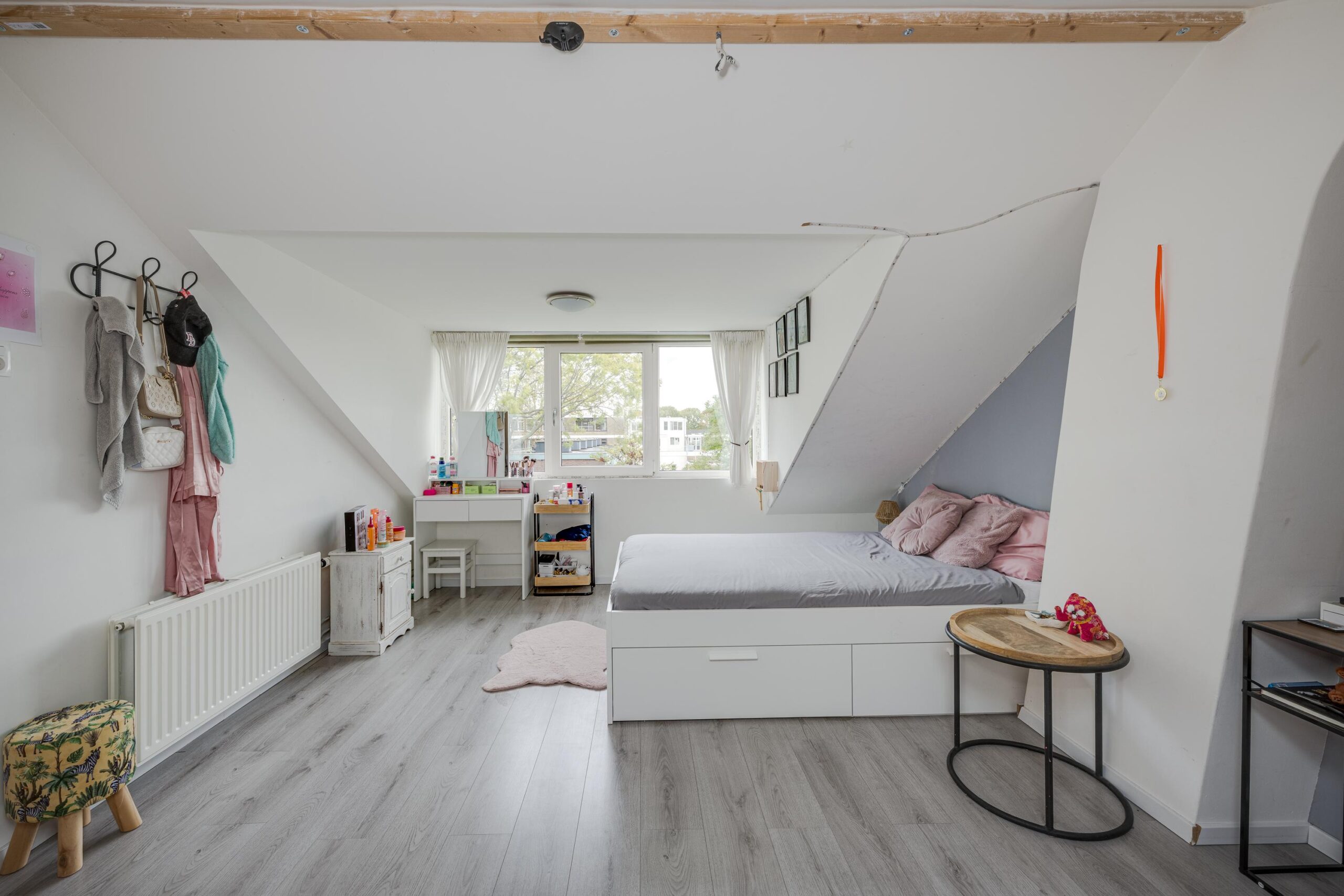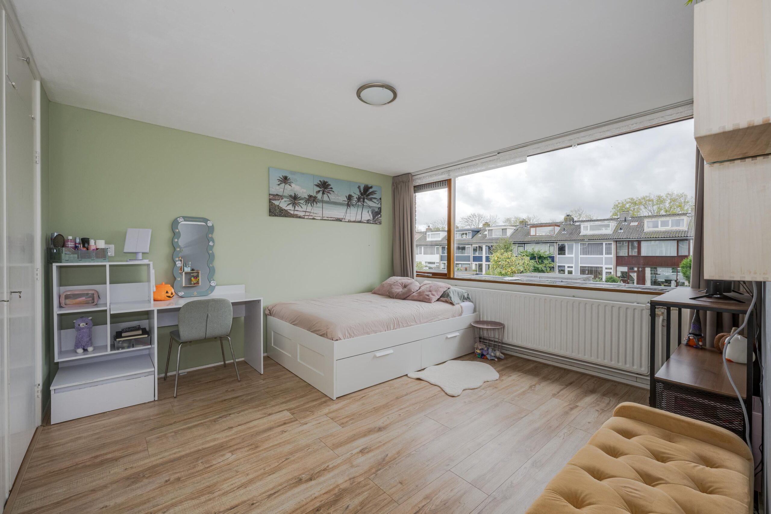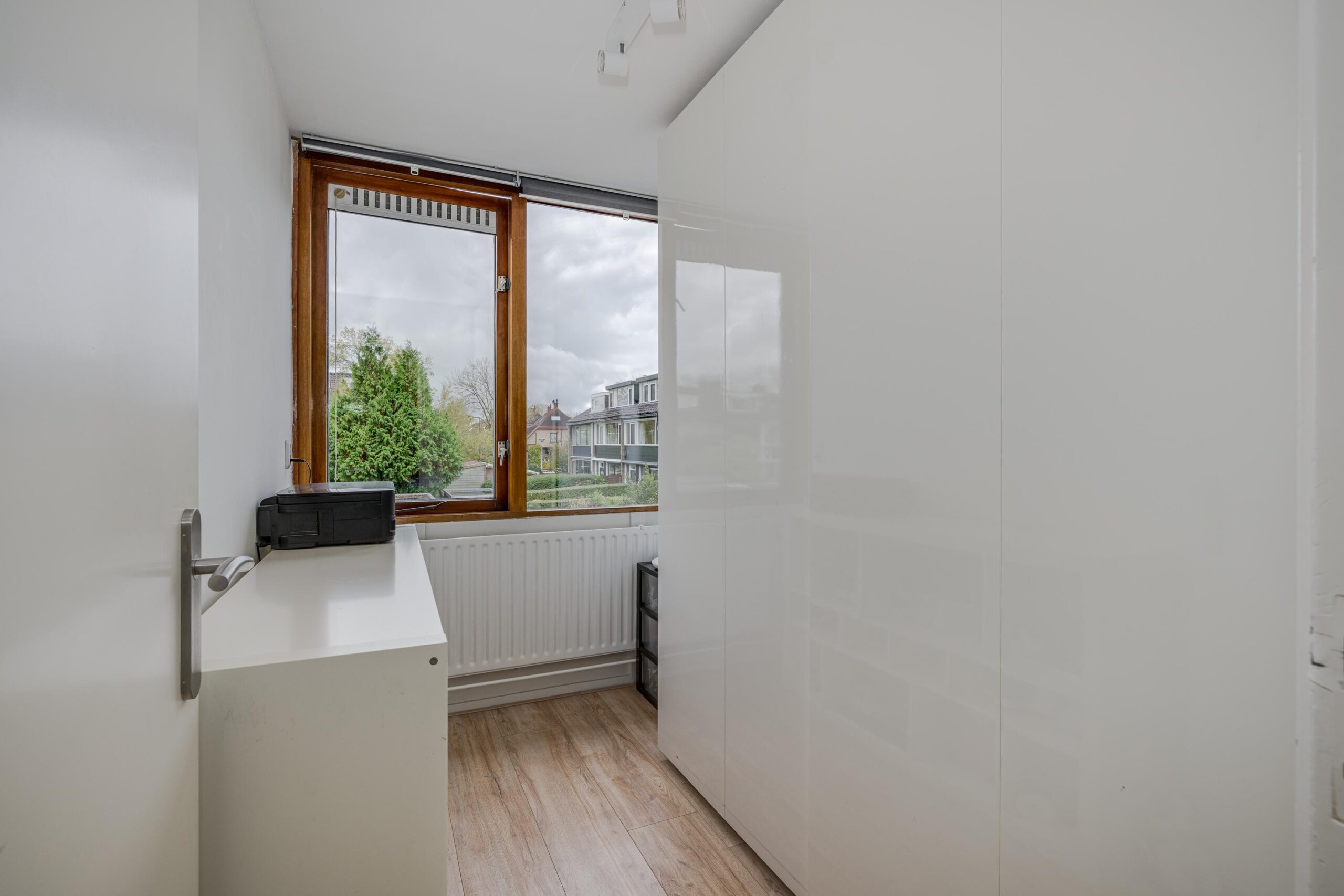 Eerste verdieping: Overloop met diverse deuren naar maar liefst drie slaapkamers. Slaapkamer een en twee kijken uit op de achtertuin, en slaapkamer drie kijkt uit op de voortuin. De moderne badkamer is voorzien van een toilet, was meubel en inloopdouche. Trap naar de tweede verdieping.