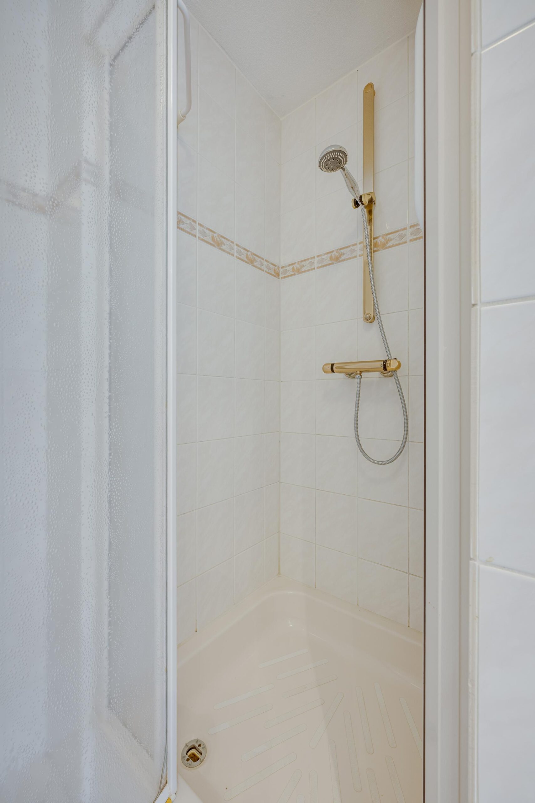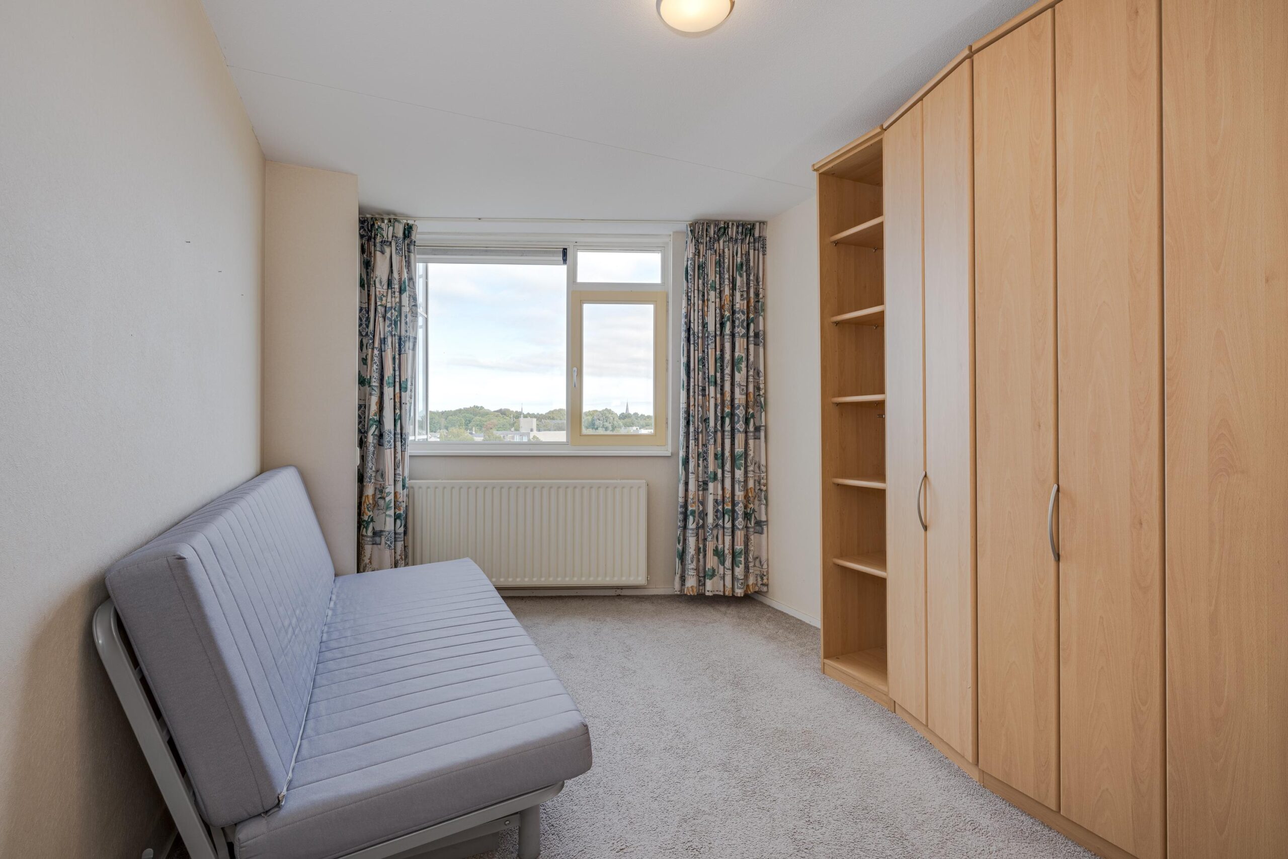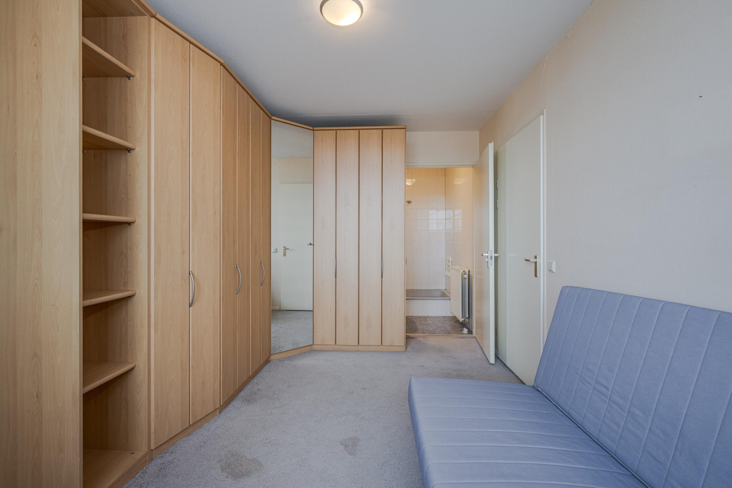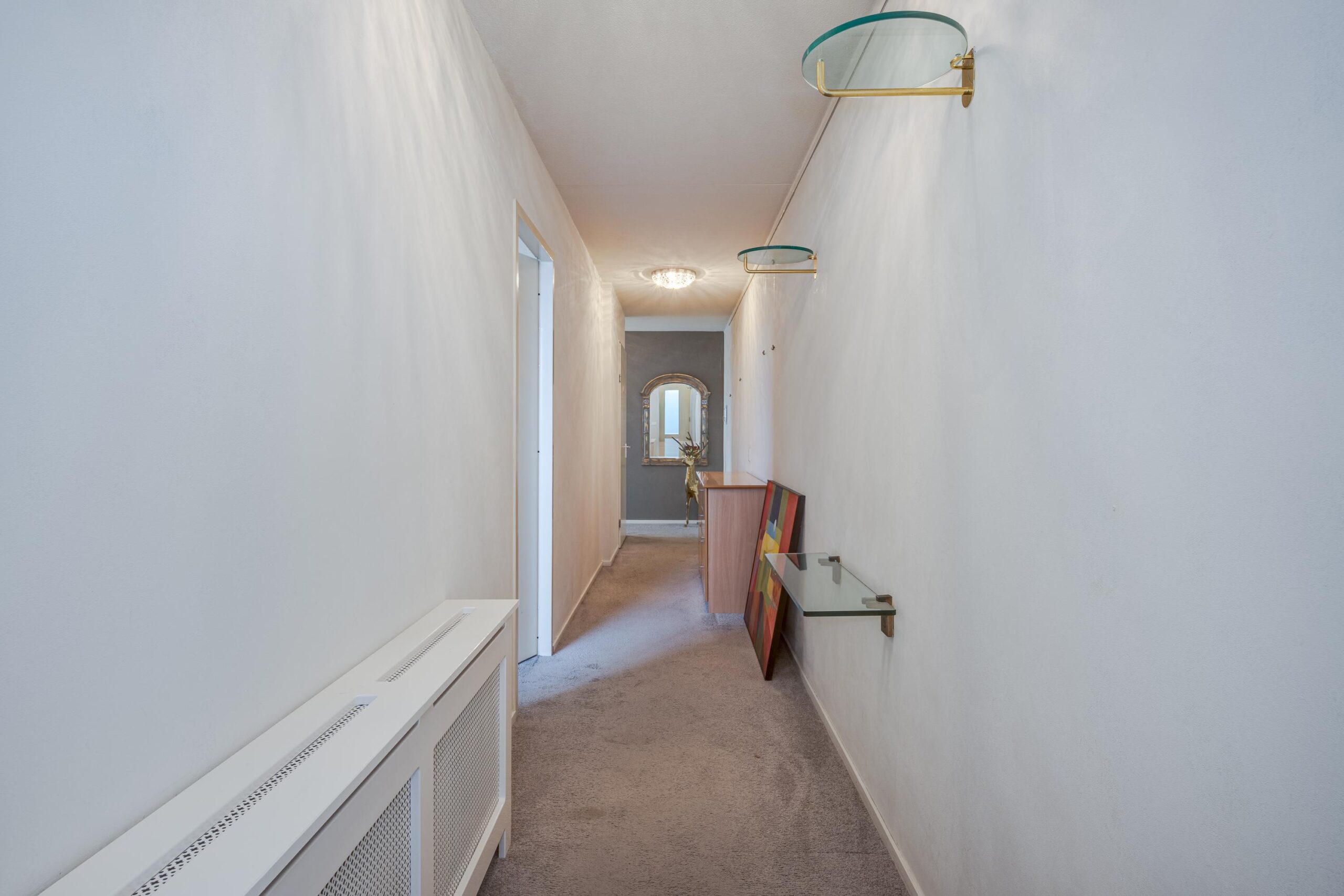 Indeling: Deur appartementencomplex, trap of lift naar 5e verdieping. Deur appartement. Deur links naar kleinere slaapkamer met (eenvoudige) badkamer, toilet in de hal, links de hoek om. Kast en deur rechts naar mooie slaapkamer met badkamer. Deur naar riante woonkamer met halfopen keuken.