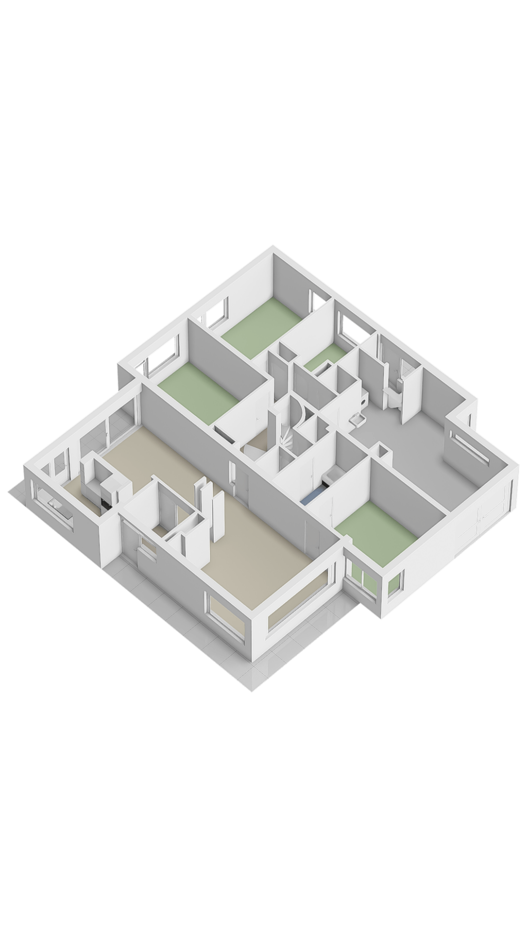 Begane grond: de woning heeft drie entrees met de hoofdentree aan de straatkant (west). Hoofd entree woning, hal met garderobe, entree woonkamer met half open keuken. Schuifdeur in de woonkamer naar slaapkamer en badkamer. Deur naar hal met doucheruimte, toilet en prachtige rondvormige trap naar het souterrain met drie slaapkamers, 2e toilet en en een grote garage met achteringang.