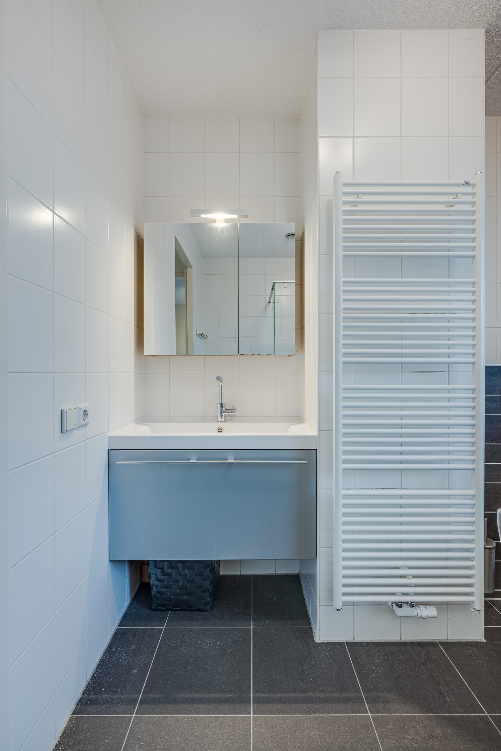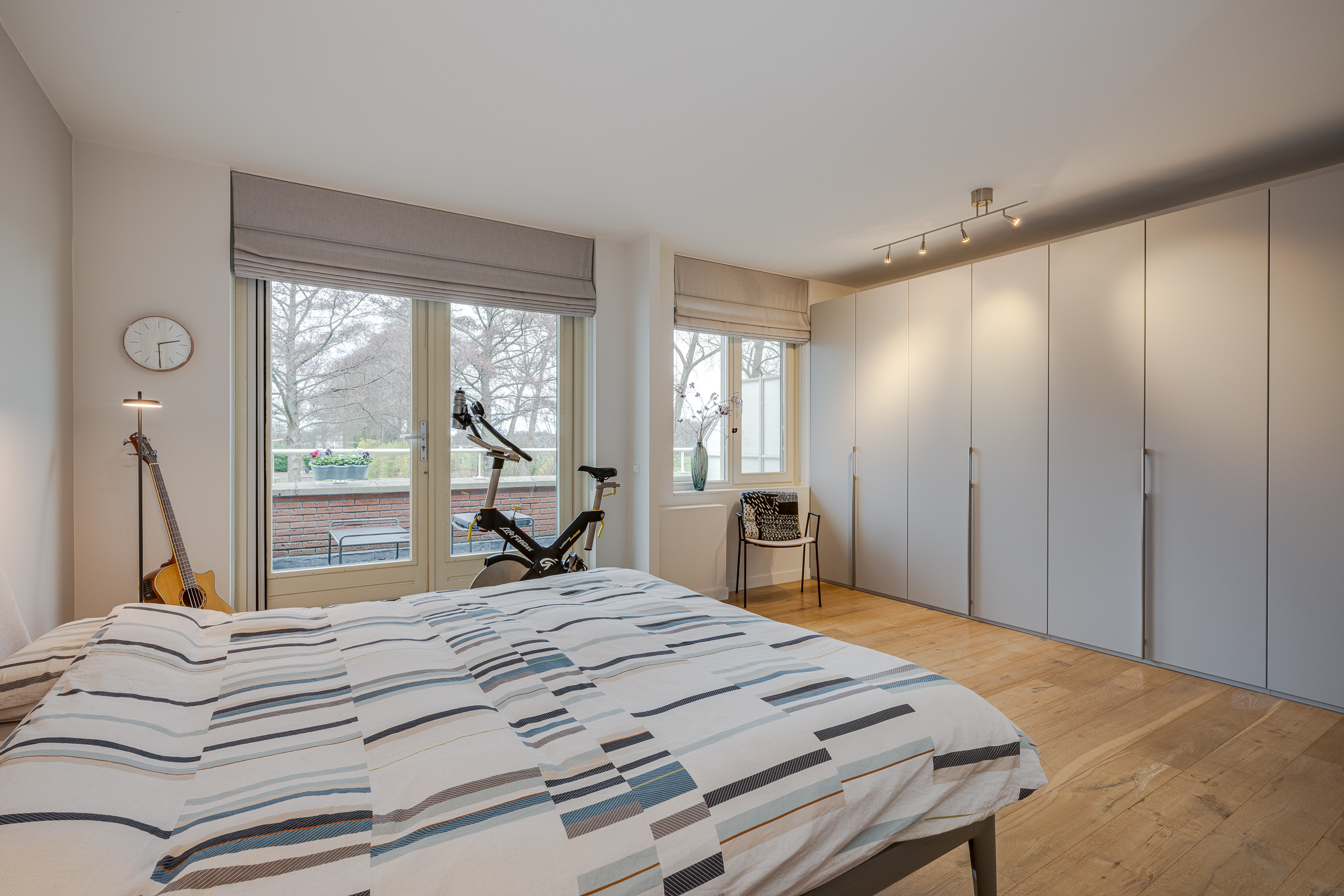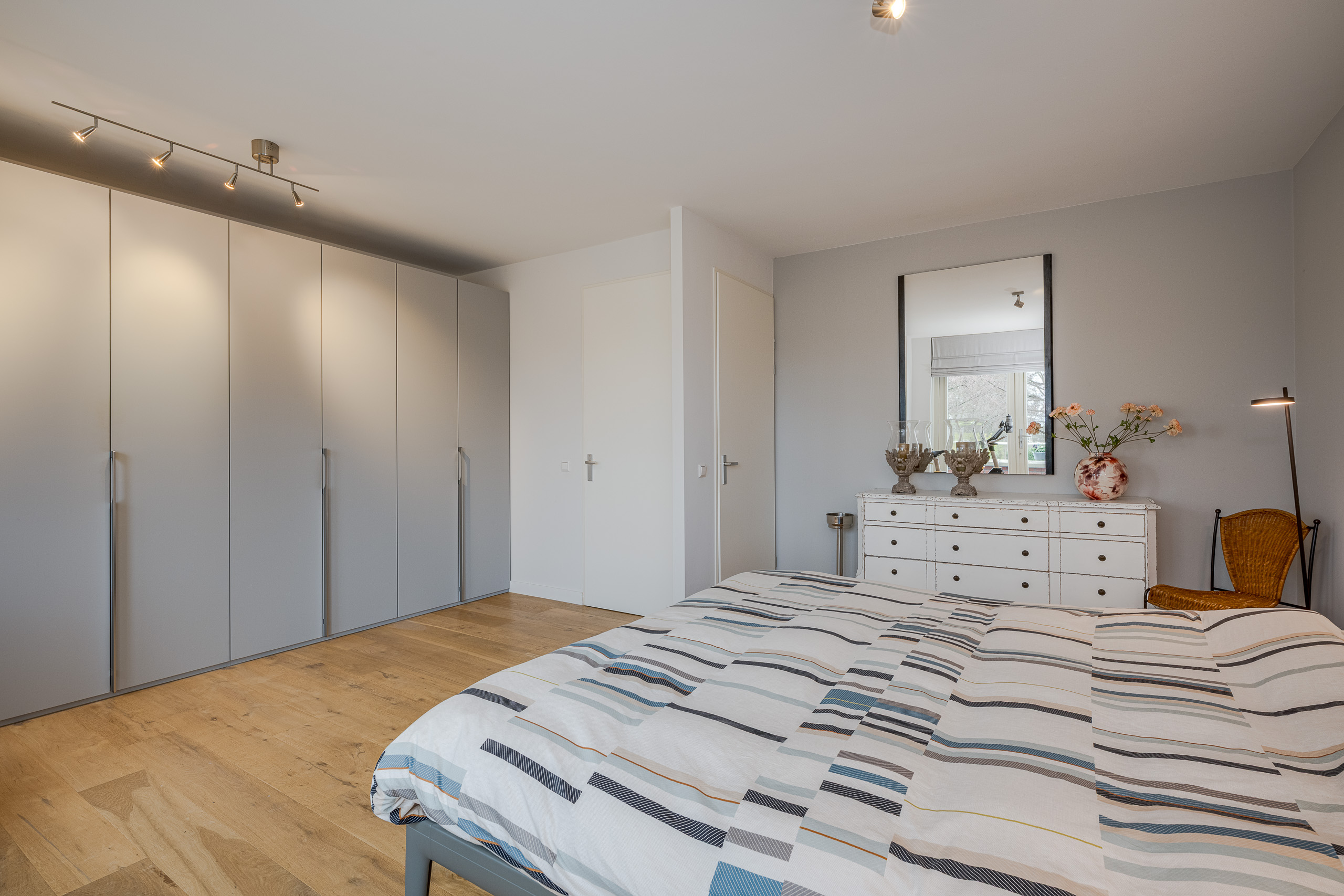 Eerste verdieping: een extra grote slaapkamer (voorheen twee kamers) met openslaande deuren naar het dakterras. Een tweede slaapkamer, een nette badkamer met ruime inloop-douche, wastafelmeubel en toilet. Trap naar tweede verdieping.