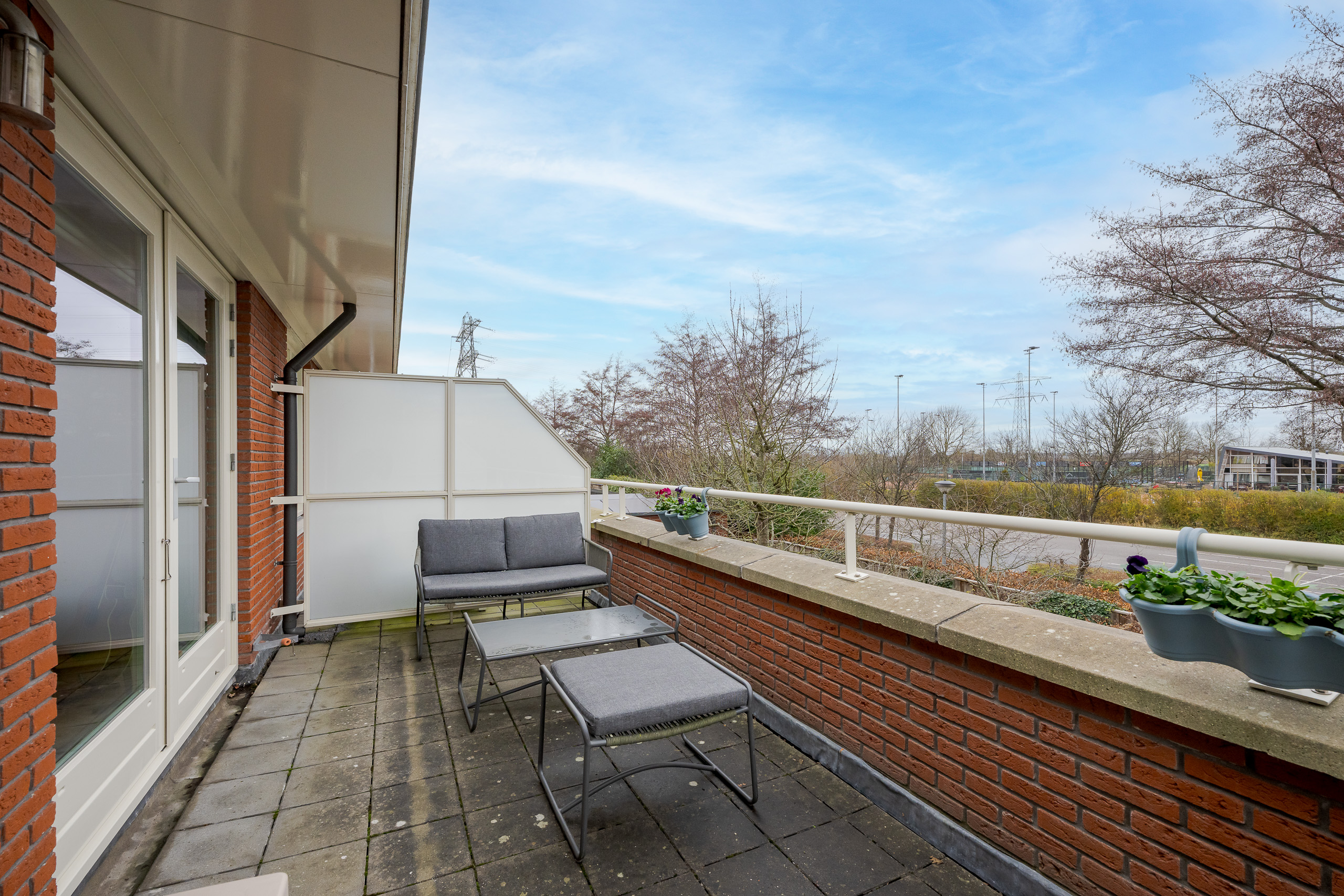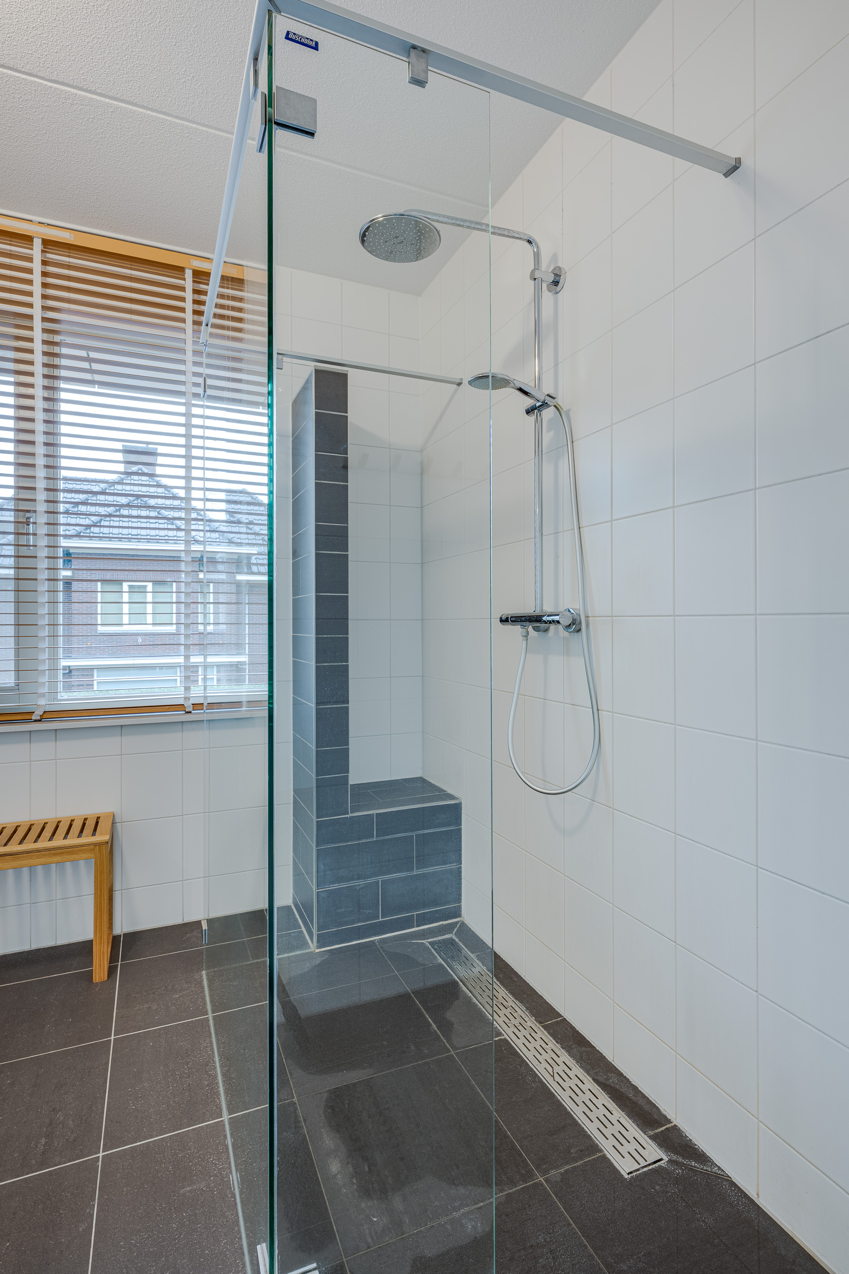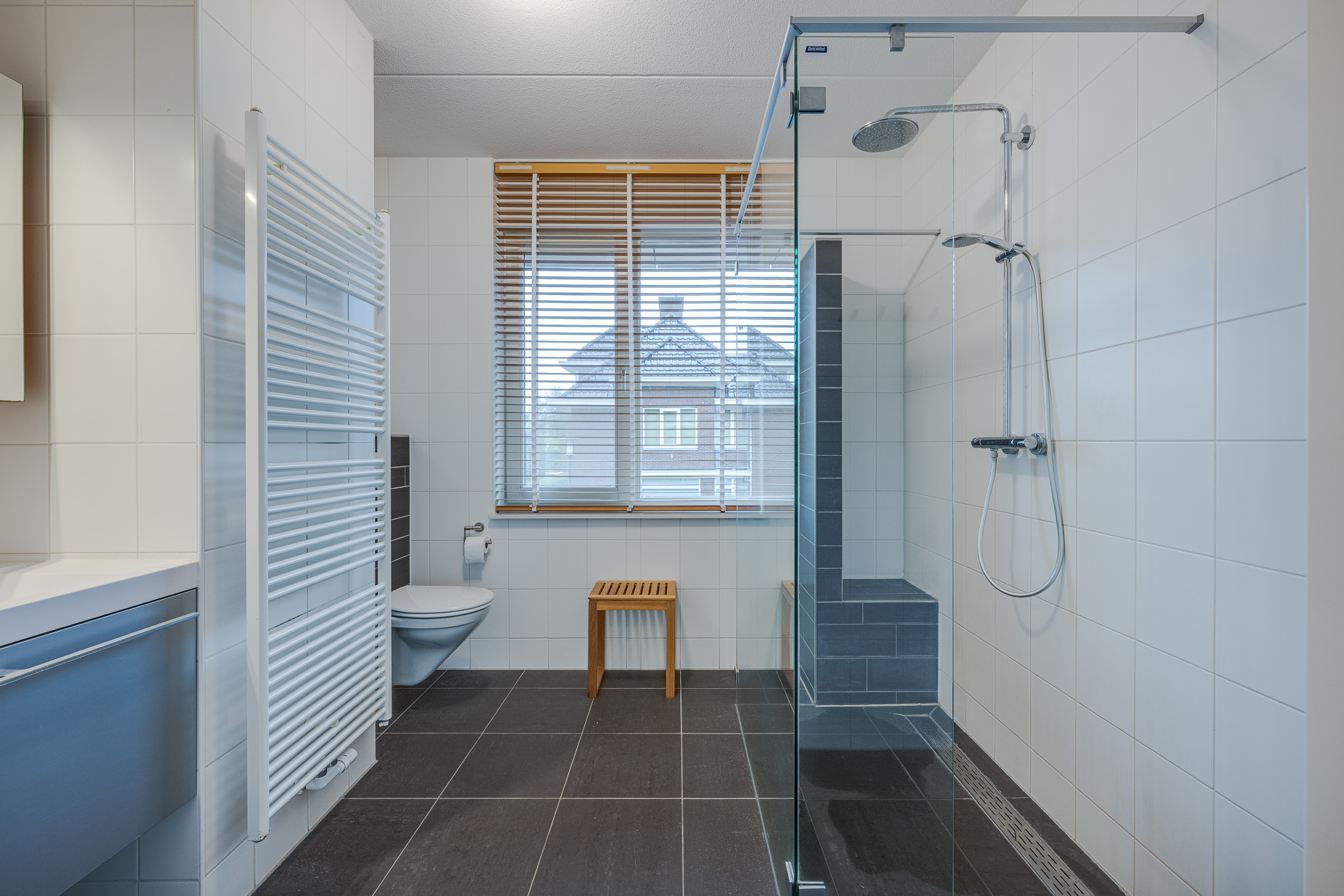 Eerste verdieping: een extra grote slaapkamer (voorheen twee kamers) met openslaande deuren naar het dakterras. Een tweede slaapkamer, een nette badkamer met ruime inloop-douche, wastafelmeubel en toilet. Trap naar tweede verdieping.