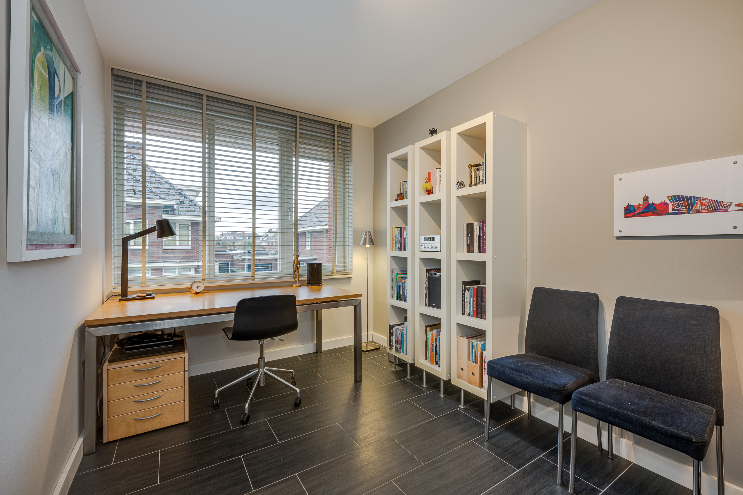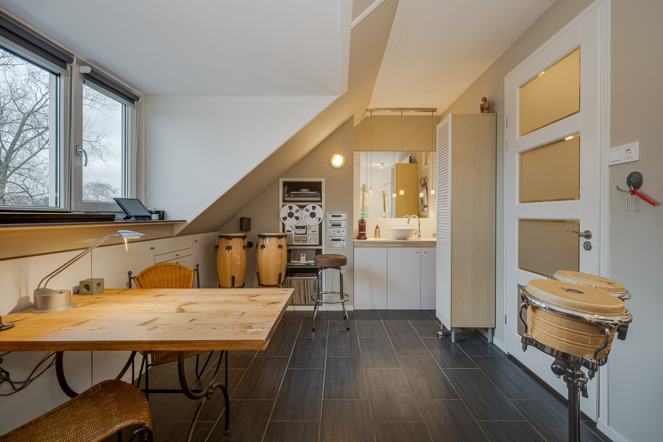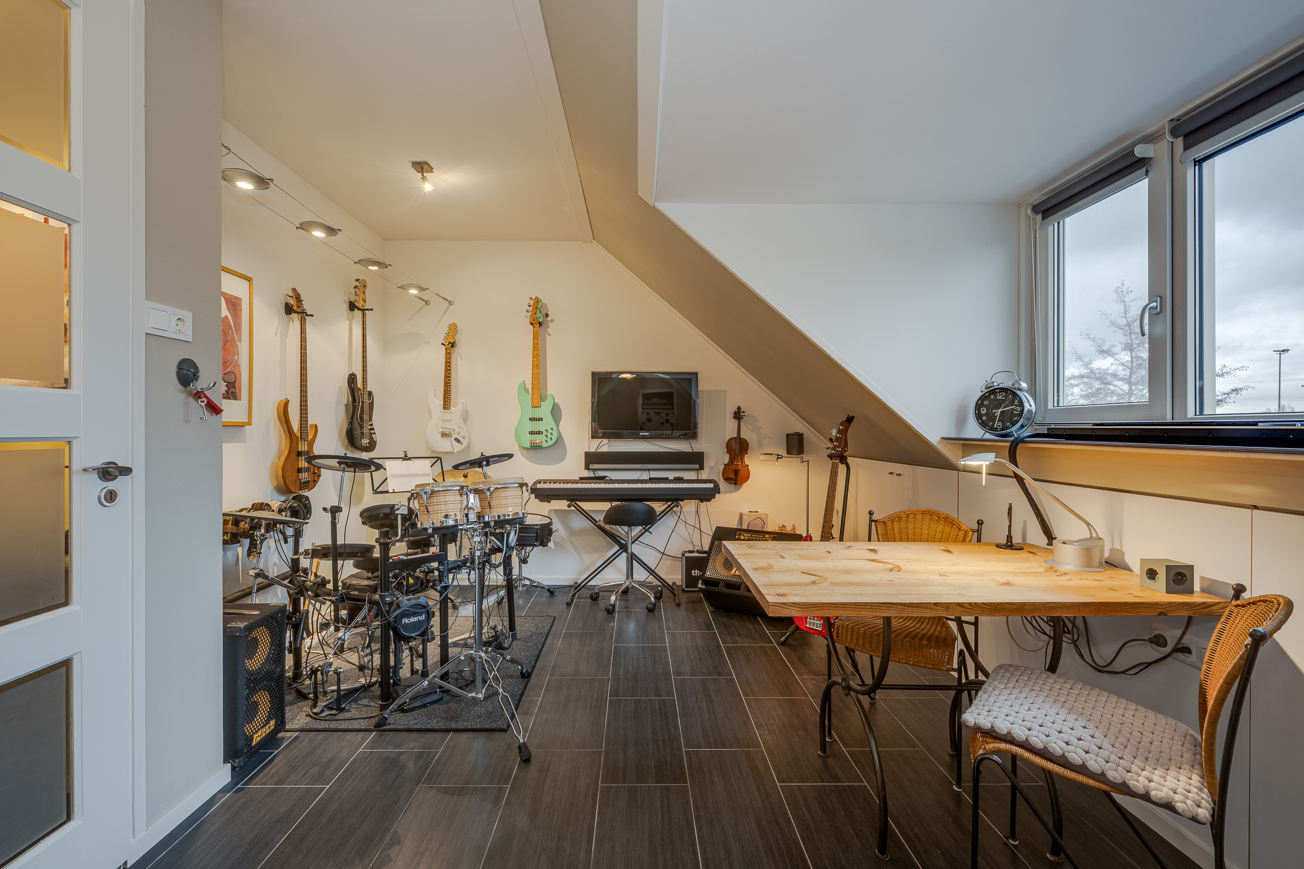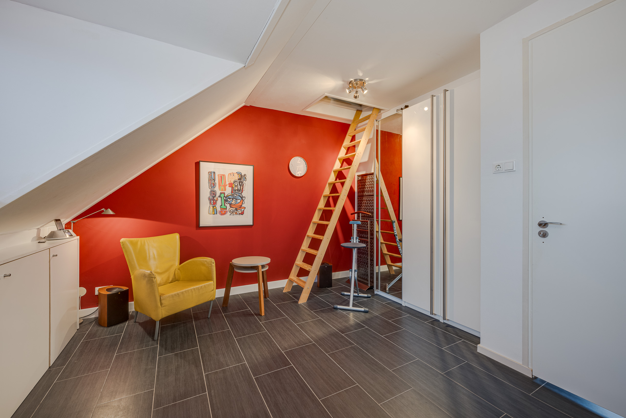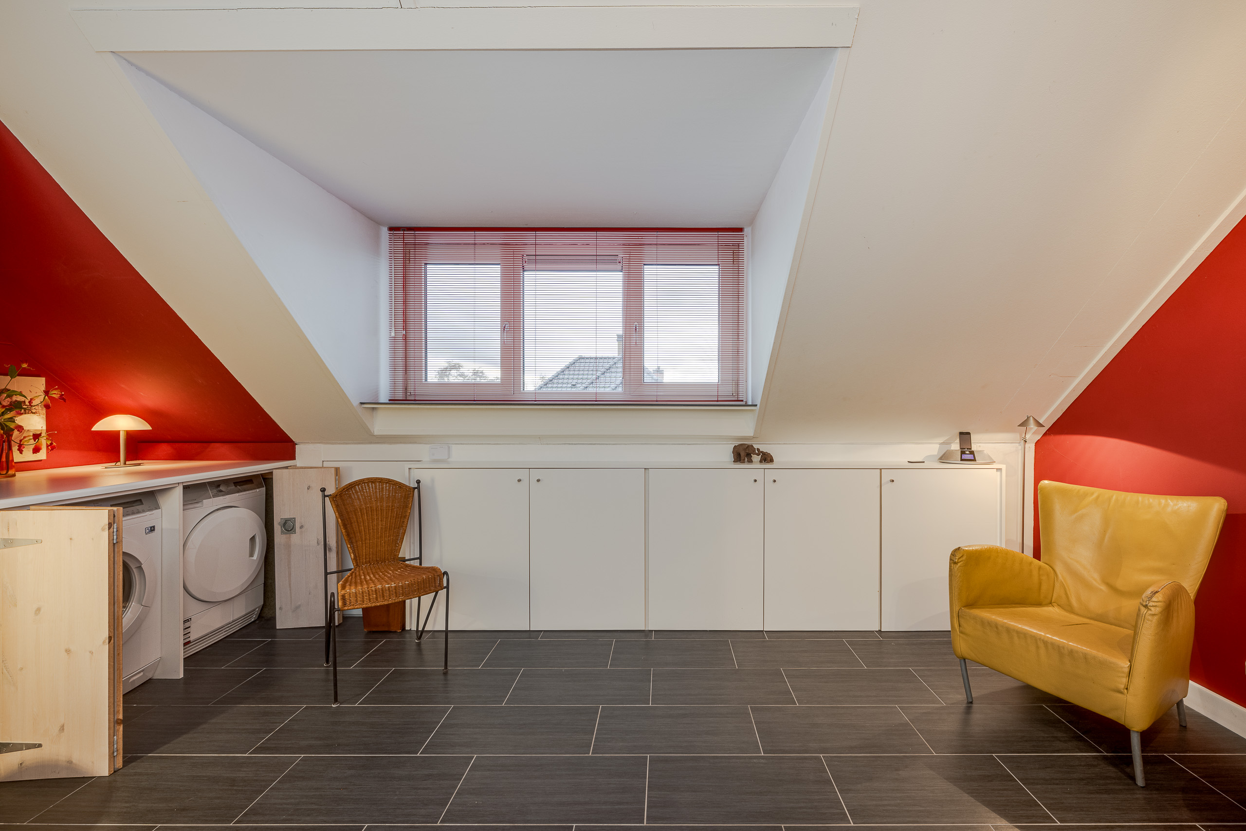 Tweede verdieping: overloop met deuren naar nog twee slaapkamers waarvan één met wastafel. Beide kamers hebben een dakkapel. De knieschotten over de gehele breedte van de kamers zijn geïsoleerd en hierin is kastruimte op maat gemaakt. In slaapkamer vier: wasmachine- en drogeraansluiting, vaste trap naar de zolder. HR CV- combiketel (Intergas) en mechanische ventilatie.