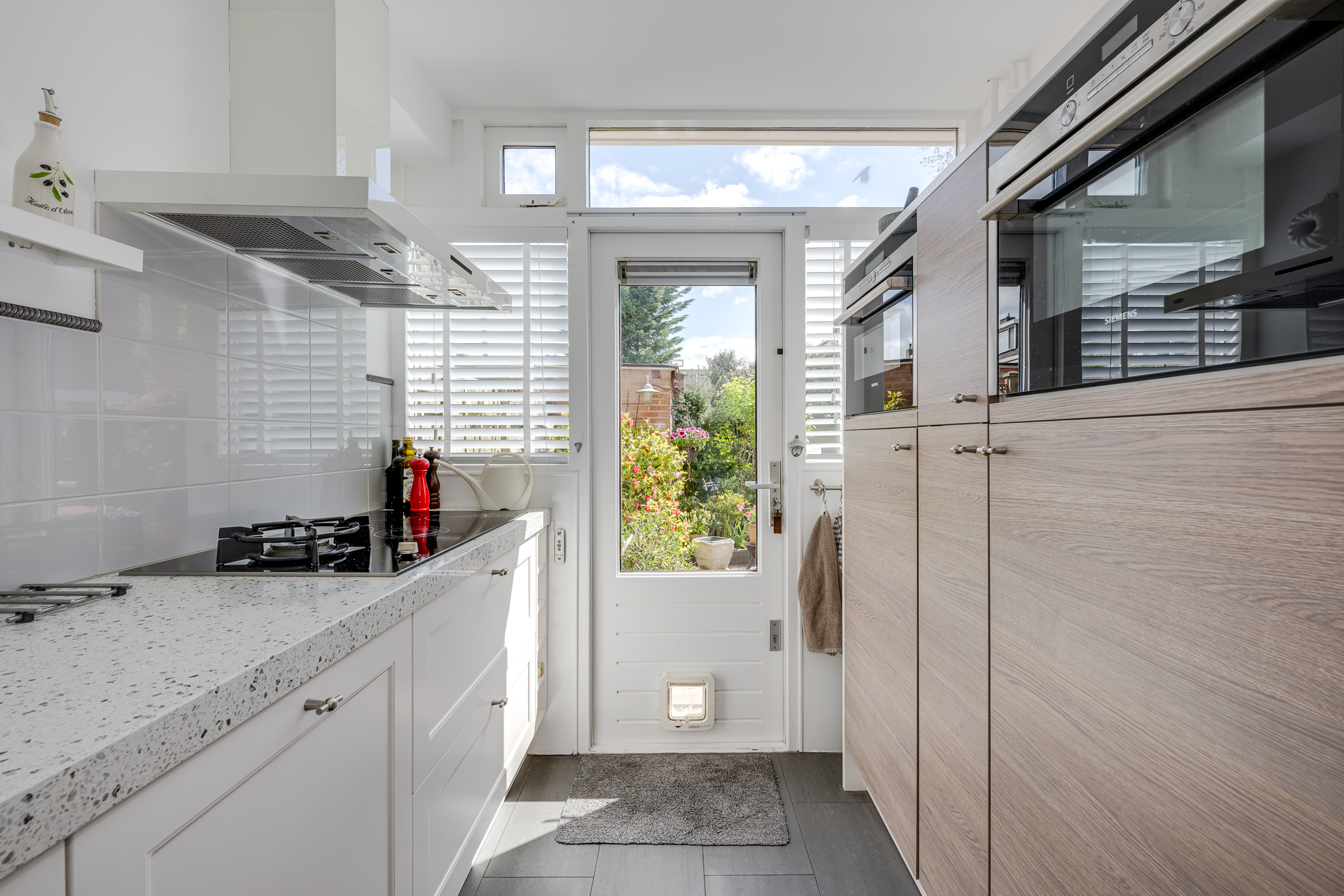 voortuin, entree woning, vestibule met meterkast, hal met toilet, trapkast en trap naar 1e verdieping, entree woonkamer met gashaard en schuifpui naar de zonnige achtertuin. Keuken voorzien van diverse inbouwapparatuur en deur naar de zonnige achtertuin.