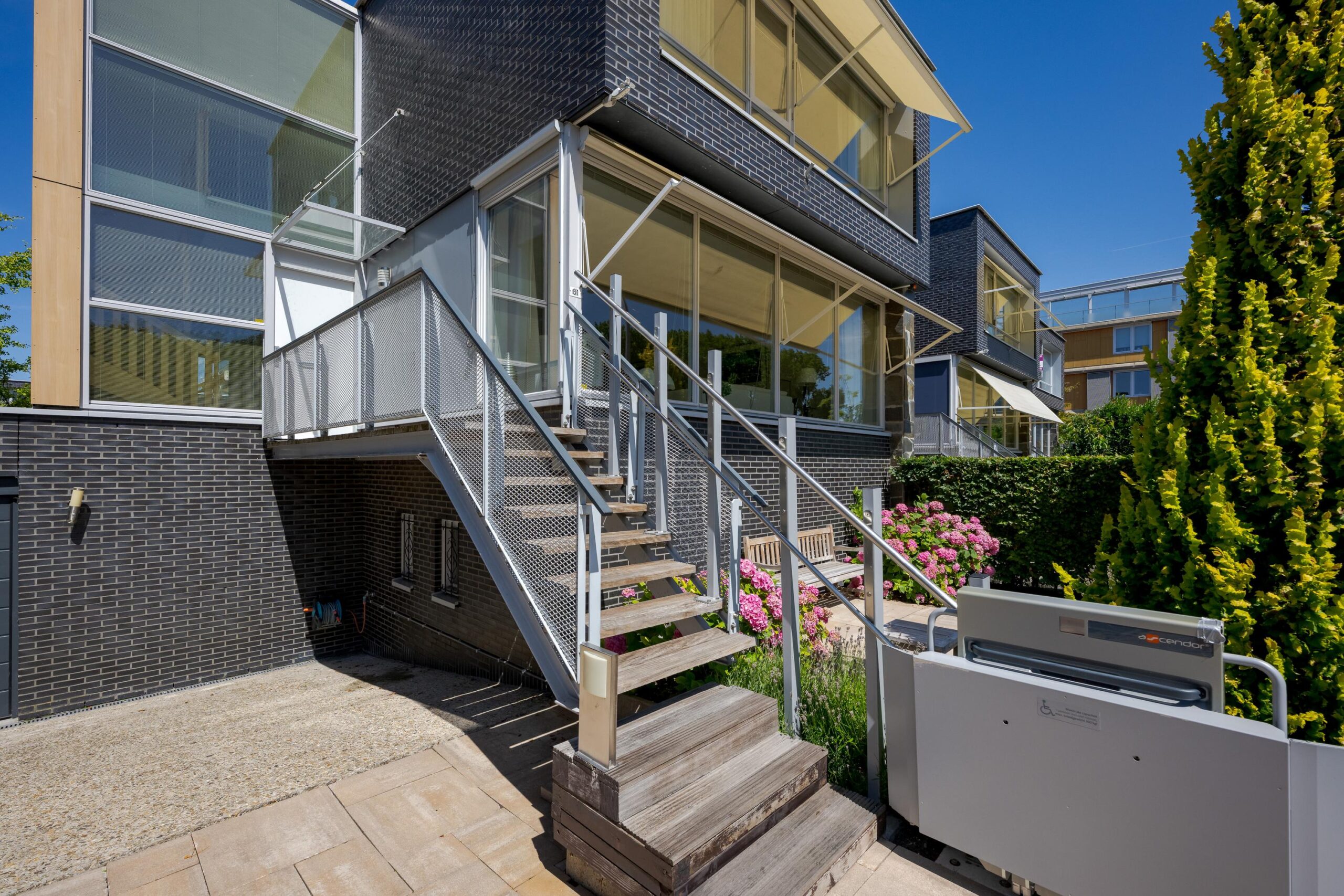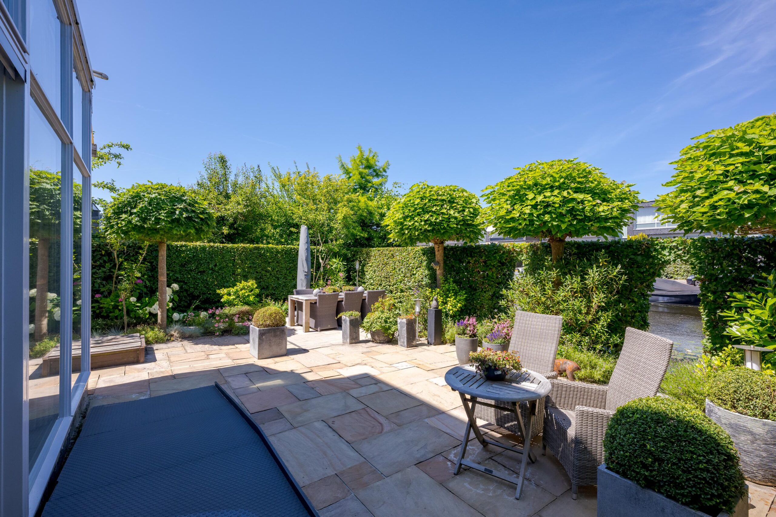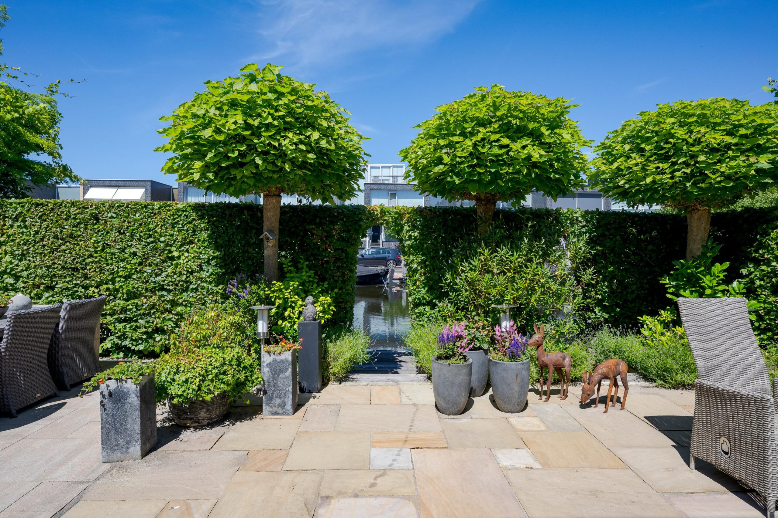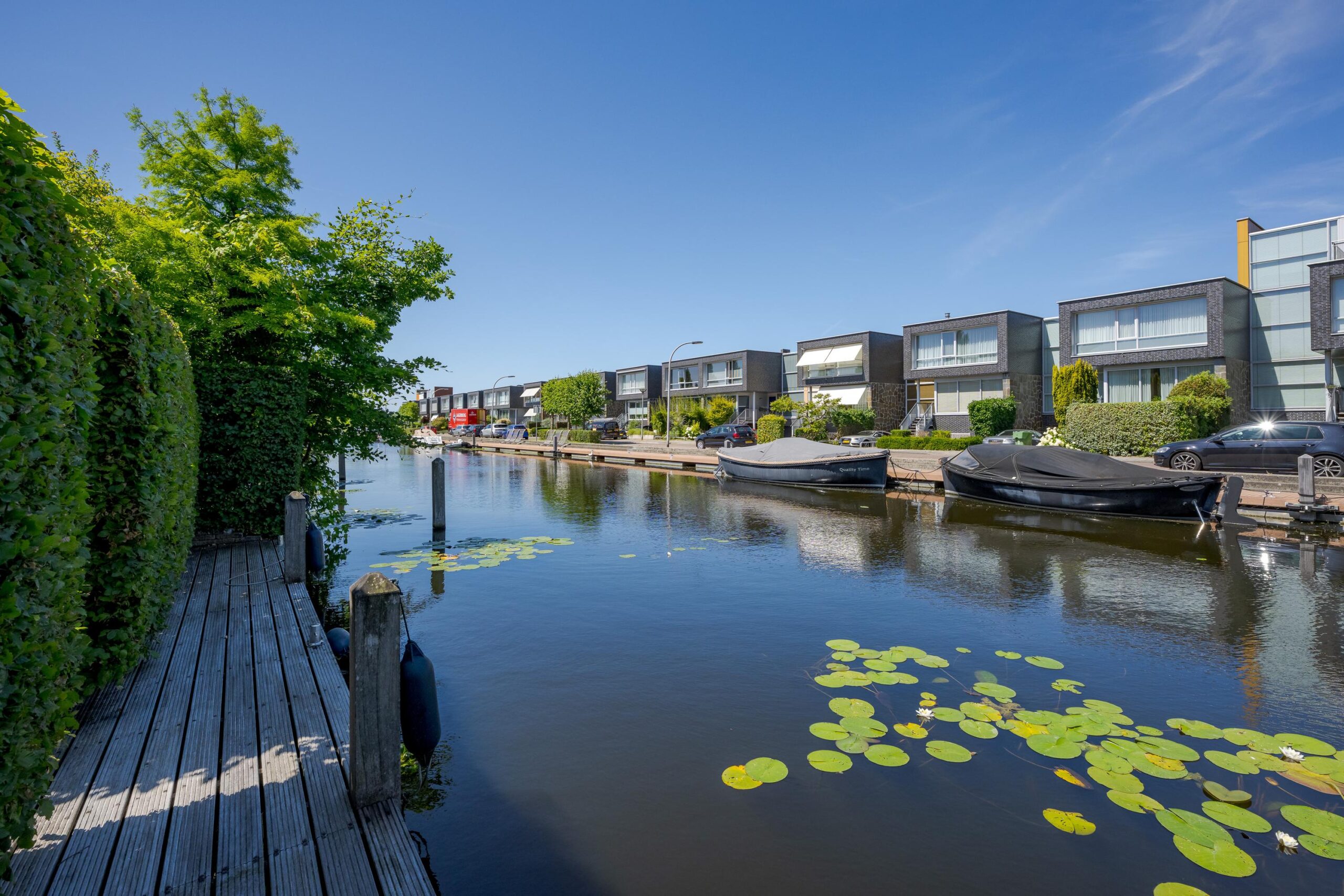 De achtertuin is direct gelegen aan open vaarwater met eigen steiger. Directe toegang naar doorgaand vaarwater de “Vliet”. Dus met de sloep naar bijvoorbeeld de historische Leidse binnenstad of rechtsaf richting Leidschendam en heerlijk lunchen aan de Sluis.