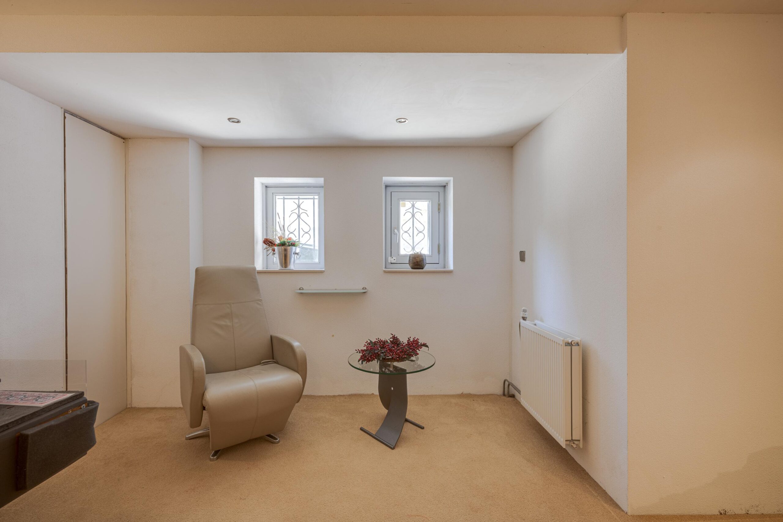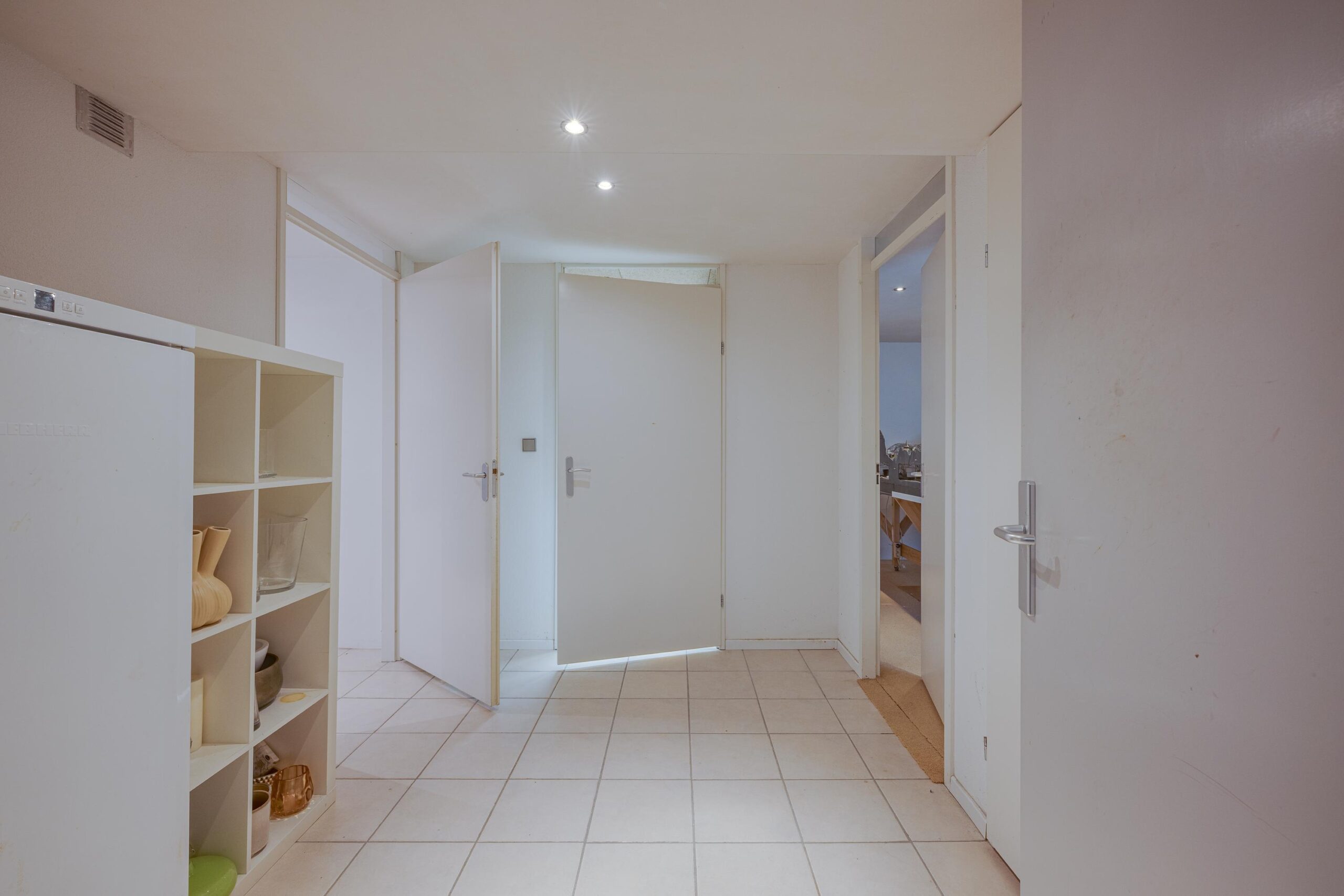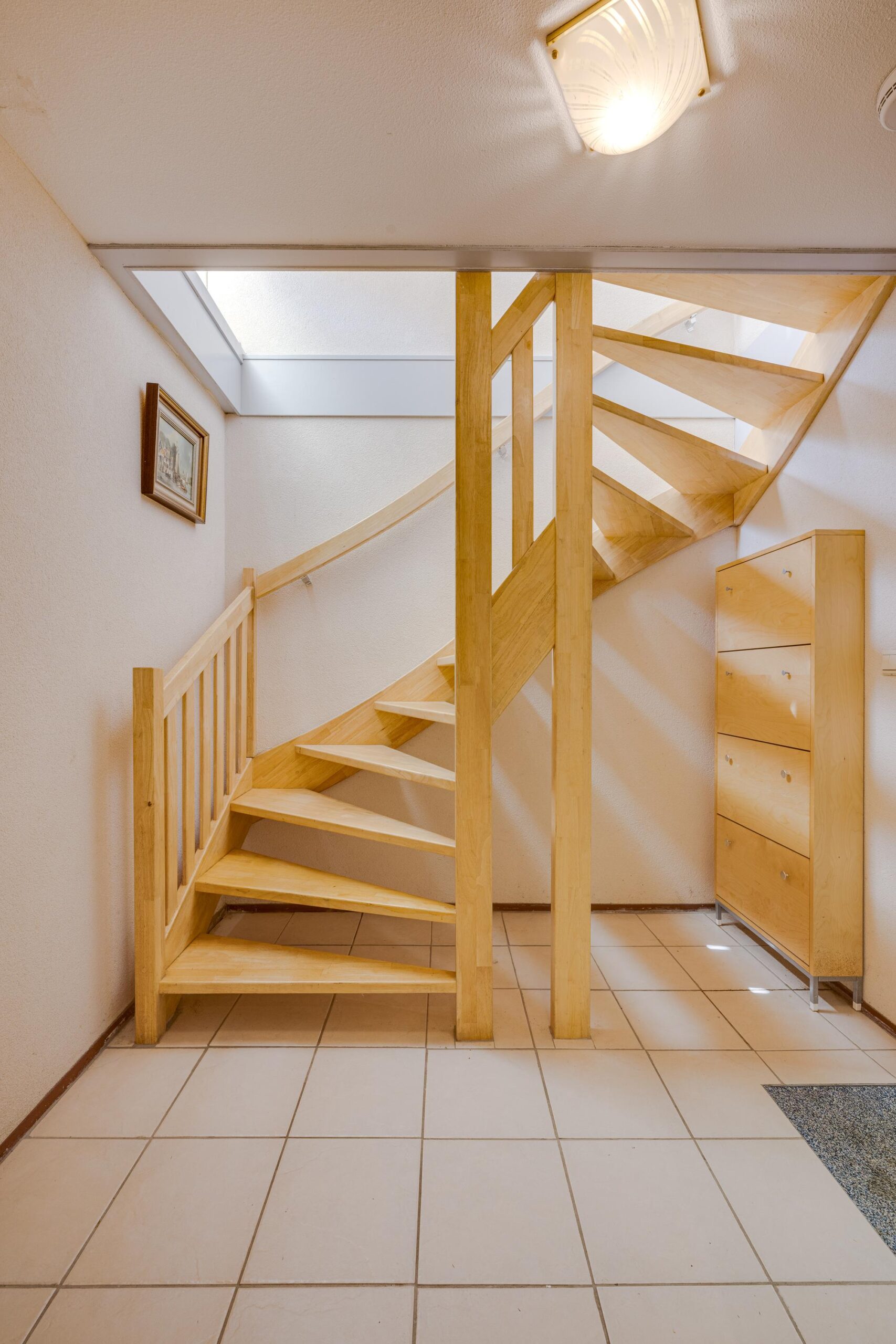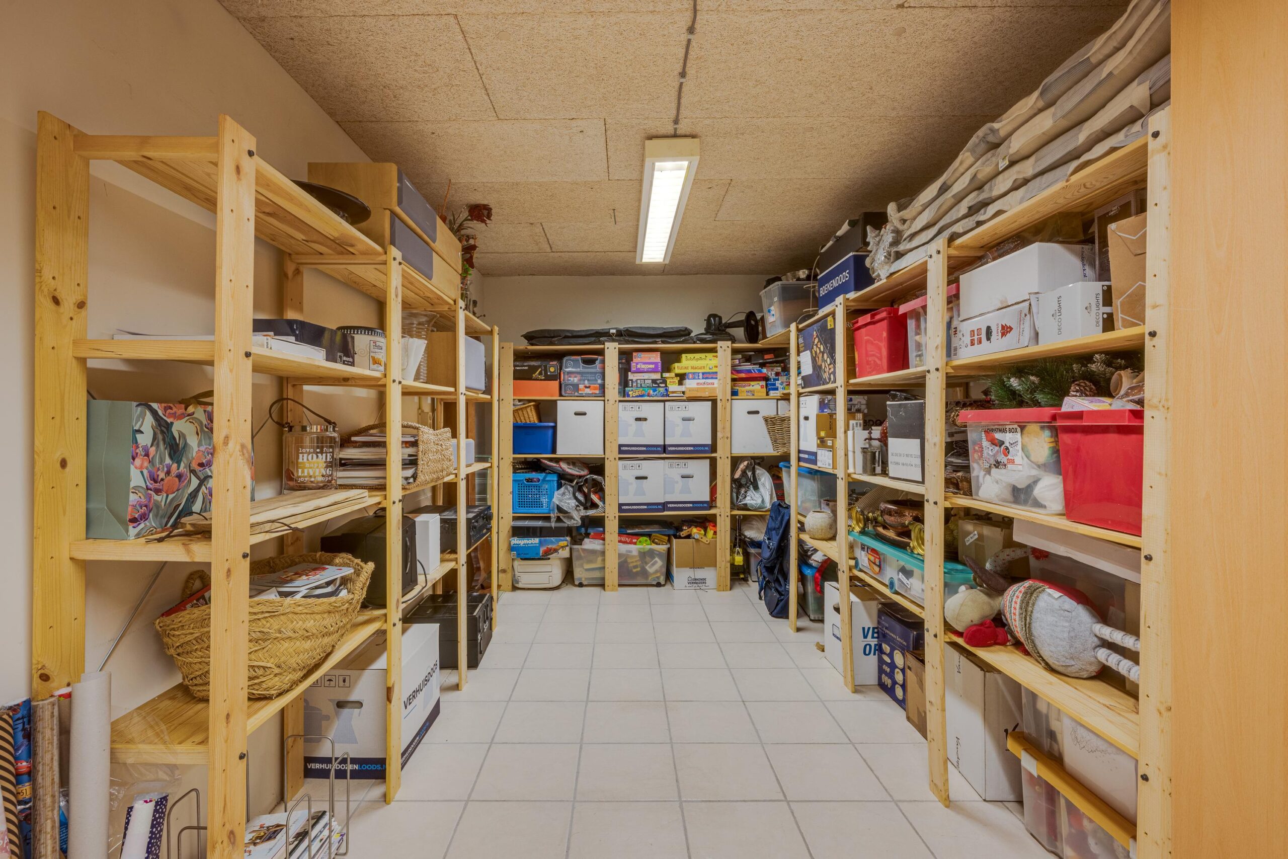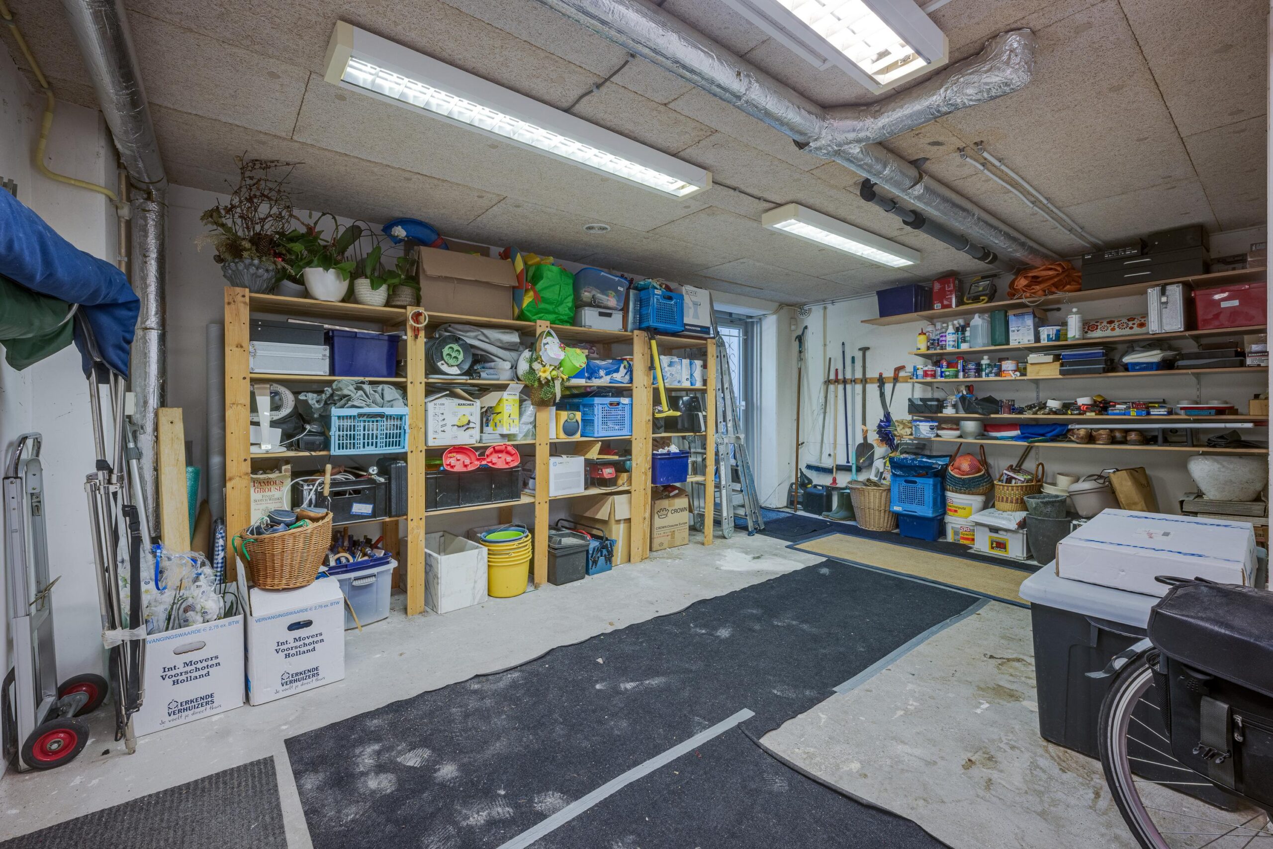 Inpandige garage met ruimte voor auto, fietsen etc en met eigen oprit die ruimte biedt voor een auto. Vanuit de garage is de achtertuin bereikbaar. Overloop met trap naar de begane grond en meterkast. Deur naar gang die toegang biedt tot de ruime hobbykamer, ruime berging en extra badkamer.