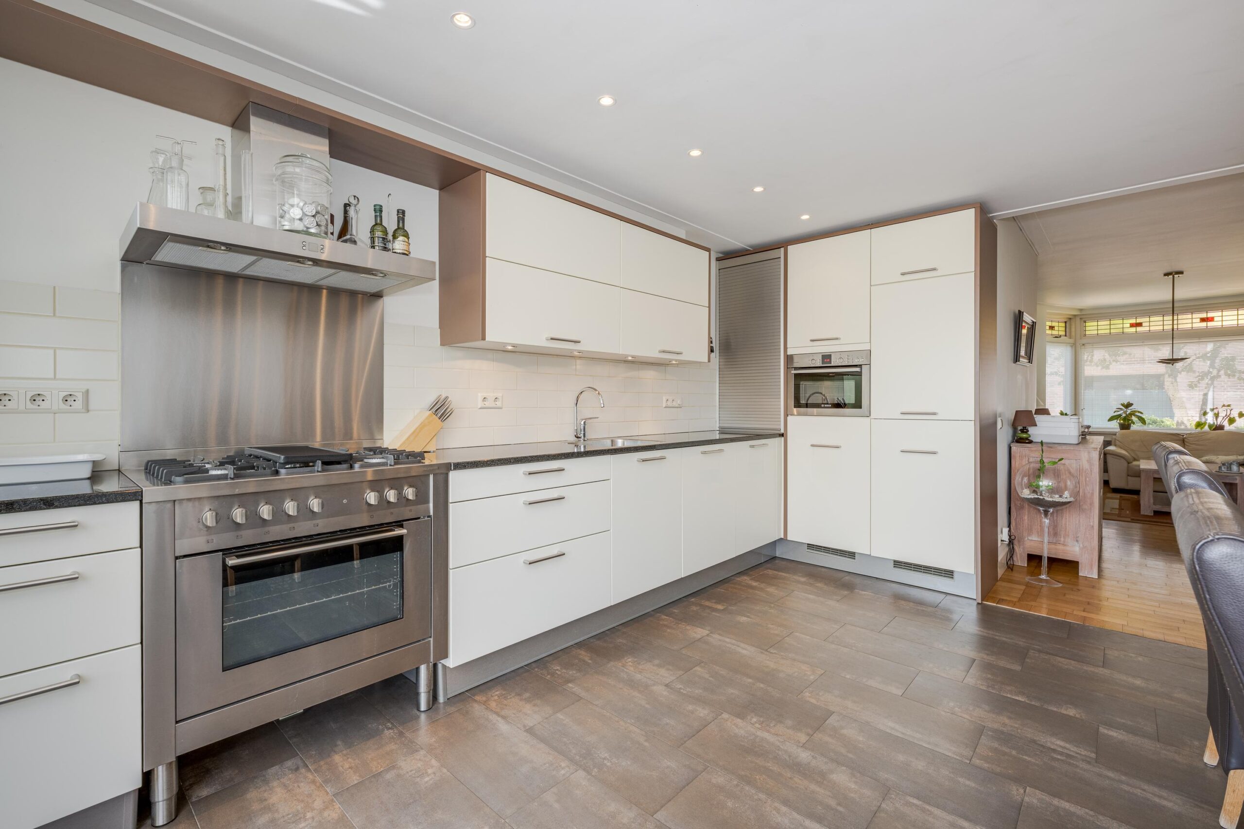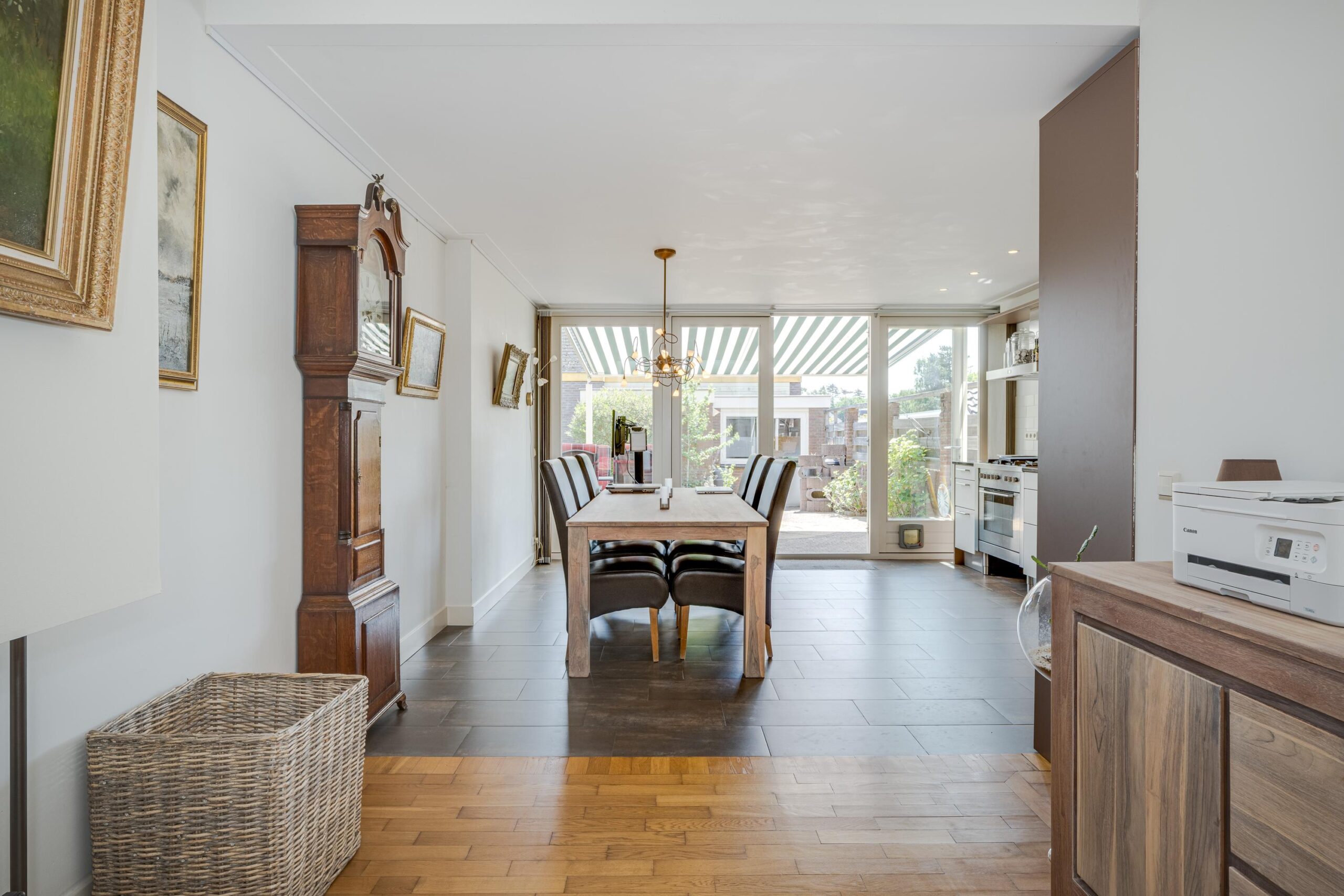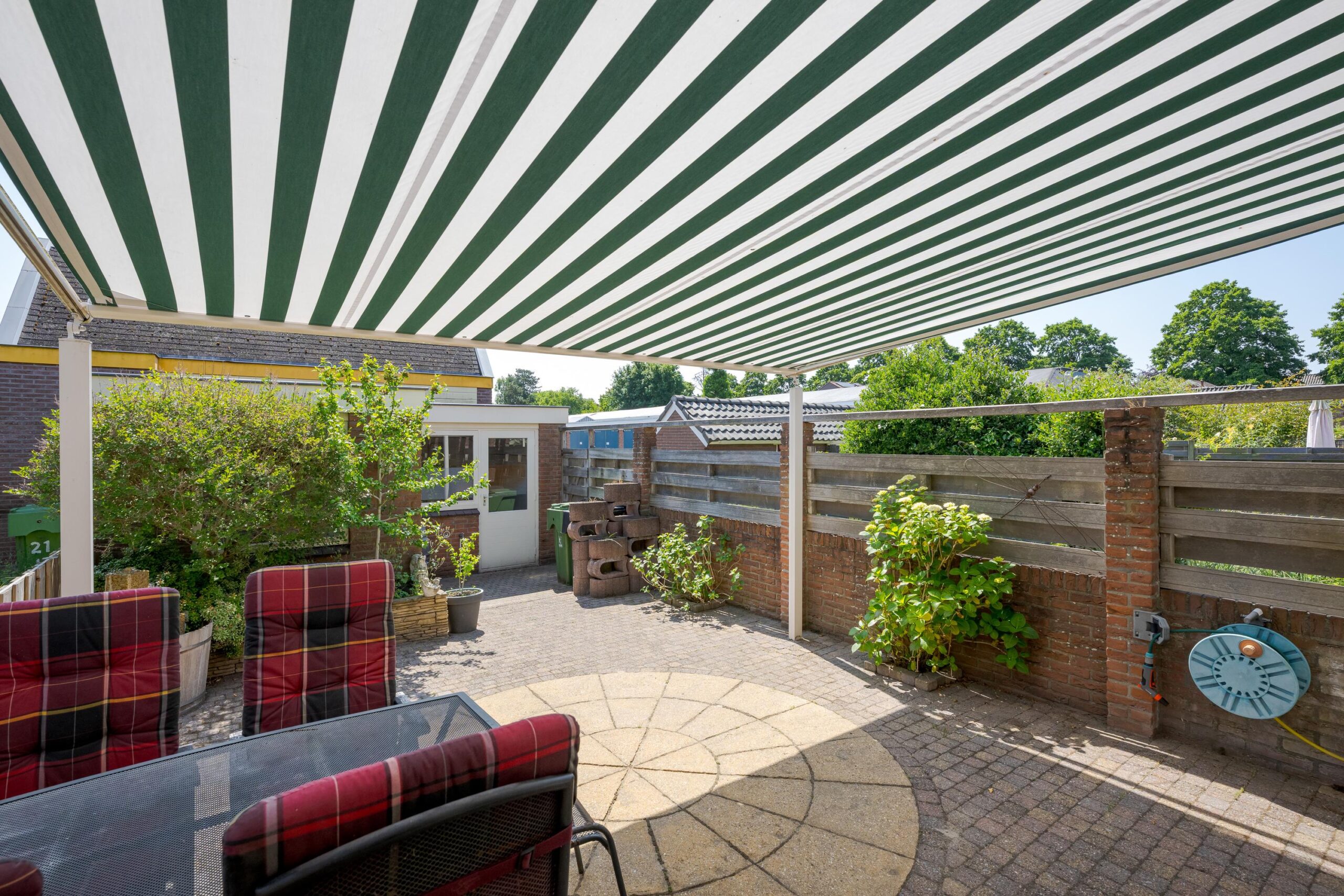 Voortuin, entree woning, hal met meterkast en toilet, deur naar woonkamer, eetkamer en fraaie keuken. De woonkeuken is voorzien van diverse inbouwapparatuur. Openslaande deuren naar de zonnige achtertuin. Stenen berging en GARAGE.