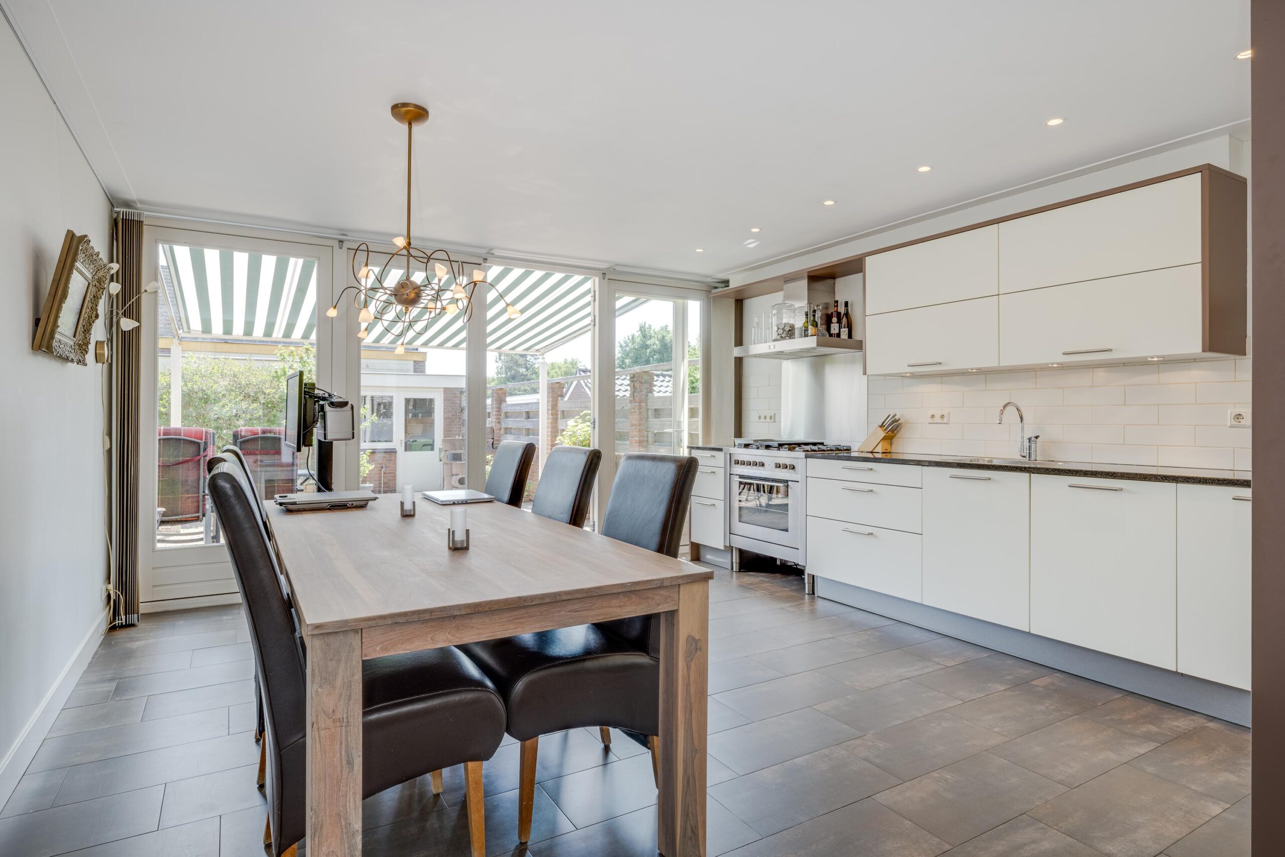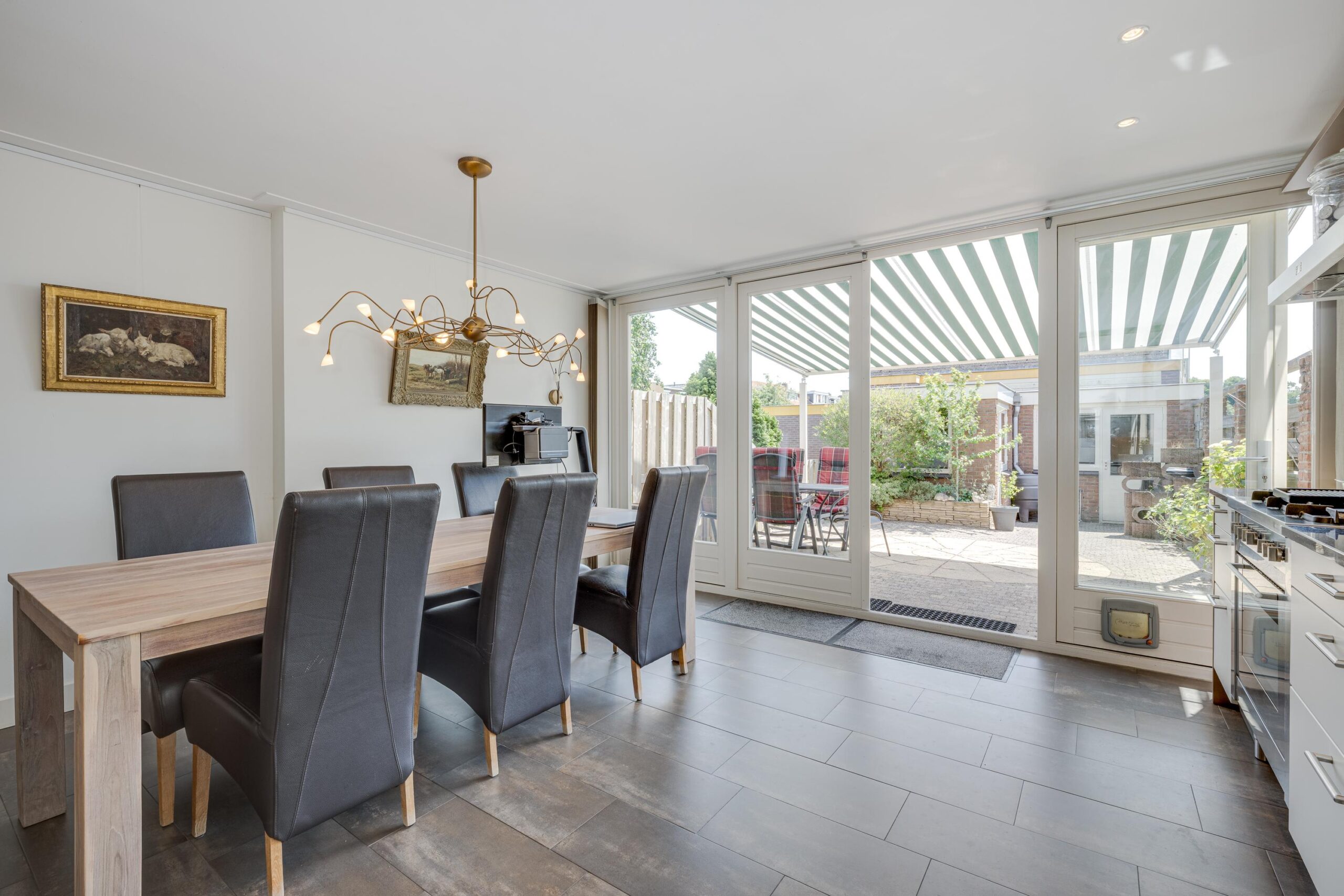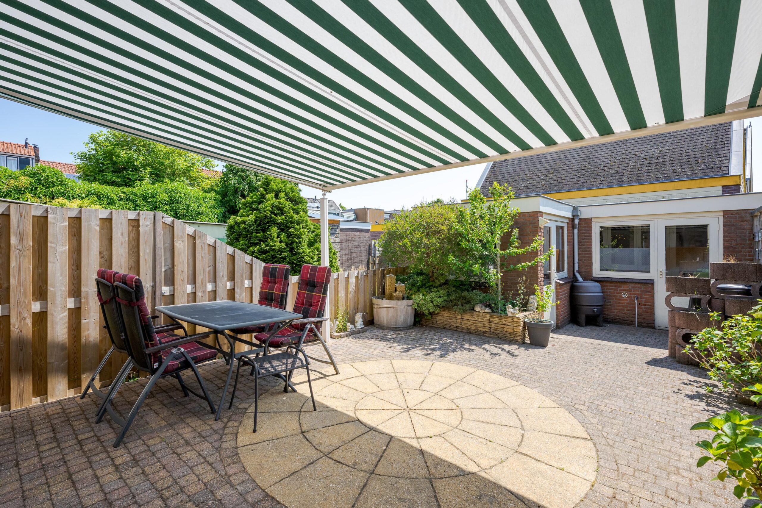 Voortuin, entree woning, hal met meterkast en toilet, deur naar woonkamer, eetkamer en fraaie keuken. De woonkeuken is voorzien van diverse inbouwapparatuur. Openslaande deuren naar de zonnige achtertuin. Stenen berging en GARAGE.