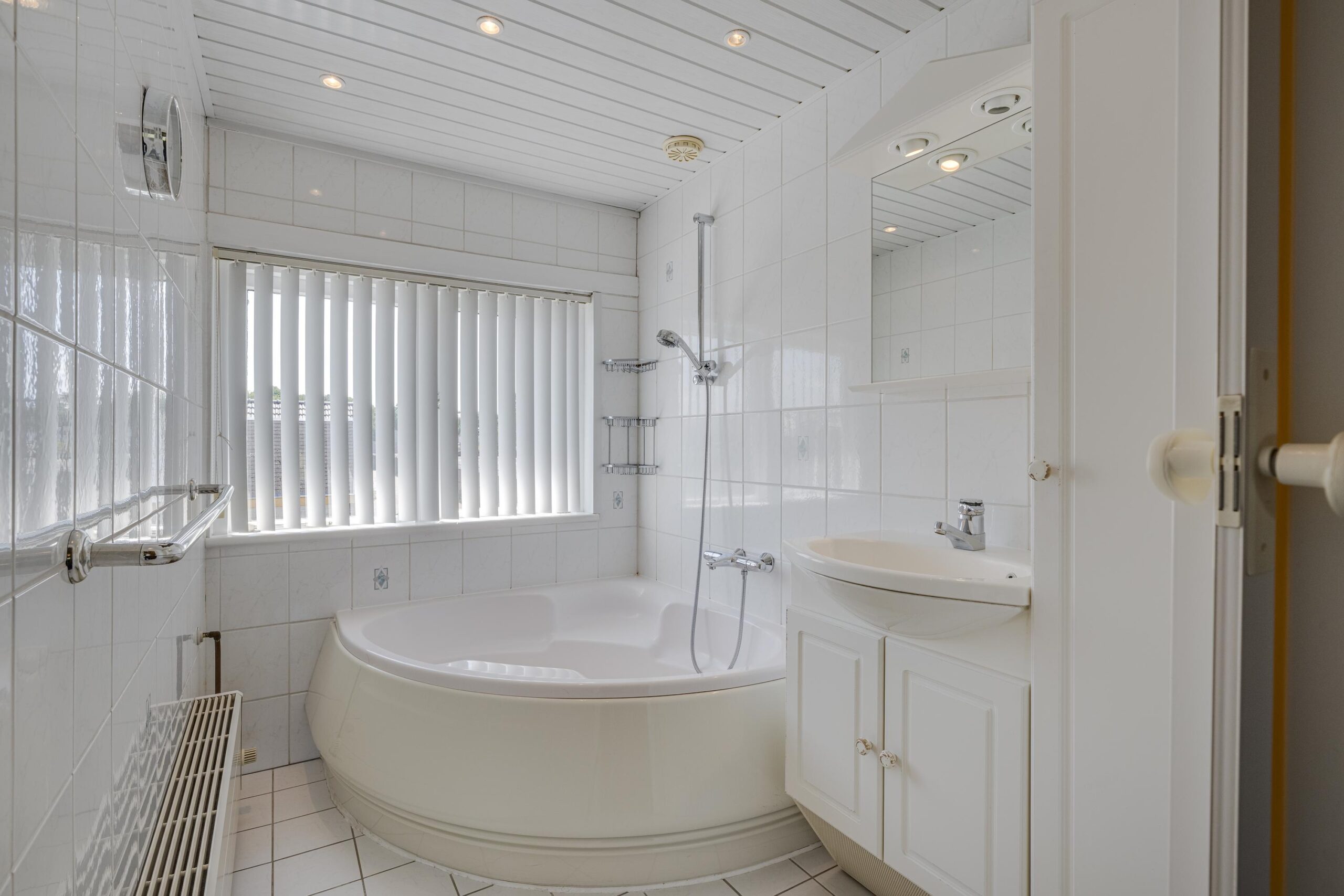 1e verdieping: overloop, twee slaapkamers (een aan de achterzijde en een aan de voorzijde), deur naar badkamer met ligbad, wastafelmeubel en aansluiting voor een tweede toilet, trap naar tweede verdieping.