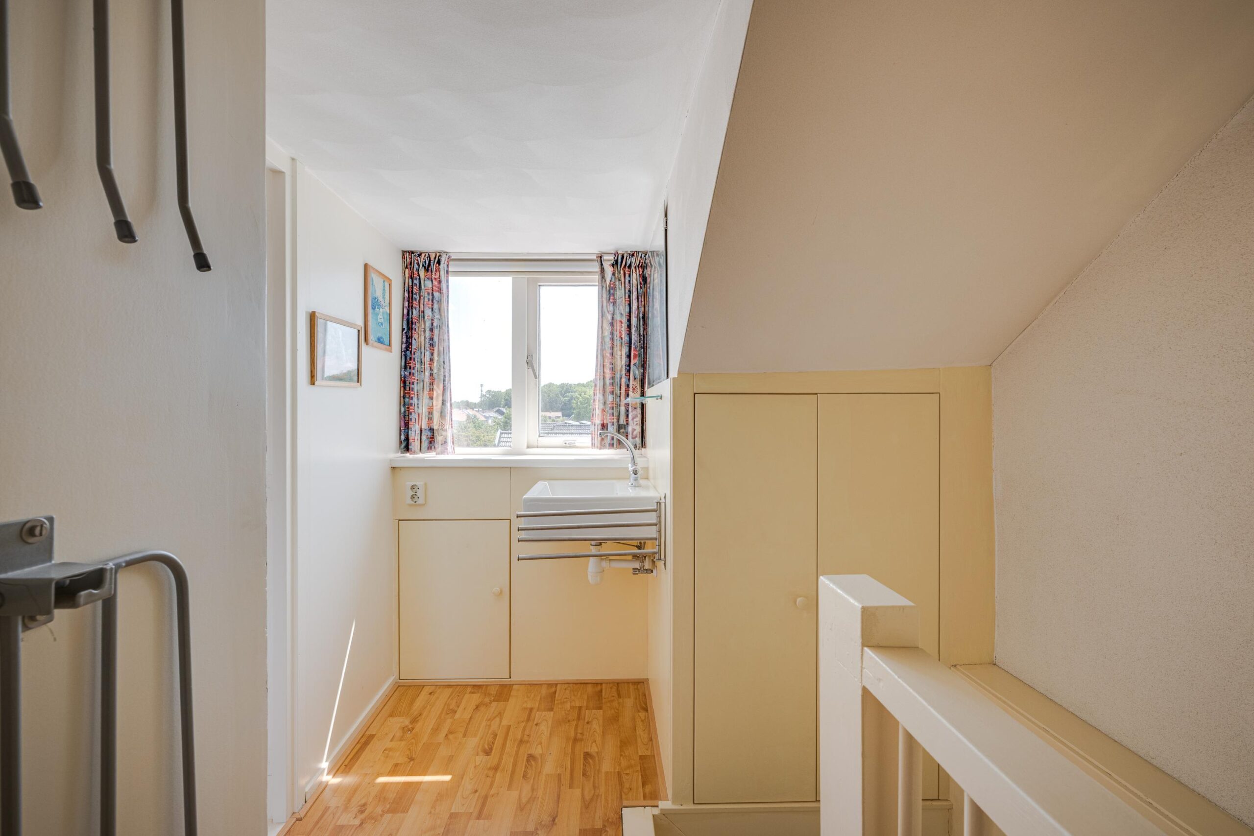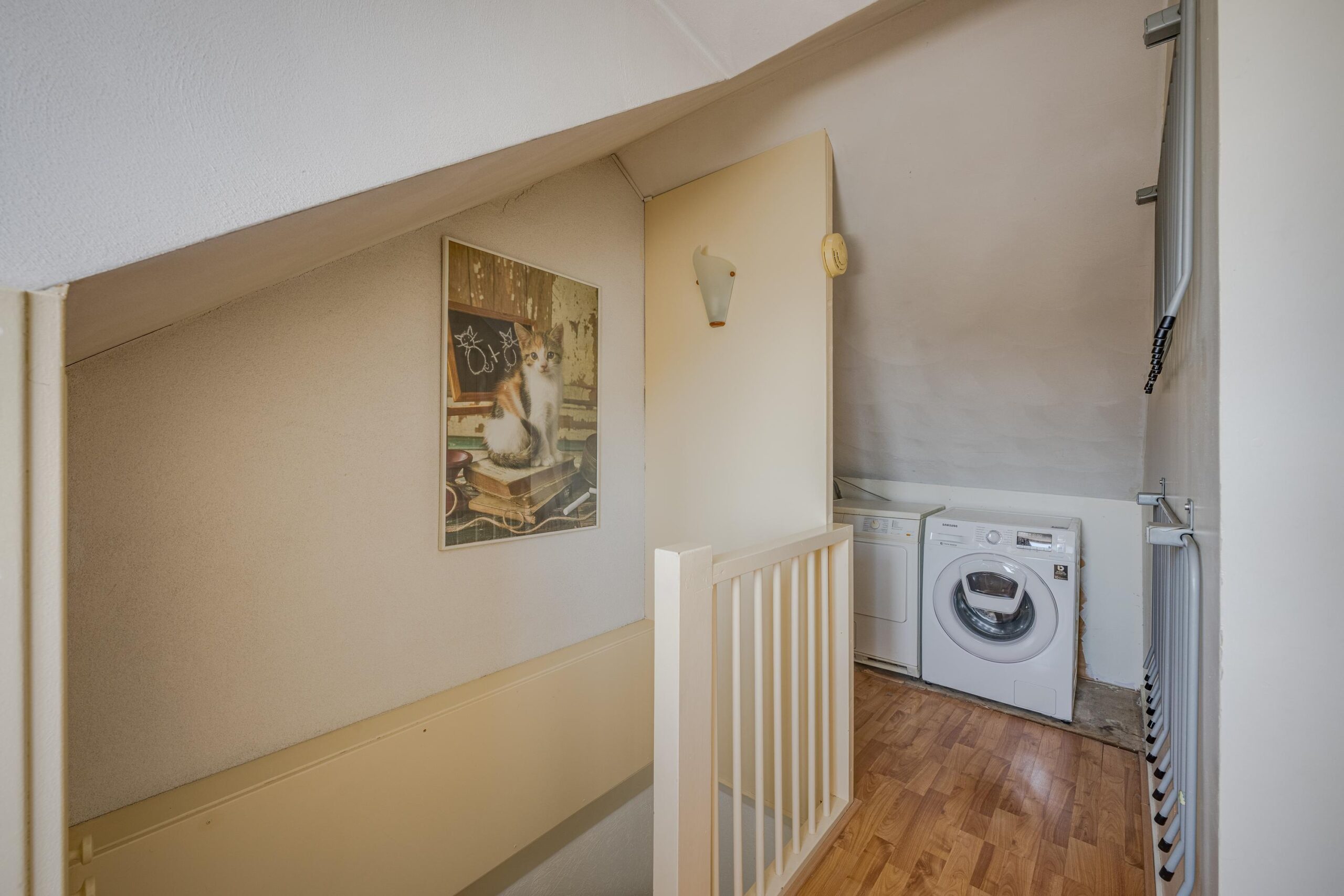 2e verdieping: overloop met aansluiting voor wasmachine en droger, ruime slaapkamer voorzien van dakkapel zowel aan de voor- als aan de achterzijde van de woning en veel opbergruimte.
