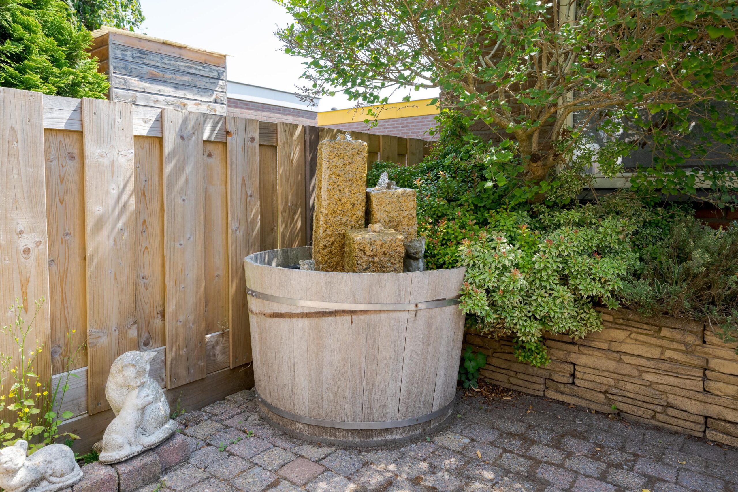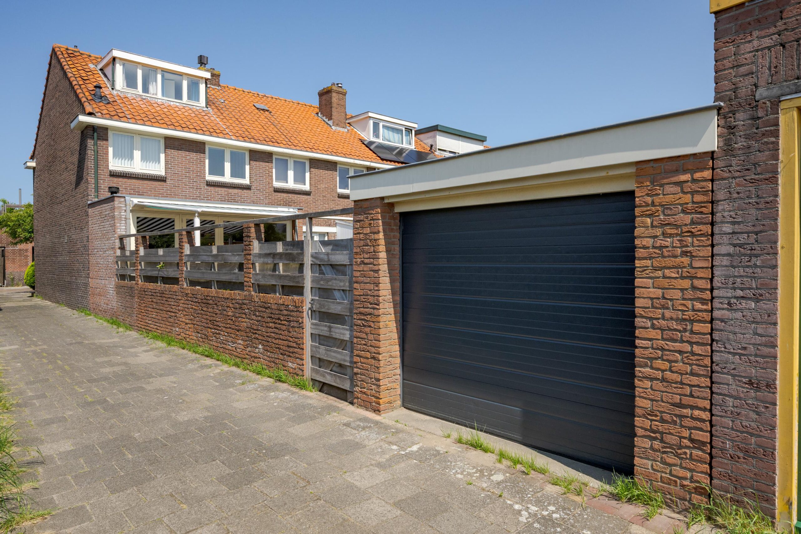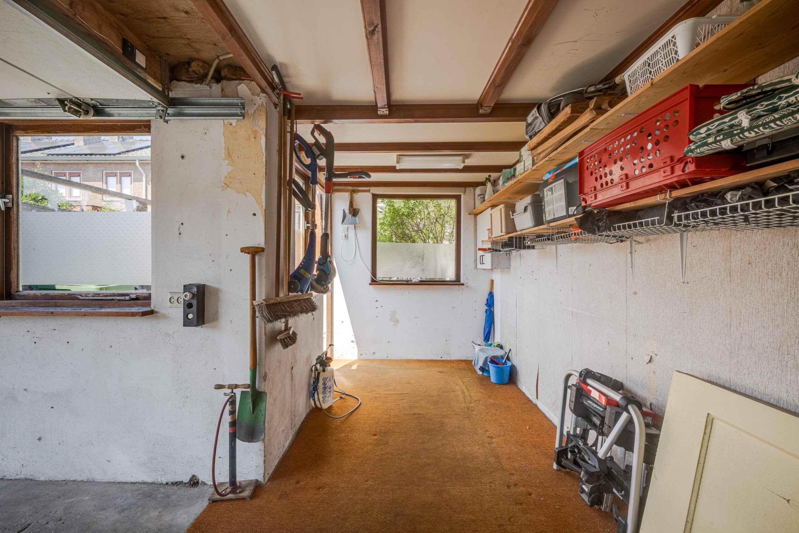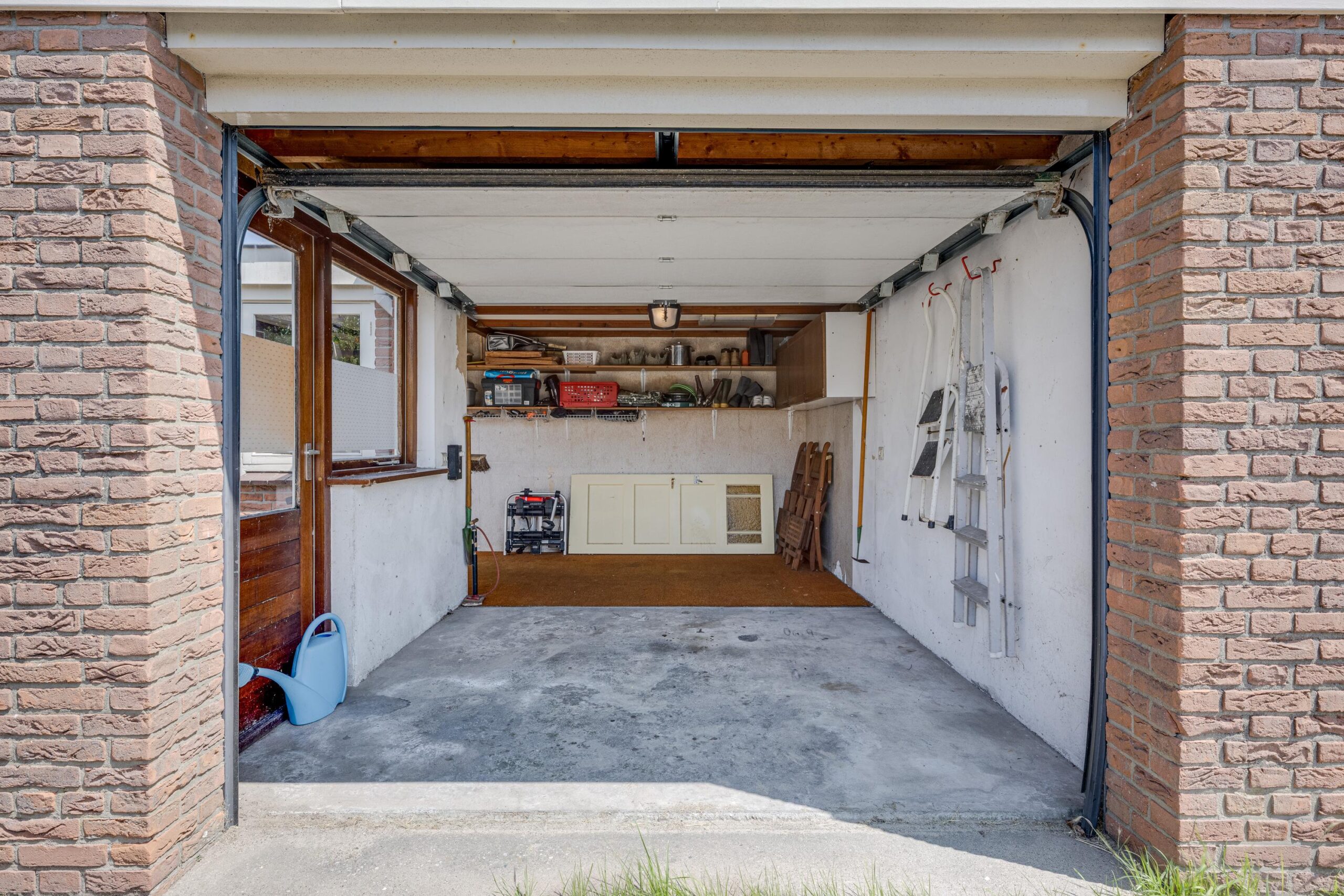 Stenen garage bereikbaar aan twee zijden, te weten vanuit de tuin en via de straatzijde te openen met een roldeur.