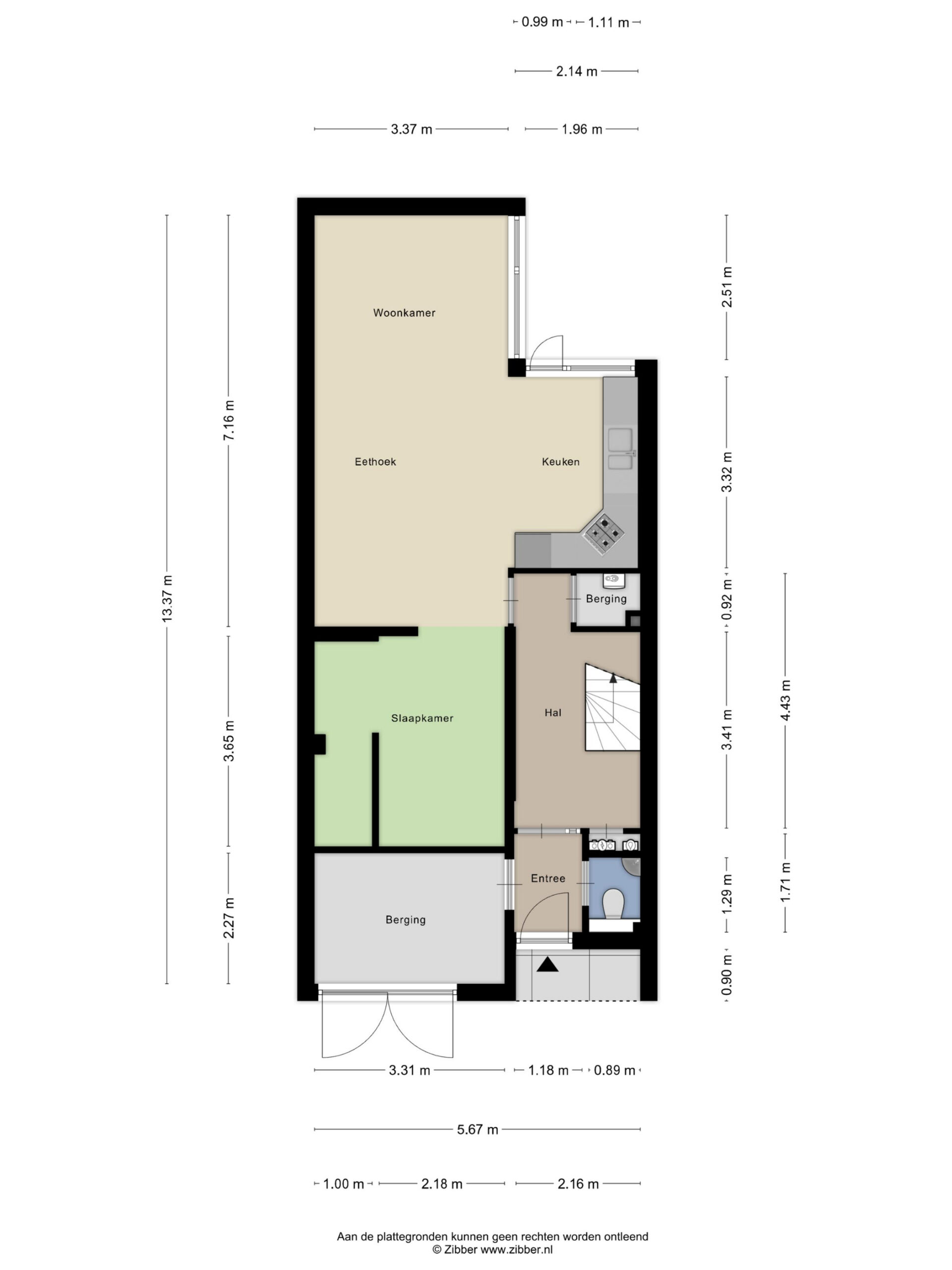 Indeling: entree woning. Voorportaal met toilet en meterkast, deur naar berging aan de voorzijde. Hal met trap naar bovengelegen verdieping, berging en cv-opstelling. Deur naar appartement met slaapkamer en badkamer. Woonkamer met keuken en deur naar achtertuin.