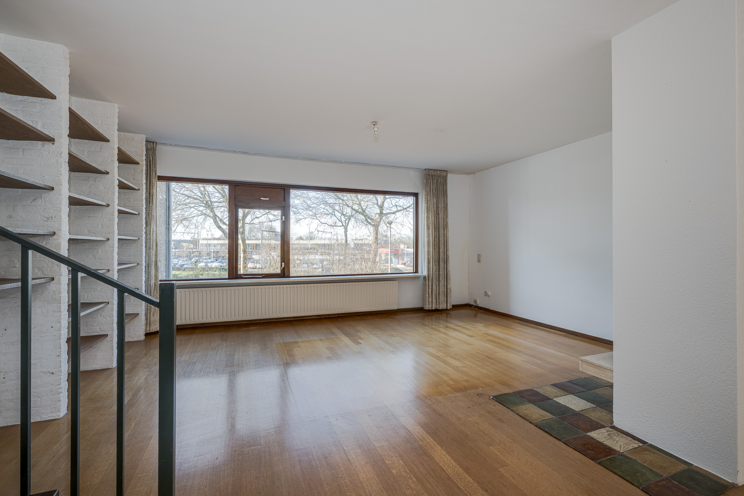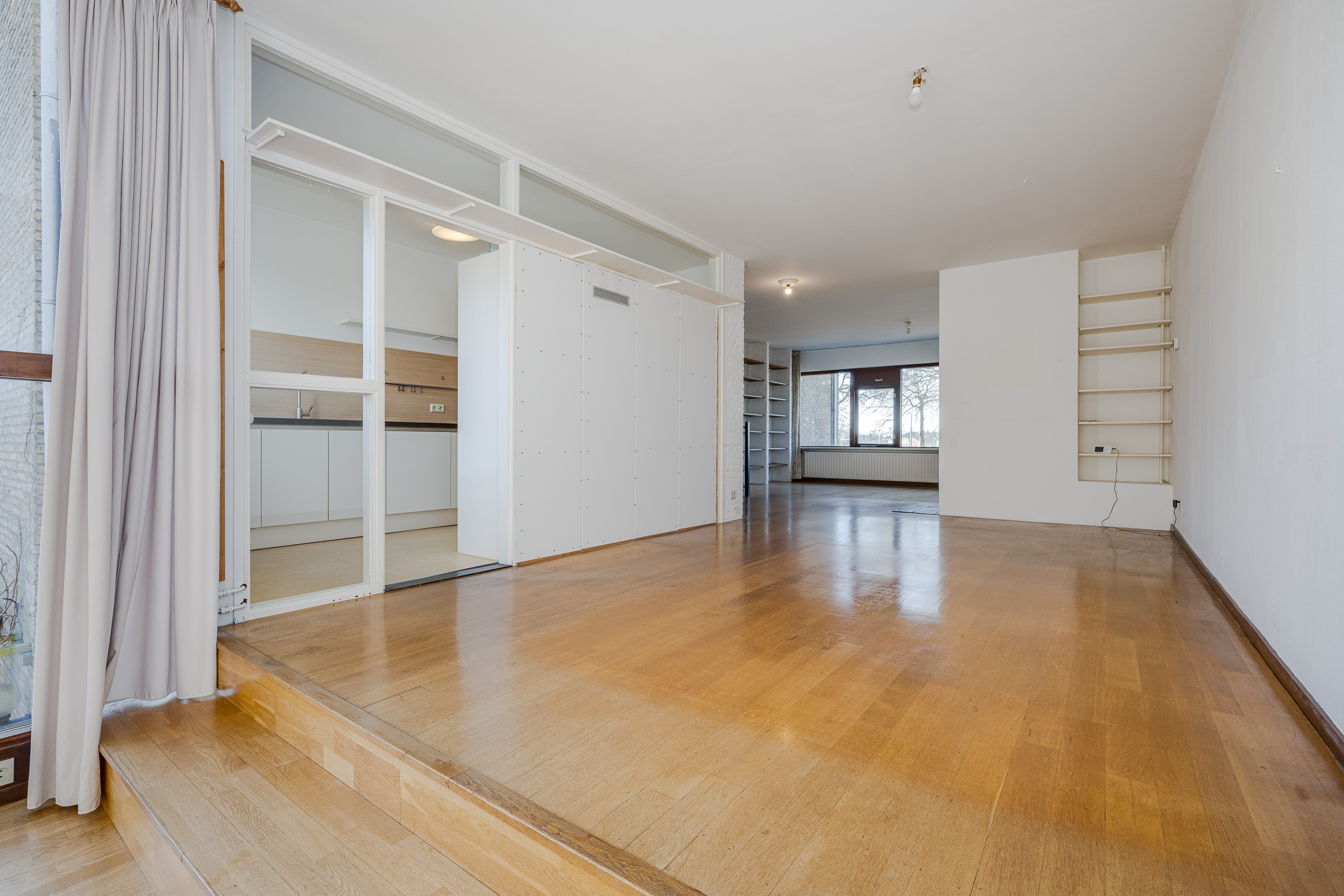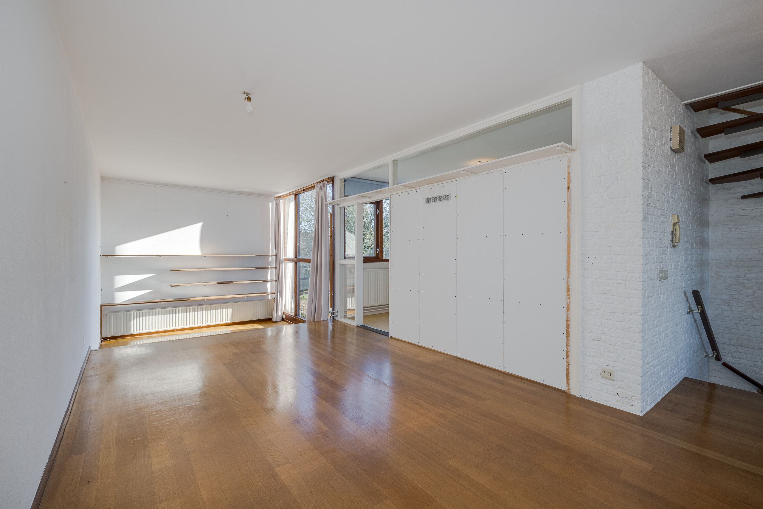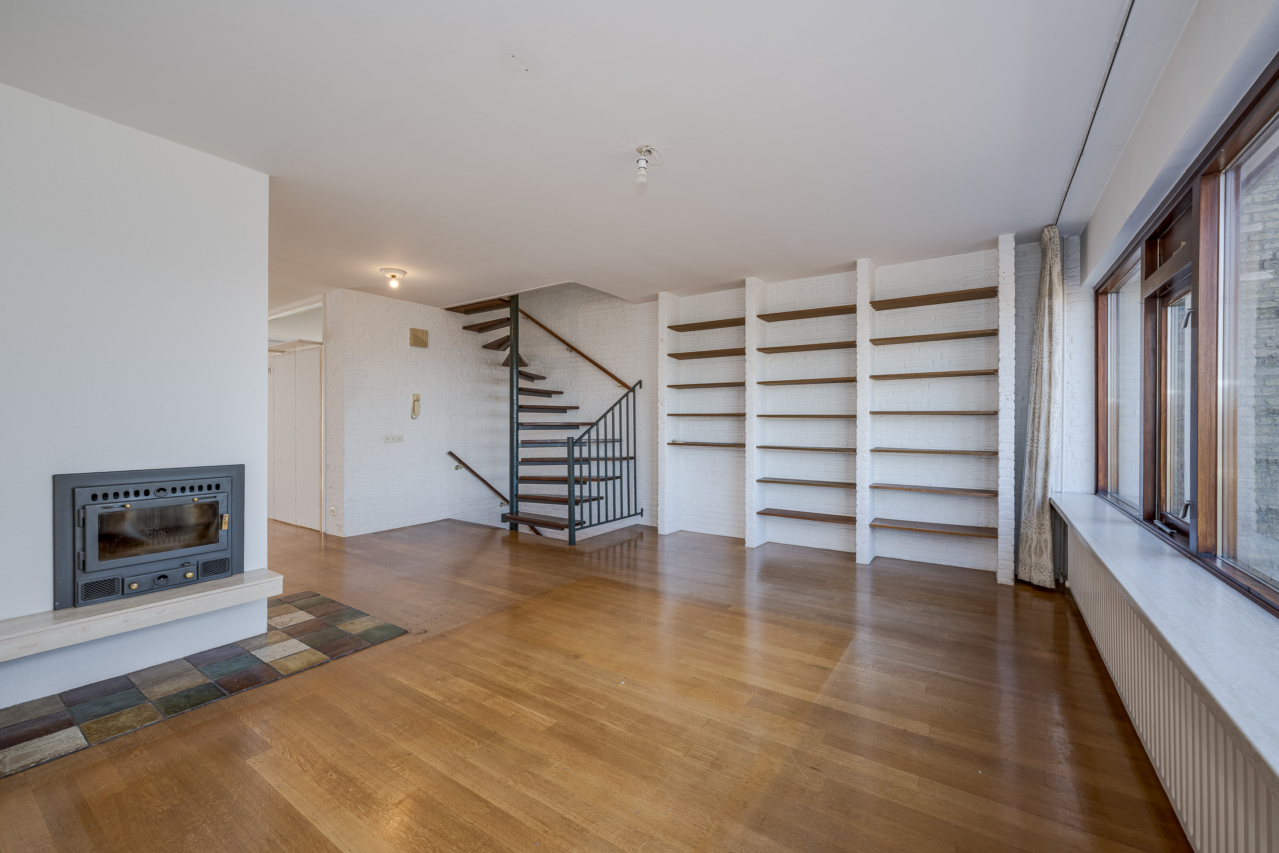 1e verdieping: grote woon- eetkamer met zitkuil. Keuken. Trap naar bovengelegen verdieping.