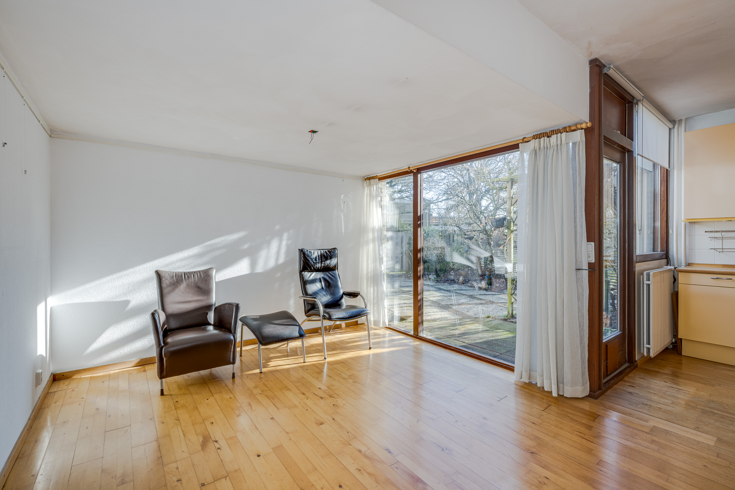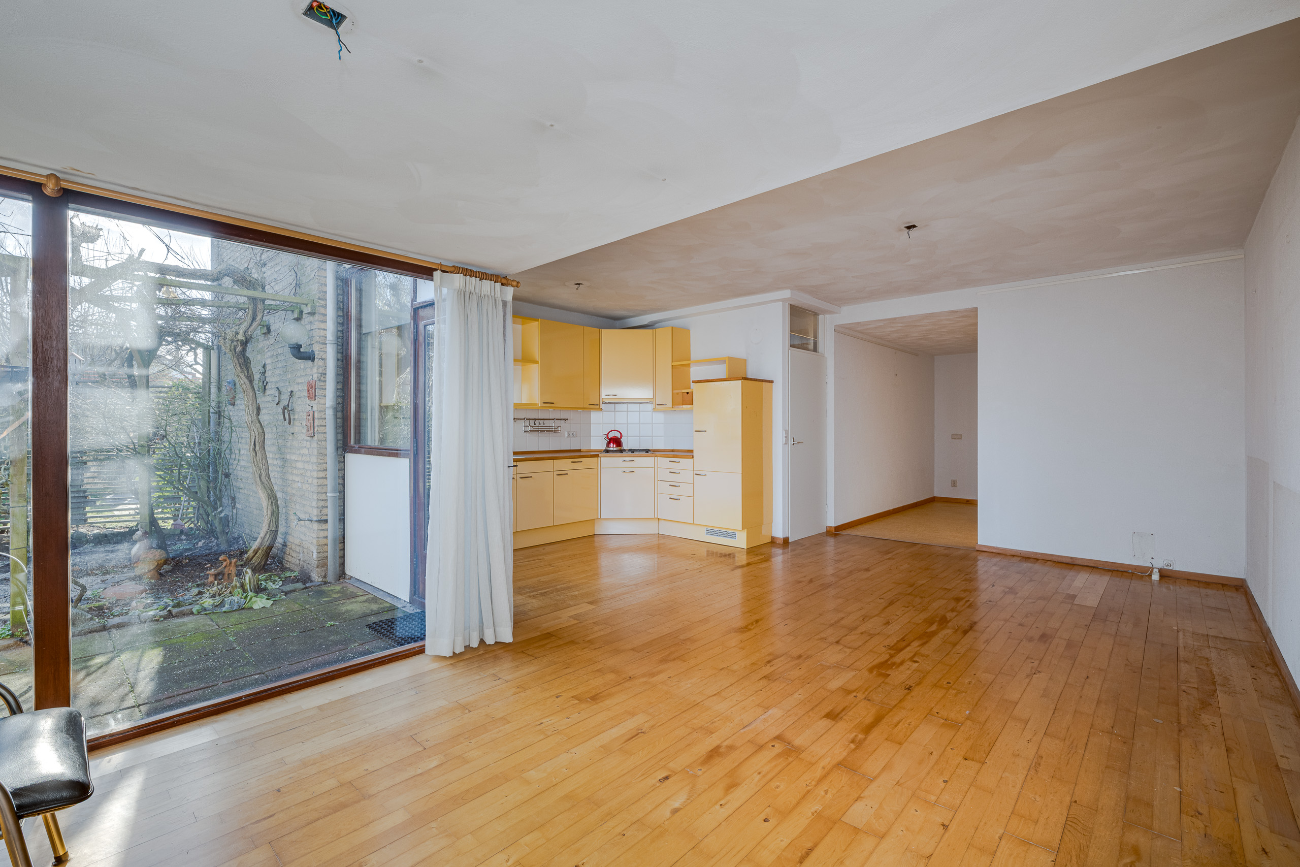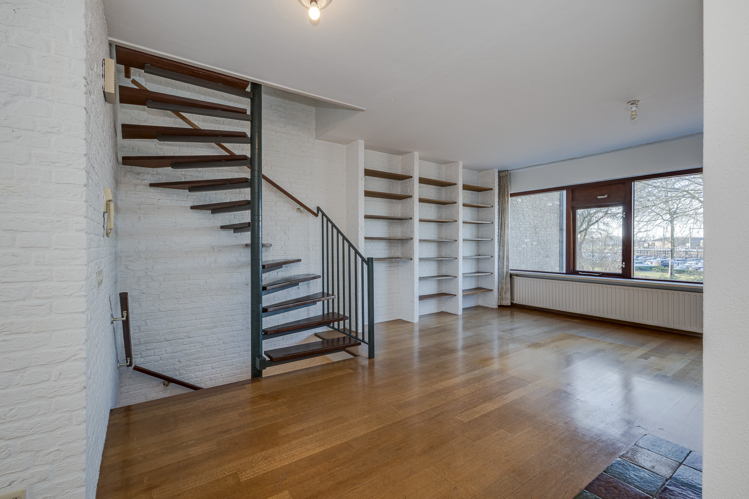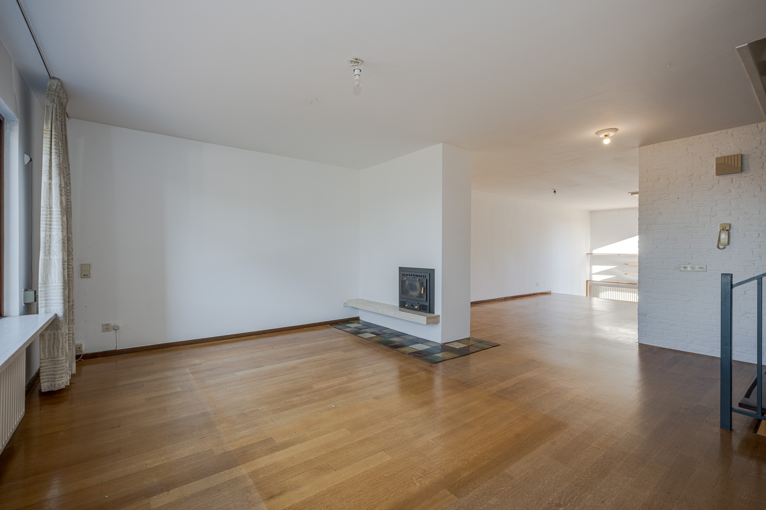 1e verdieping: grote woon- eetkamer met zitkuil. Keuken. Trap naar bovengelegen verdieping.