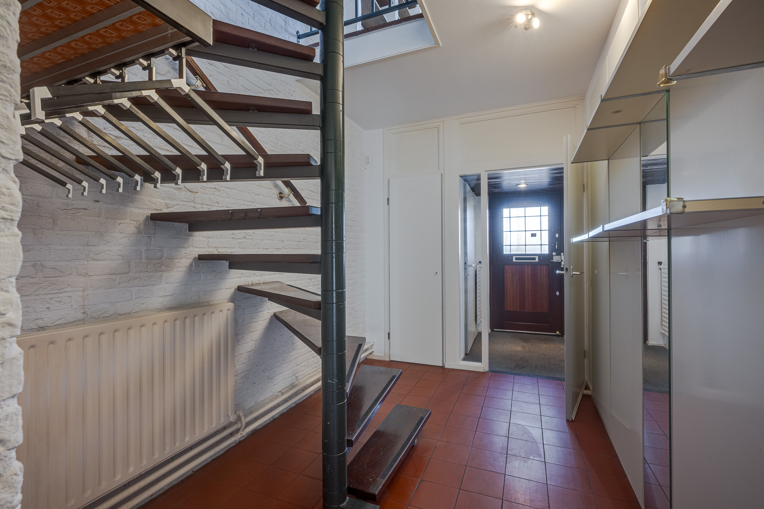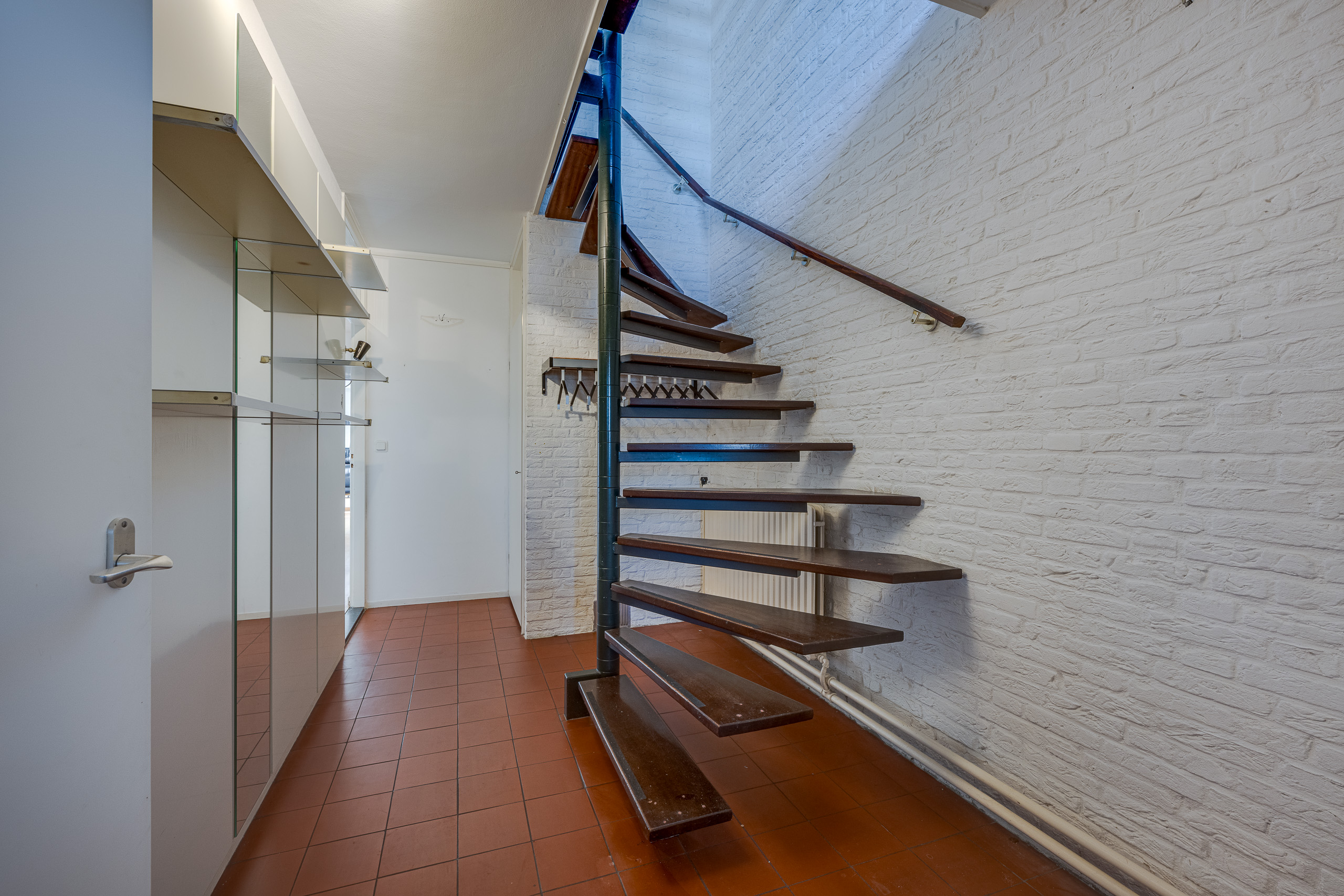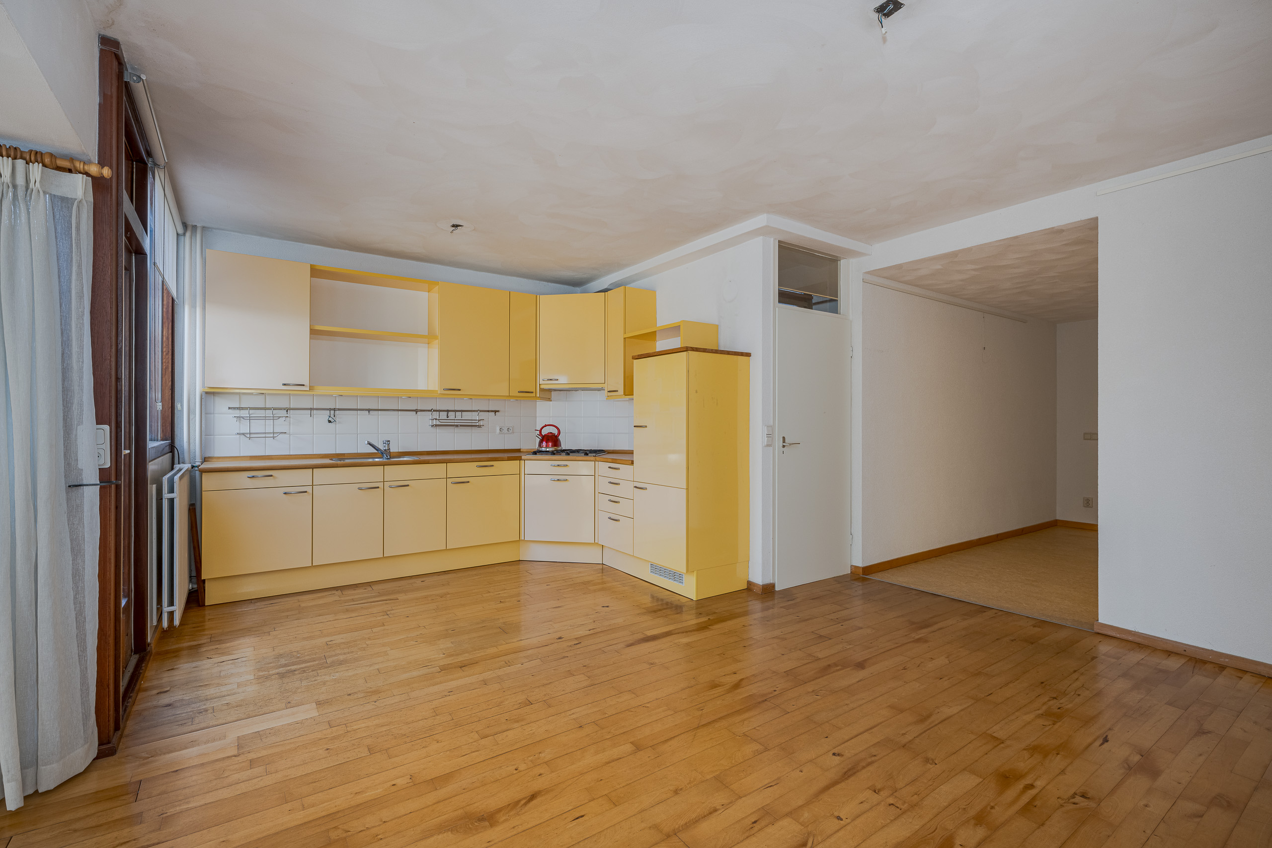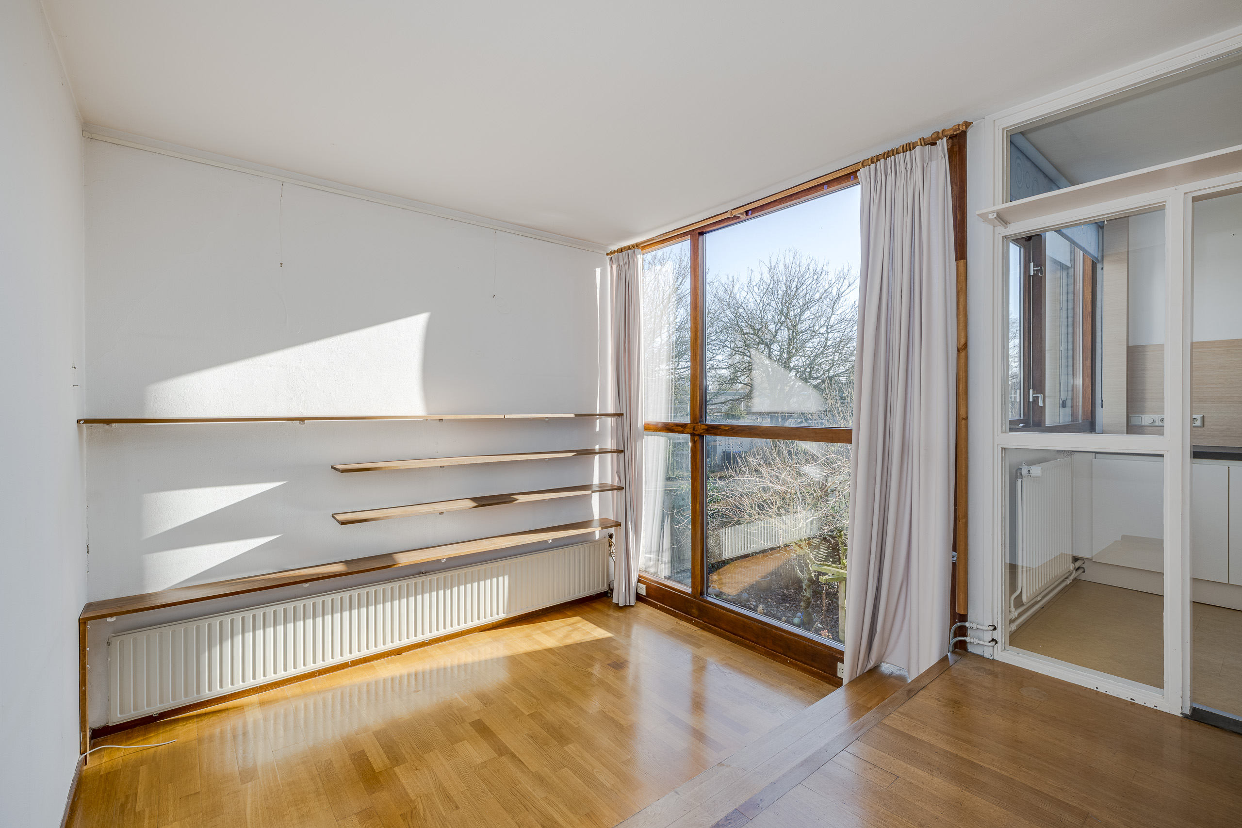 1e verdieping: grote woon- eetkamer met zitkuil. Keuken. Trap naar bovengelegen verdieping.