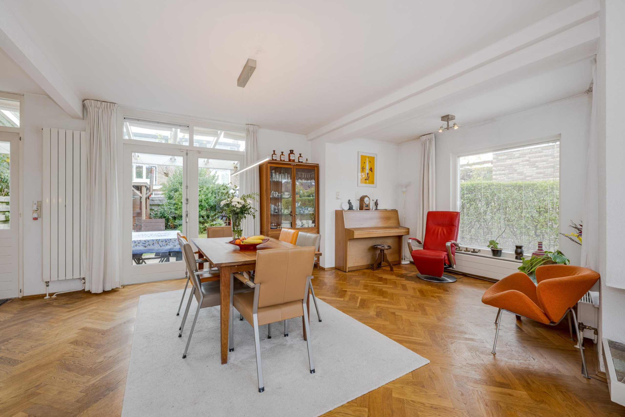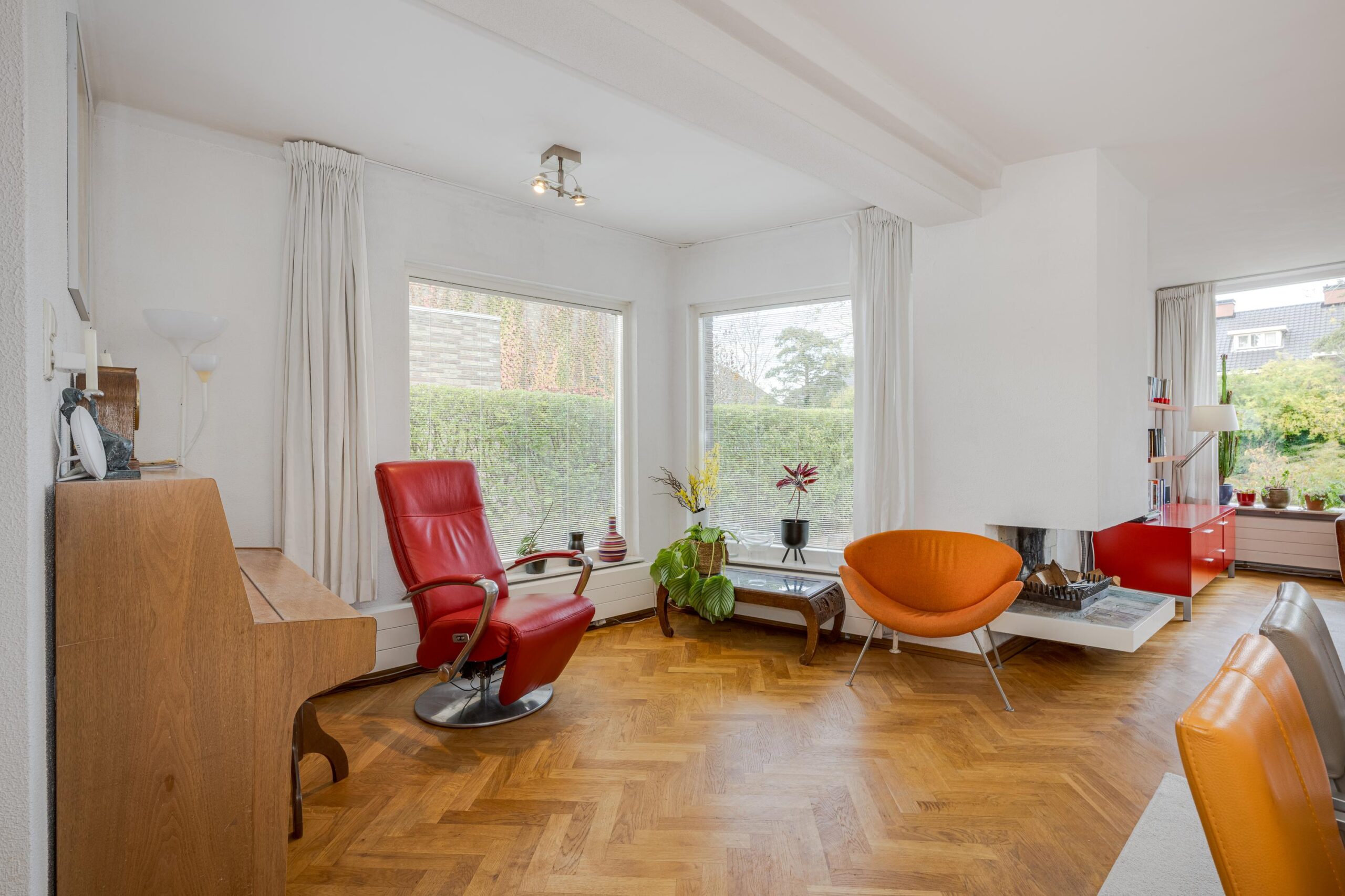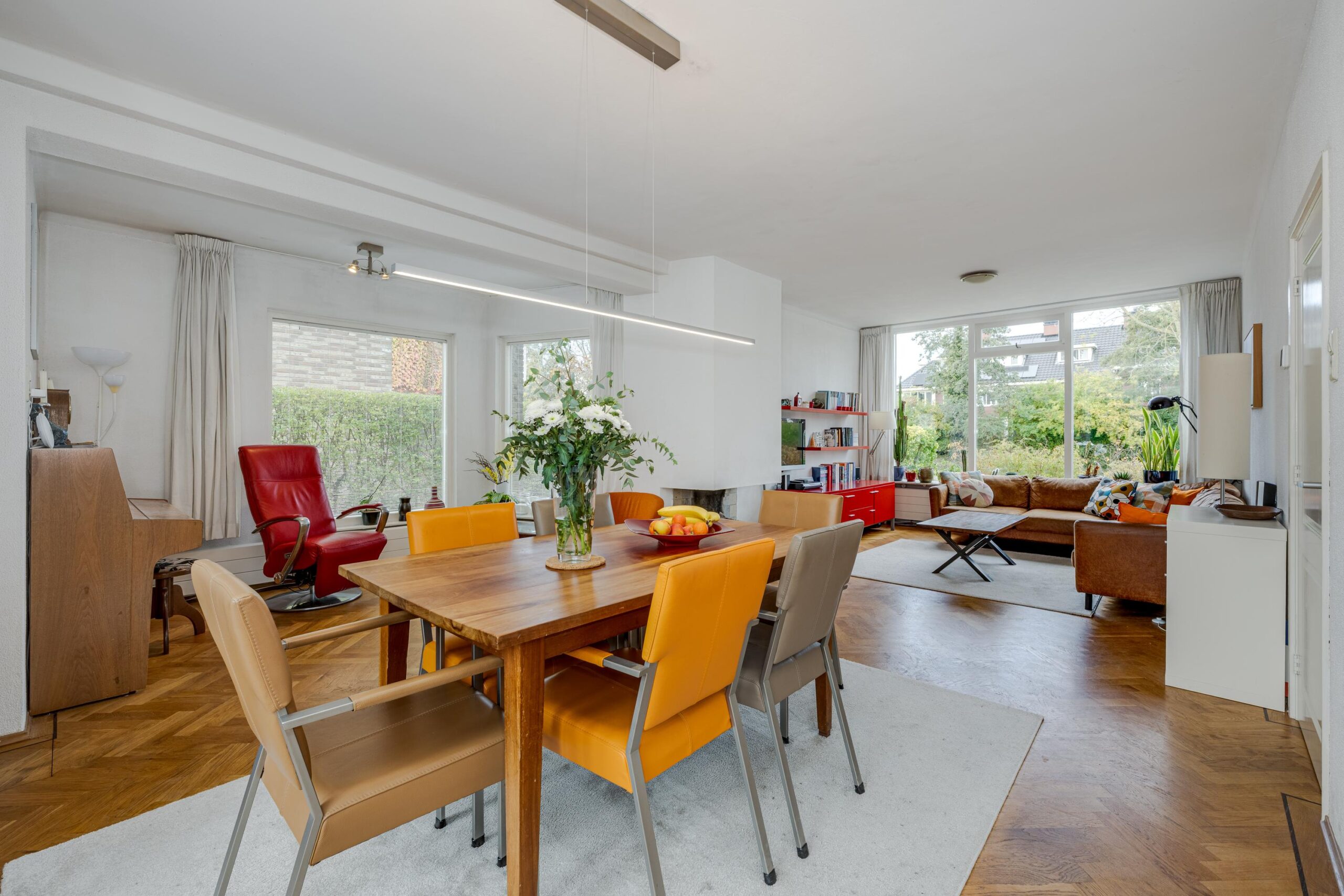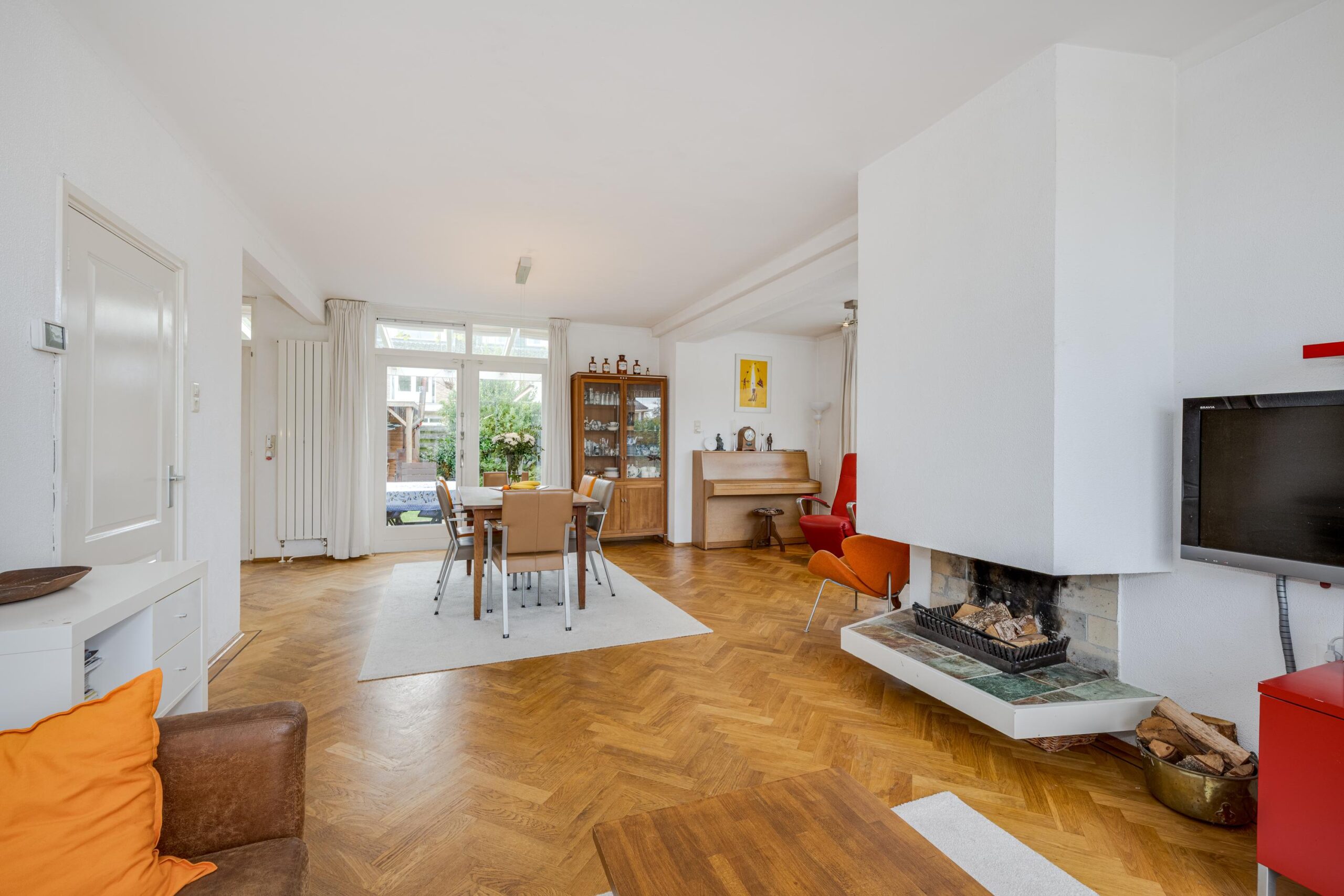 De ruime, lichte woonkamer is het hart van de woning. Dankzij de grote raampartijen en de hoekligging op de zonkant is er volop daglicht. De open haard, de eikenhouten parketvloer en de uitbouw aan de zijkant zorgen voor sfeer, of het nu een tweede zithoek wordt, een werkplek of een speelkamer, de uitbouw voelt direct als een luxe extra leefruimte.