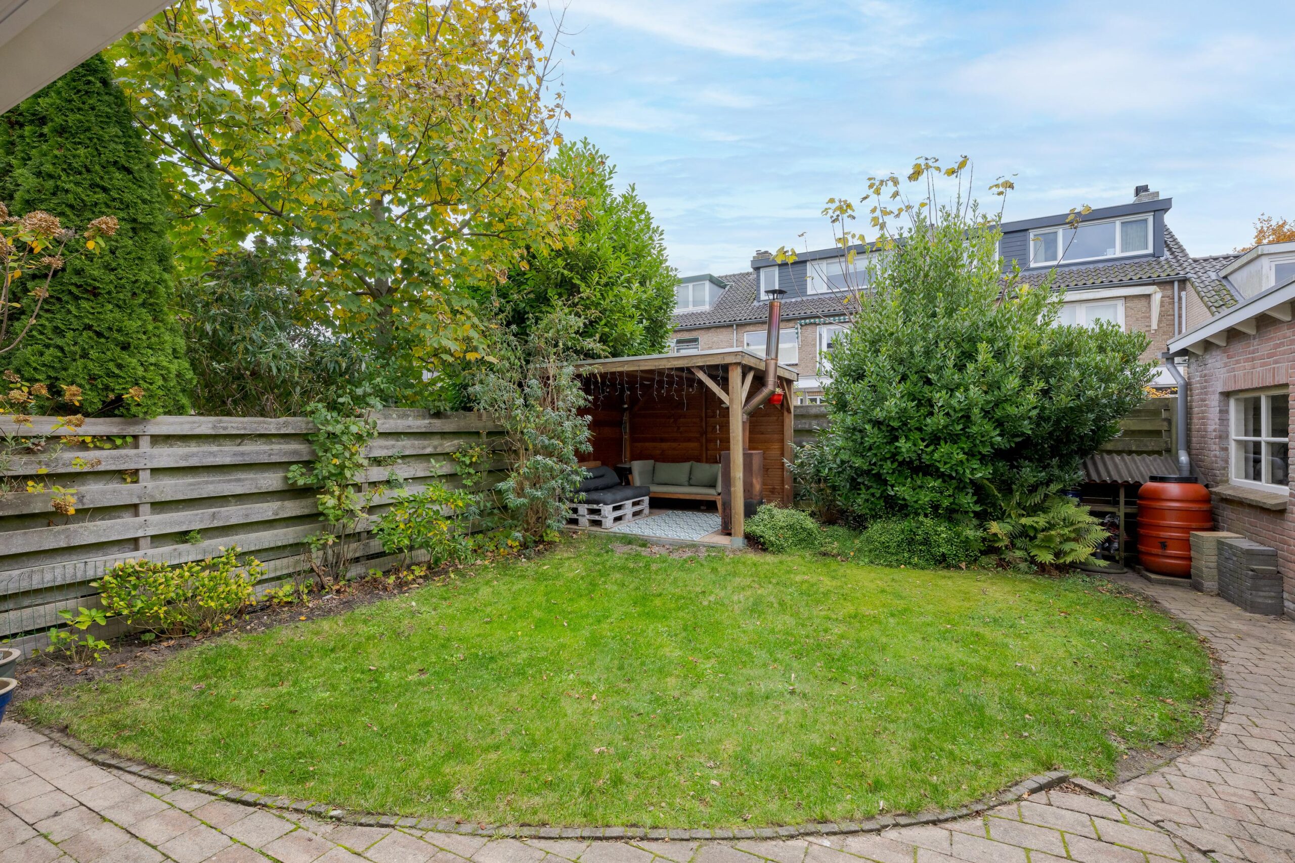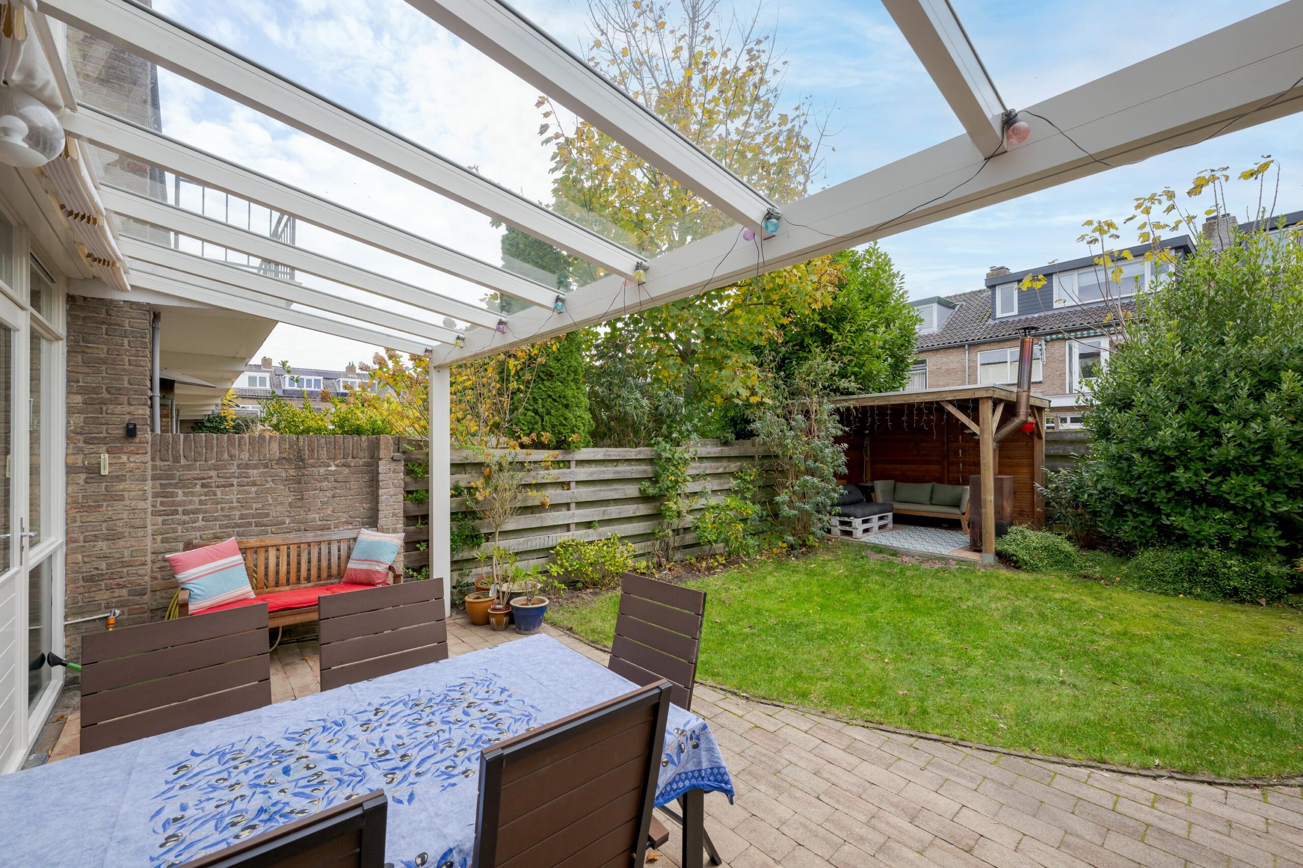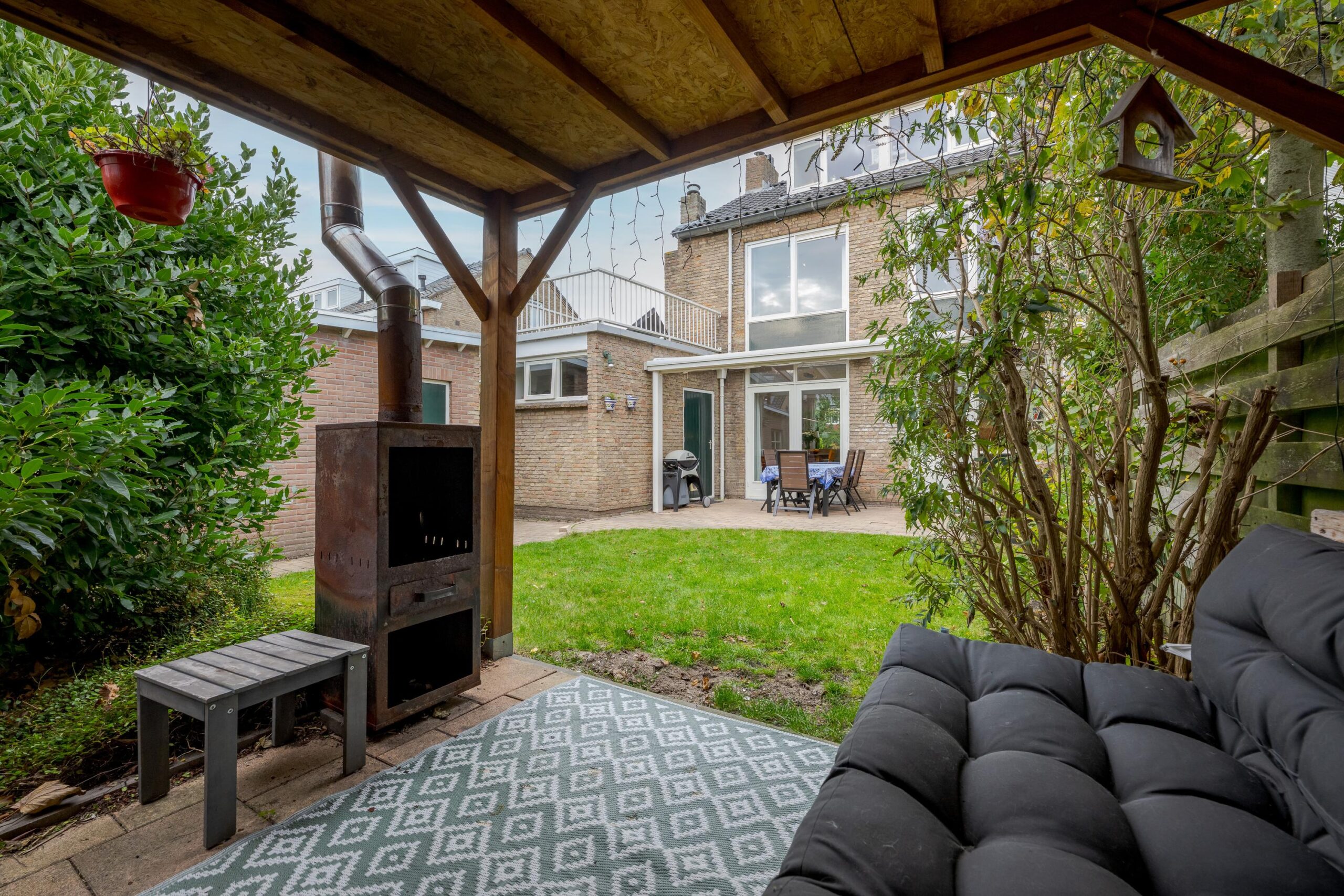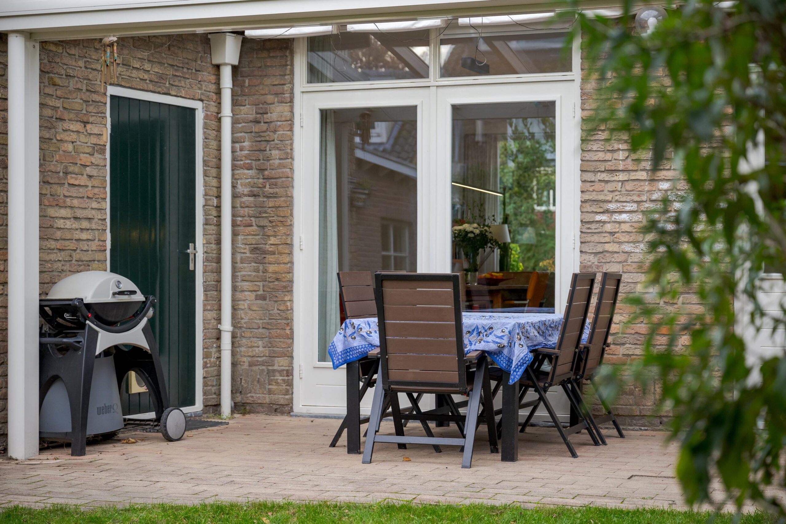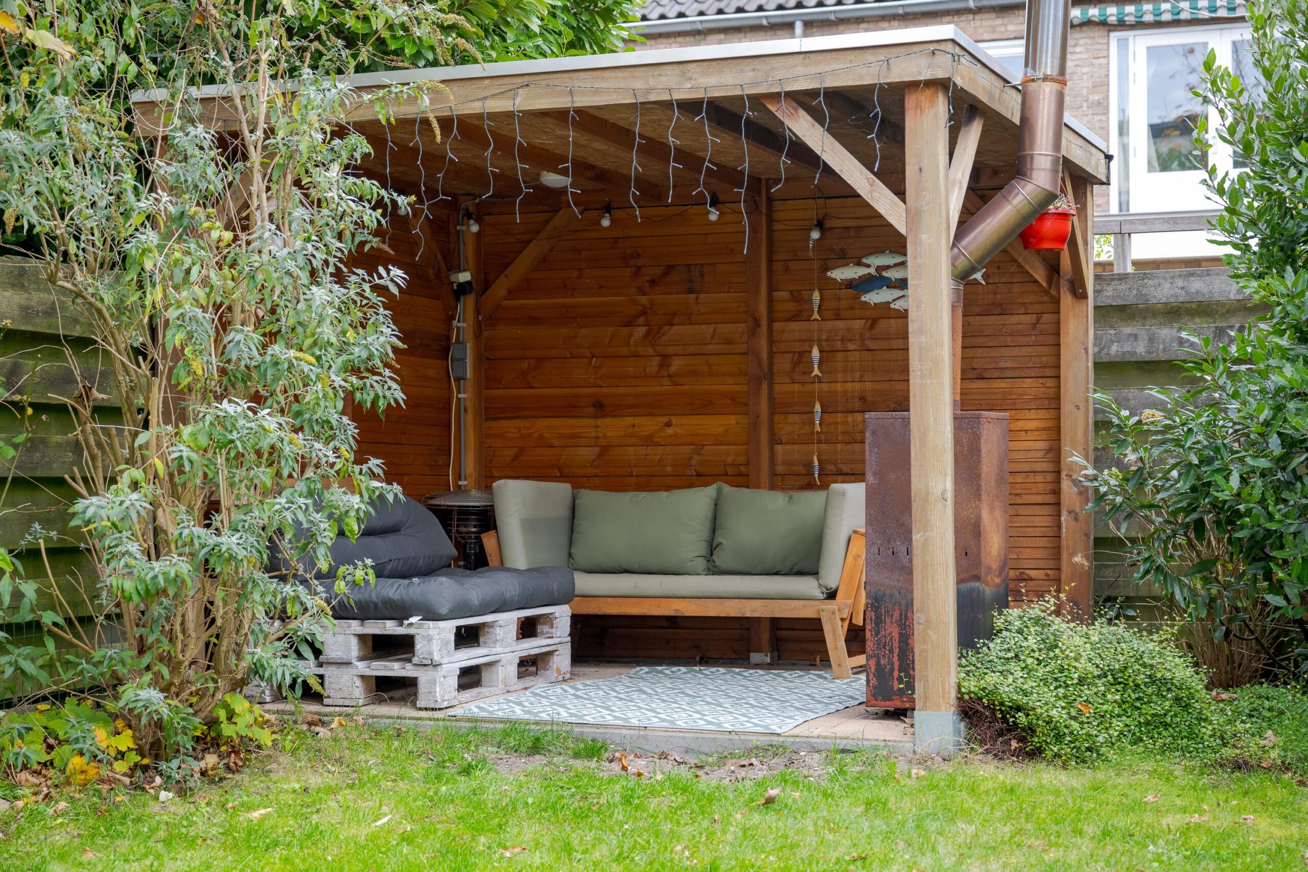 Tuin: De tuin is te bereiken via de achterdeur aan de keuken, en vanuit de eetkamer met twee openslaande deuren. De achtergevel is voorzien van een overkapping over het terras. Ook dat is een plekje om al vroeg in het voorjaar heerlijk beschut buiten te zitten. Achterin de tuin staat een open tuinhuisje met elektriciteit, aan de zijkant is de deur naar de garage en een achterom.