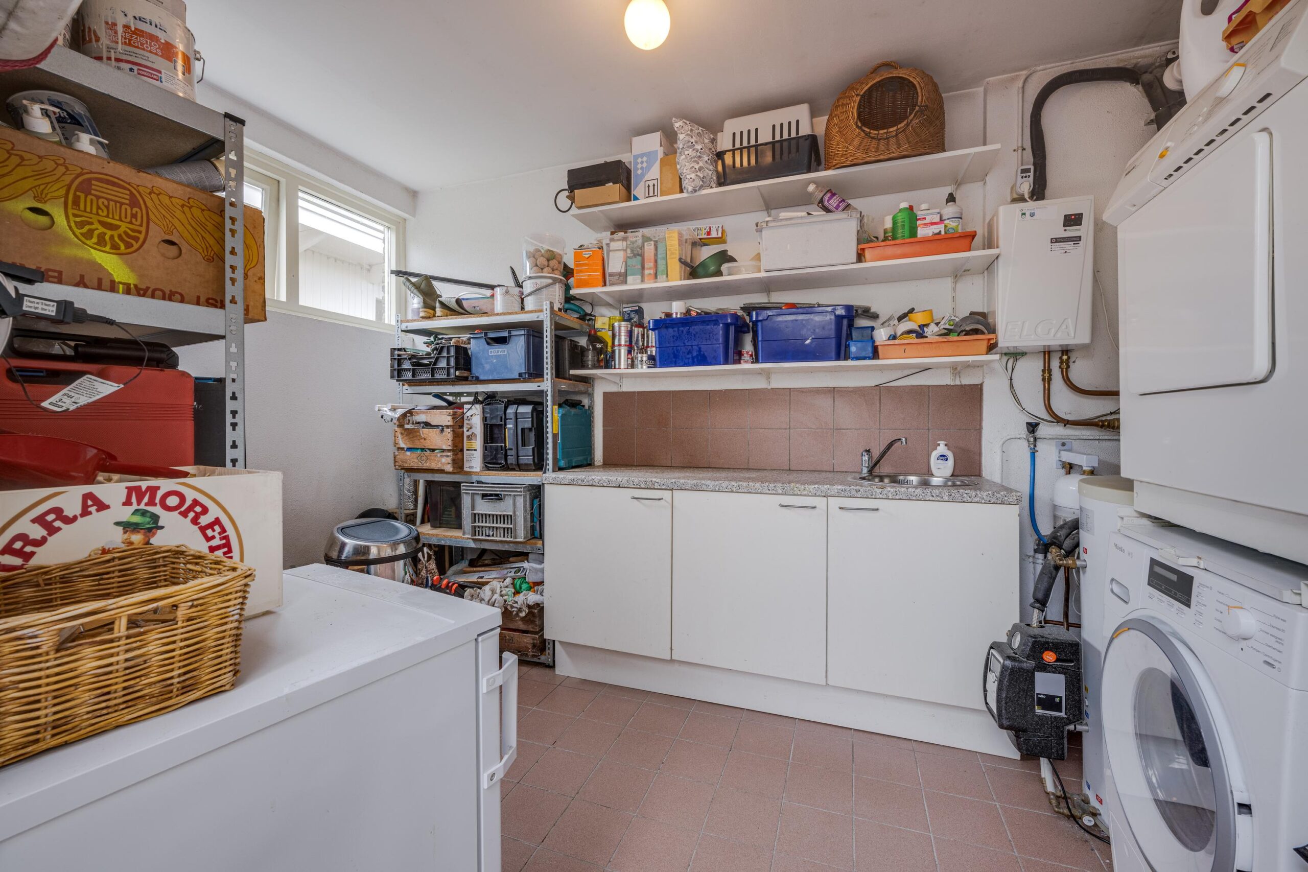 Bijkeuken: De bijkeuken bereik je via een deur onder de overkapping. Voorzien van aanrecht met gootsteen, wasmachine- en droger aansluiting en de CV installatie (2025).