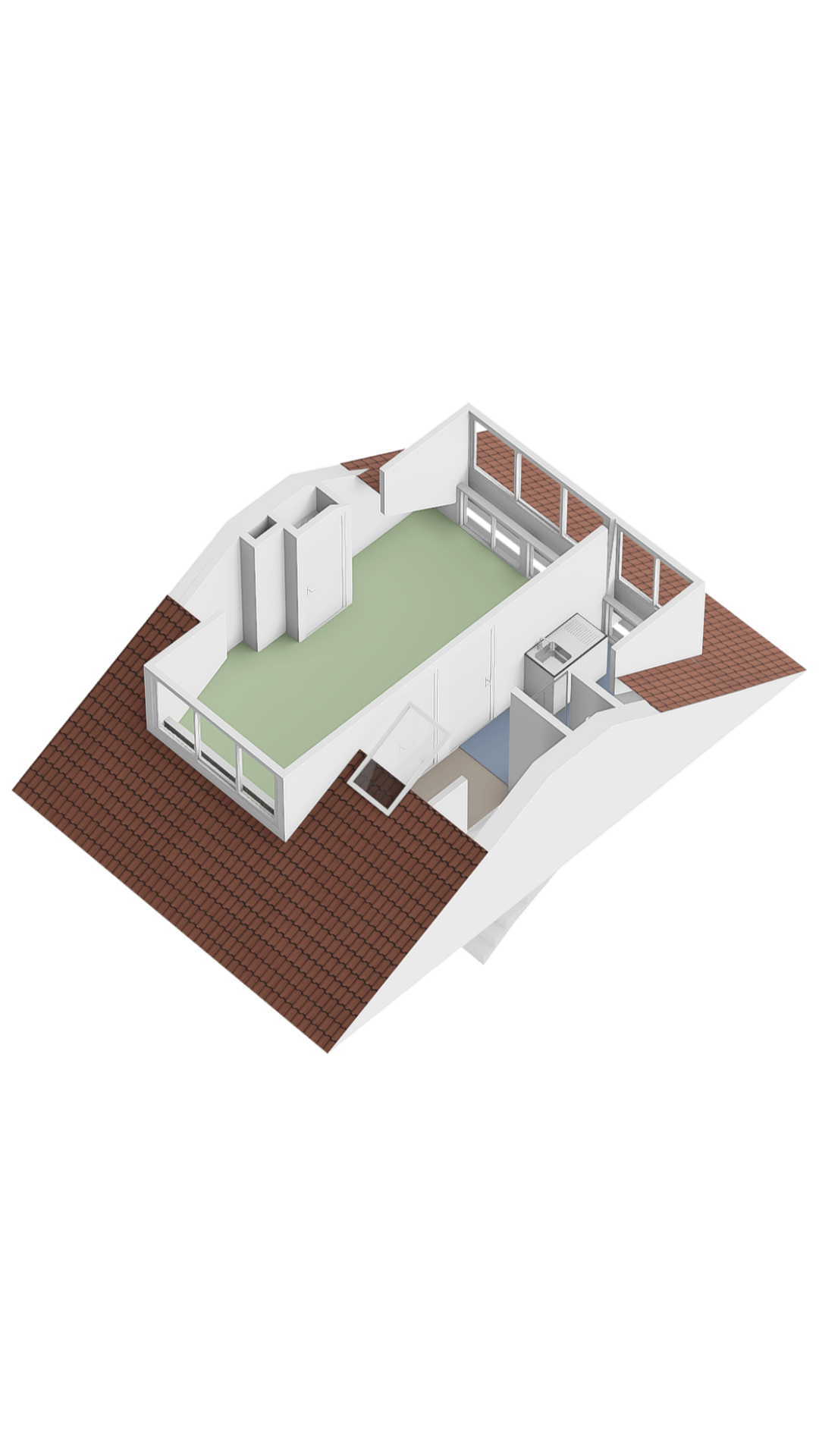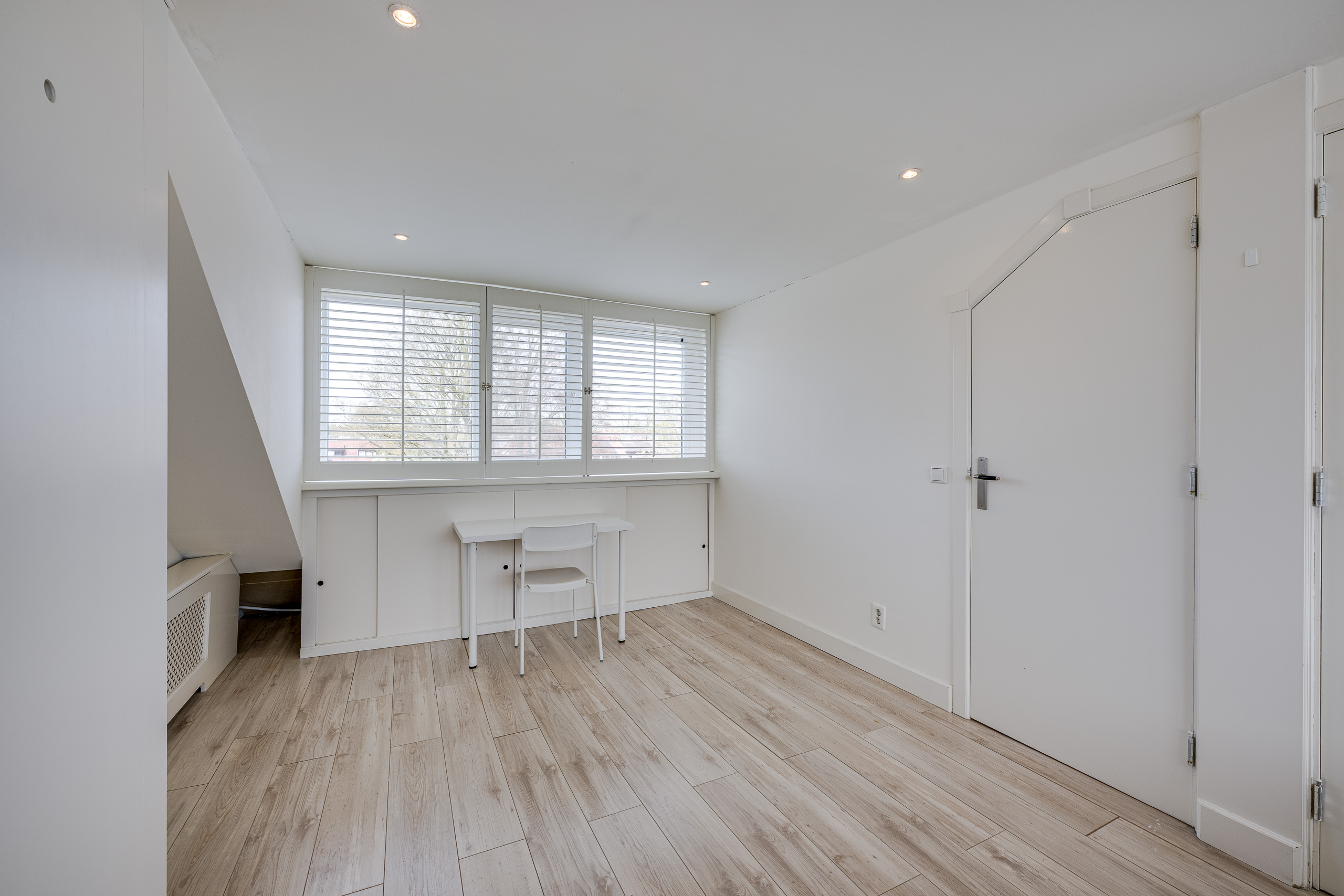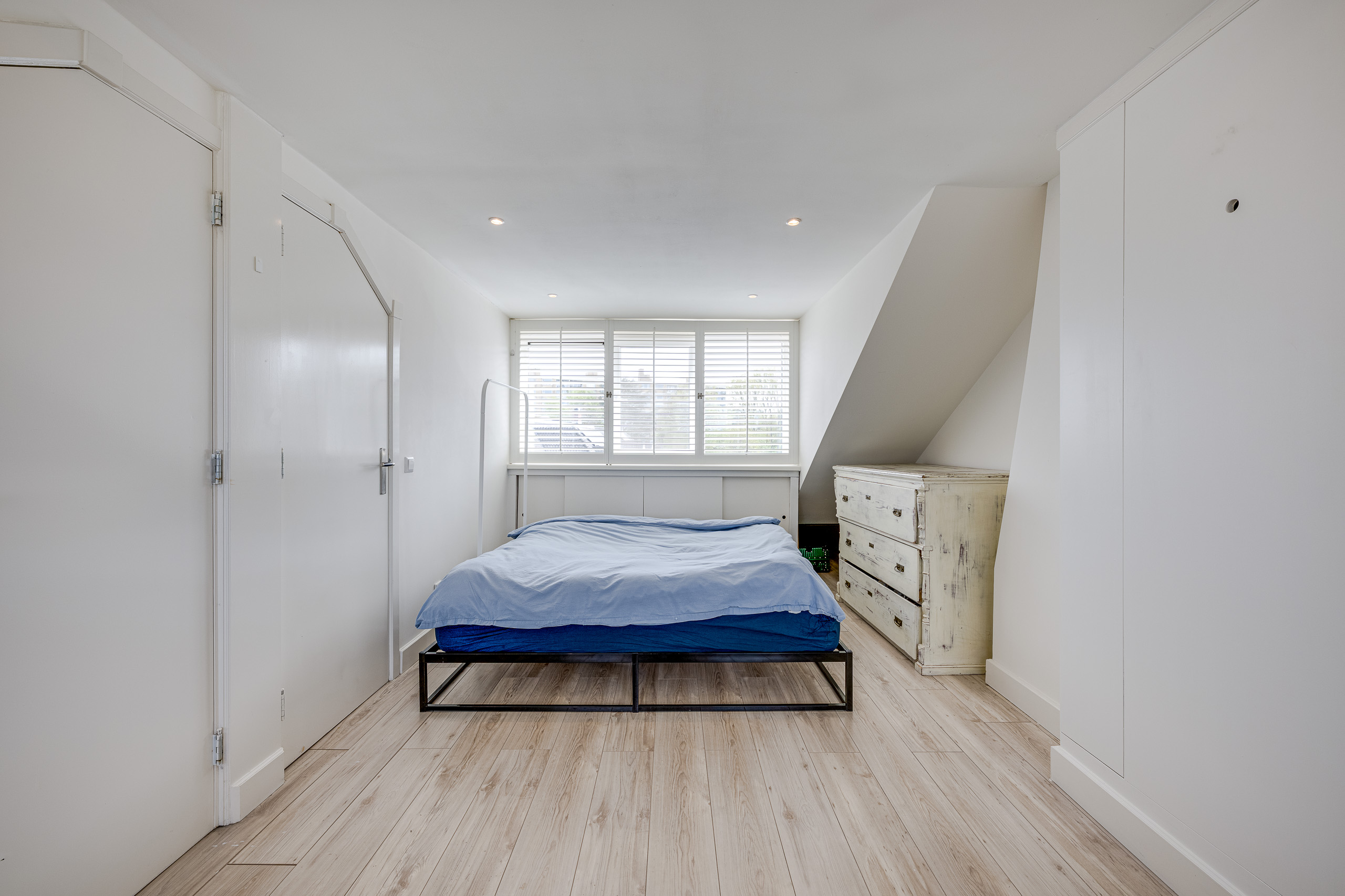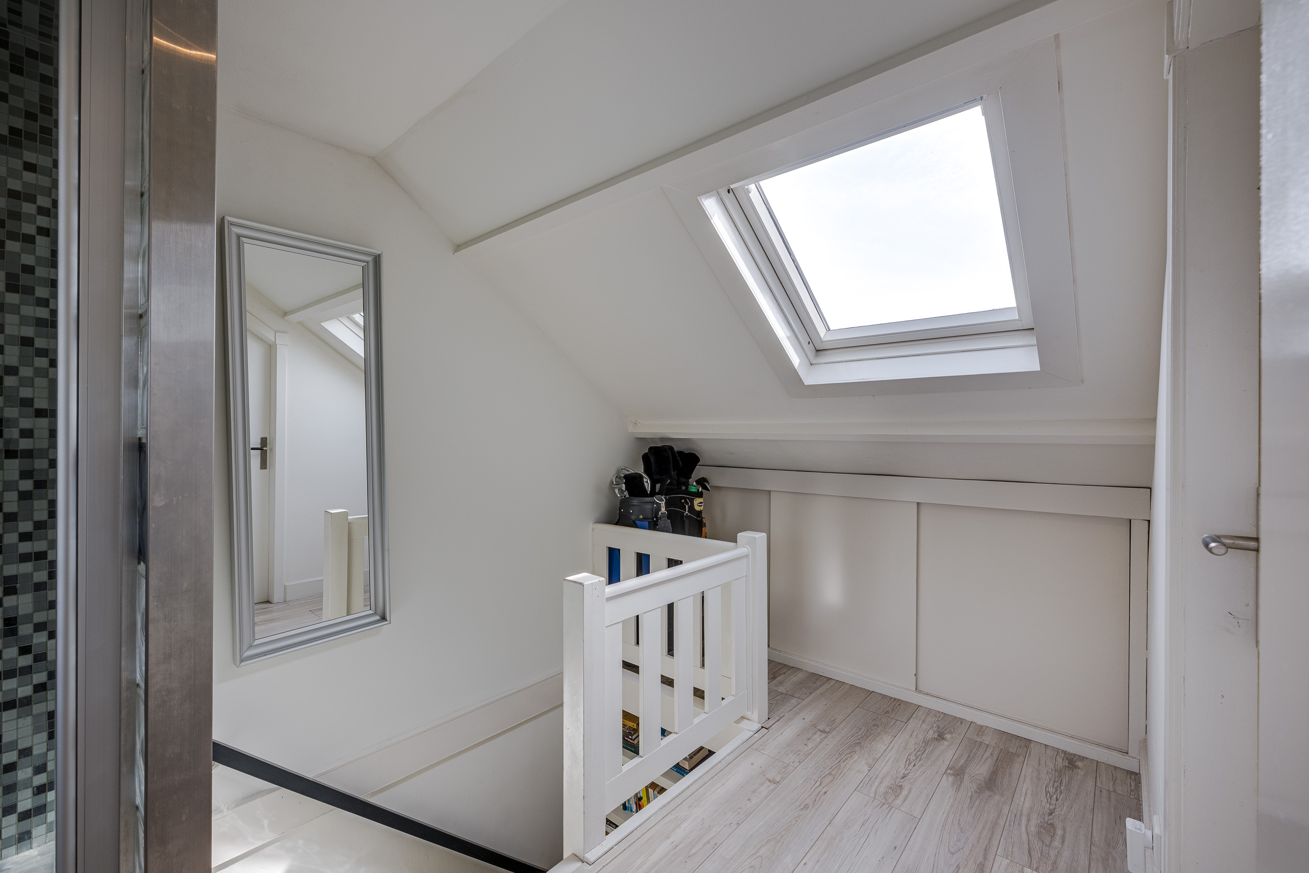 2e verdieping: overloop met bergruimte, 2e badkamer met douche en wastafel, deur naar grote slaapkamer waar je weer op eenvoudige wijze twee slaapkamers van kunt maken. Deze zolderkamer beschikt over twee dakkapellen.