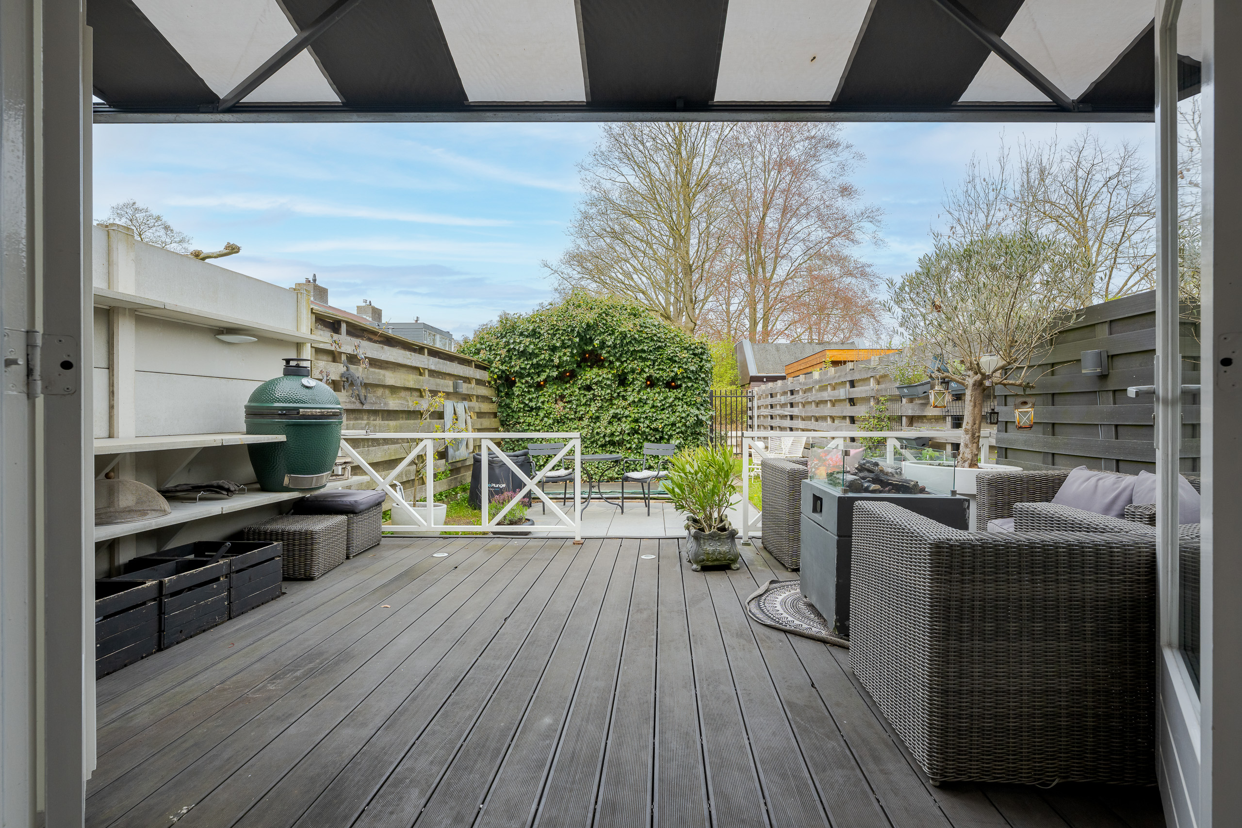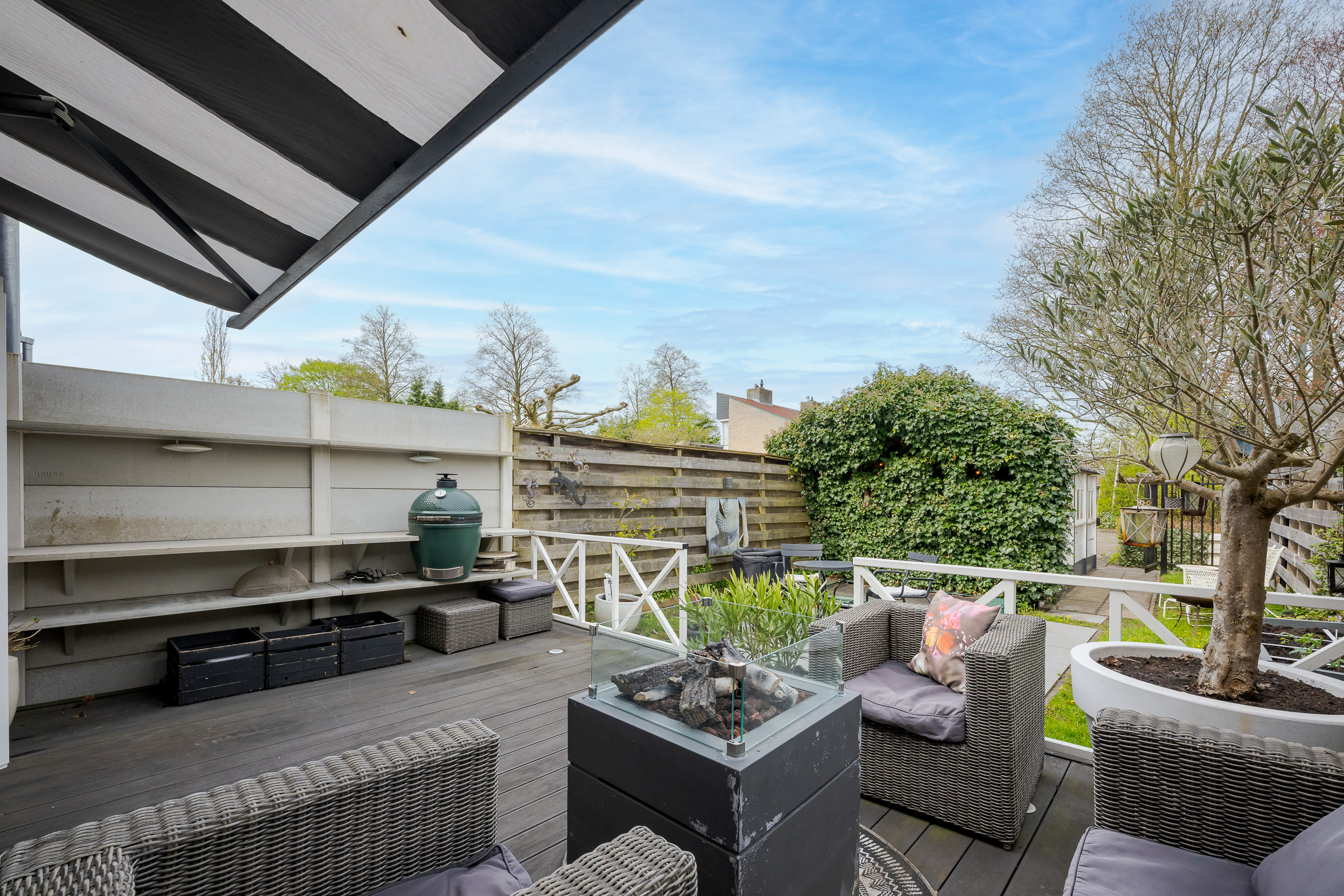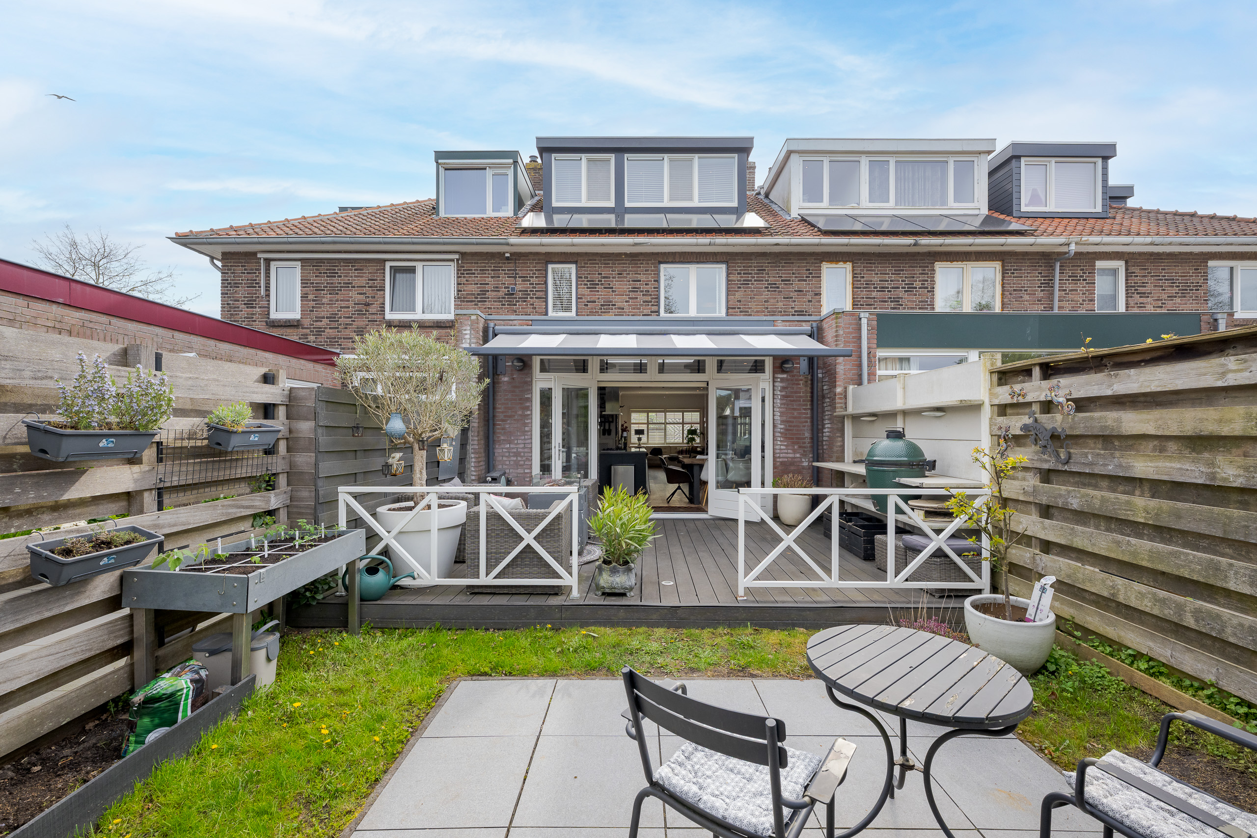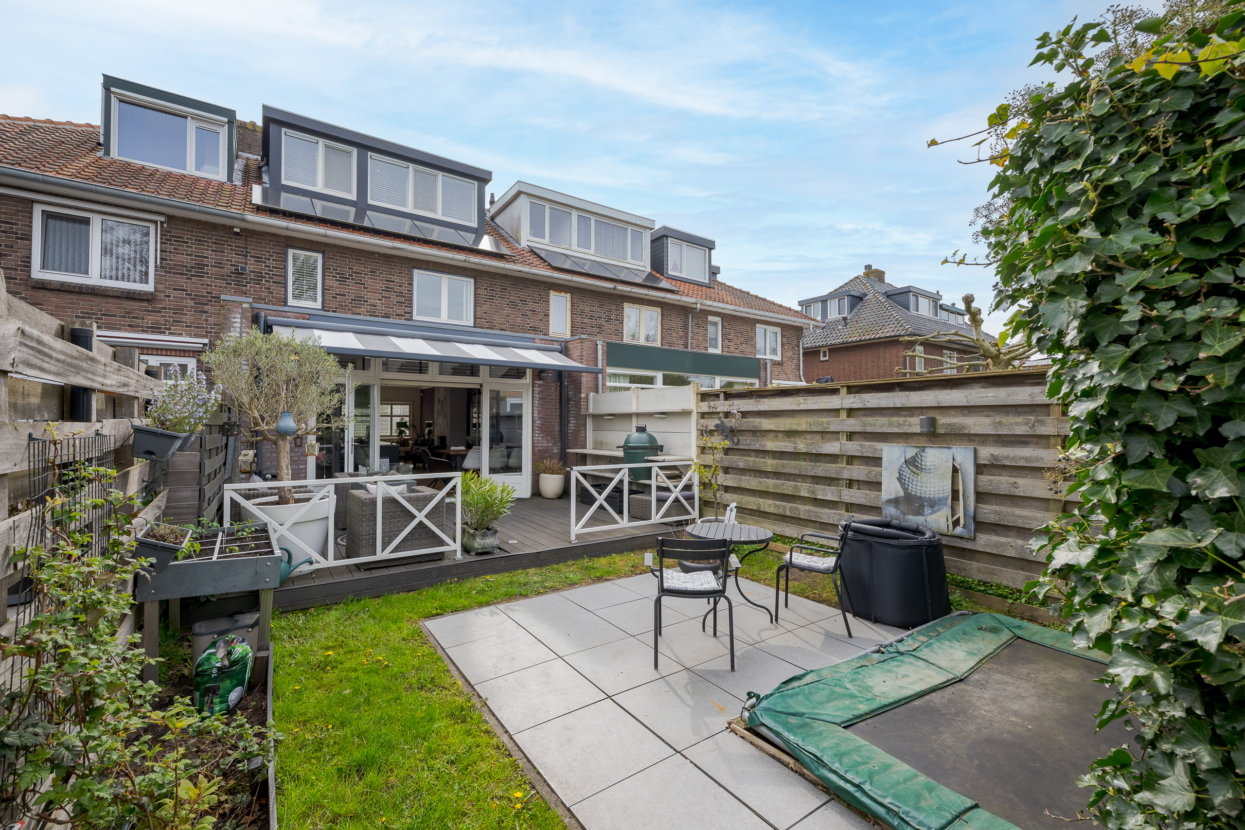 De diepe en fraai aangelegde achtertuin biedt volop privacy en zon. Hier vind je een heerlijk terras met buitenkeuken. Dit is dé plek om lange zomeravonden door te brengen met familie en vrienden.