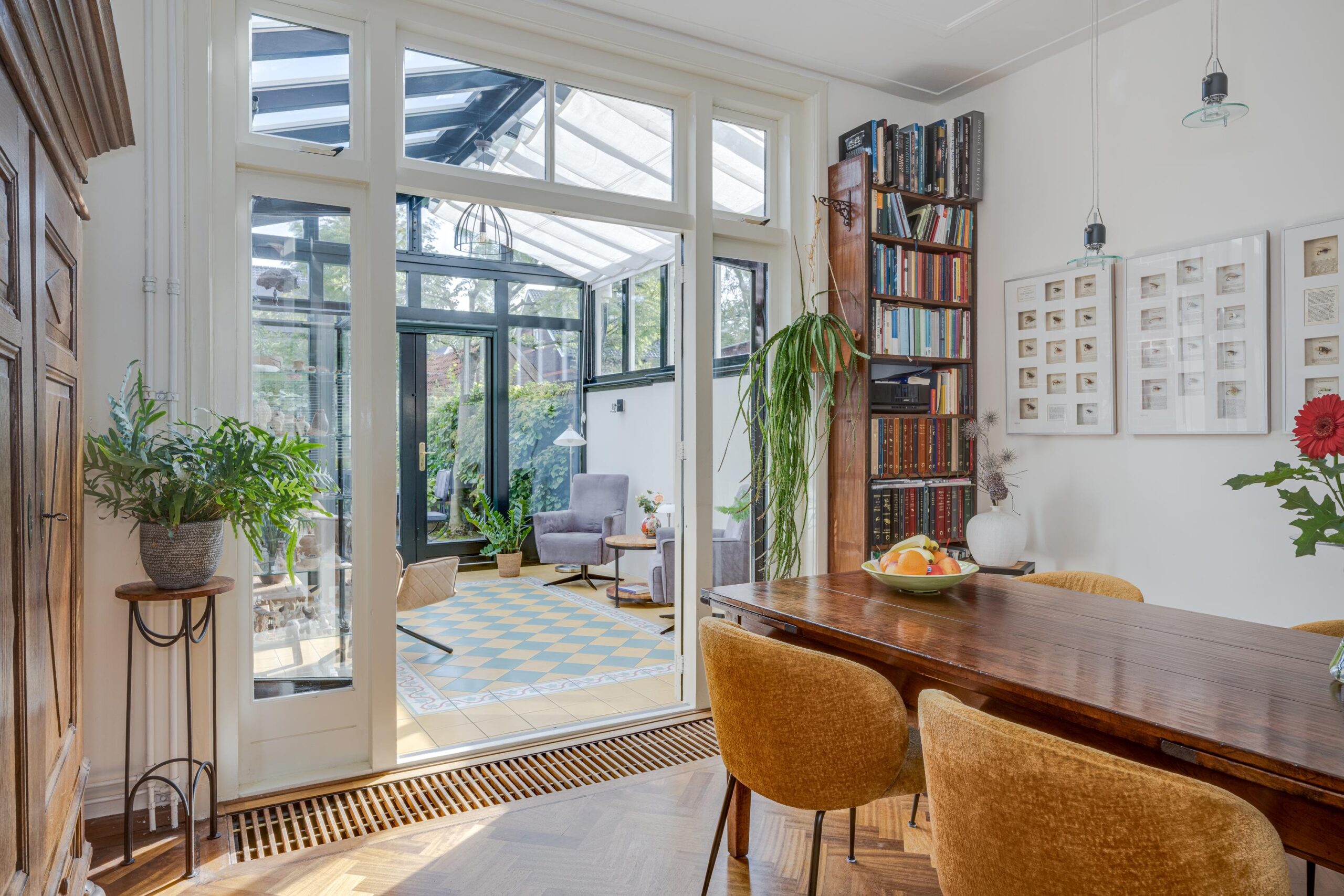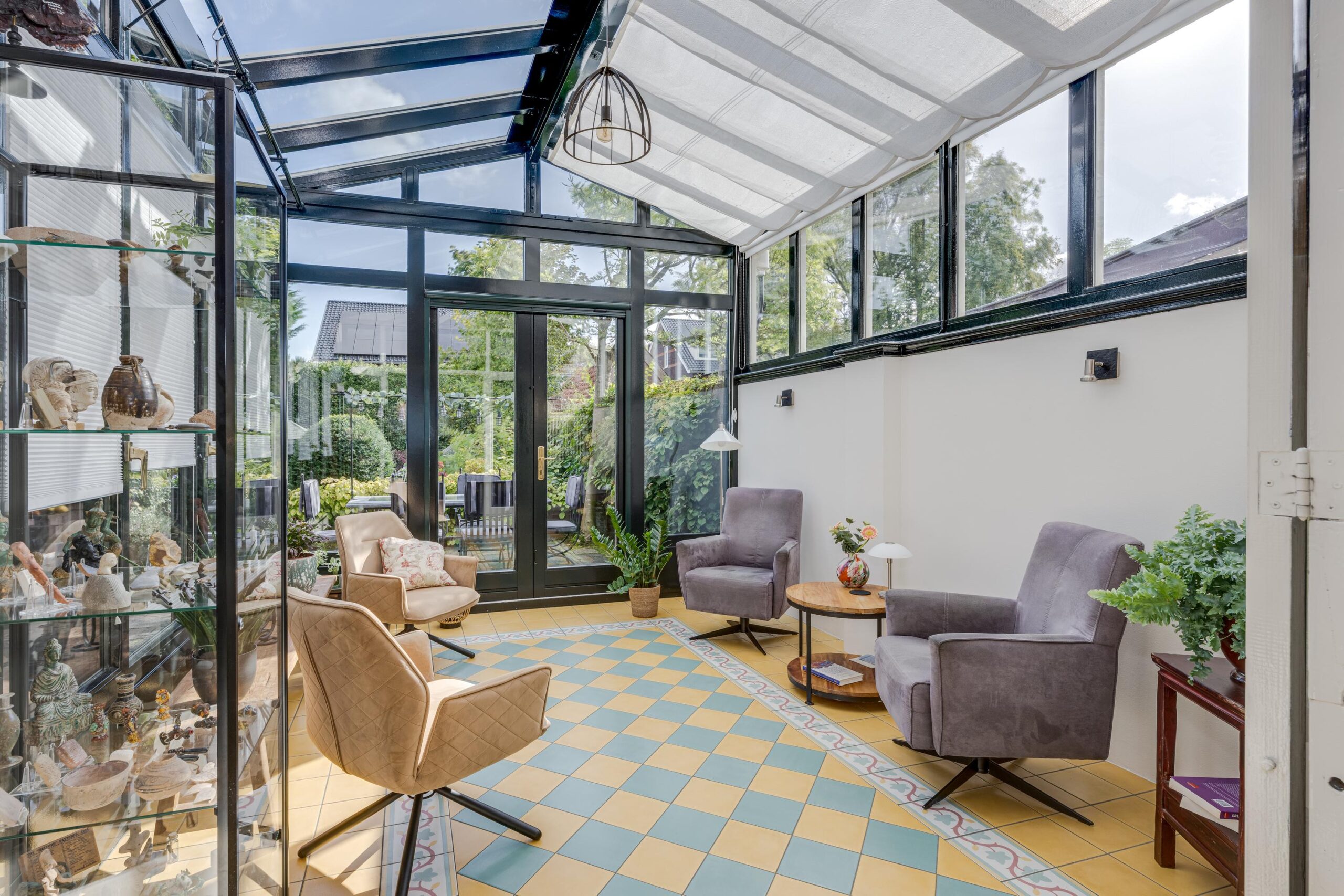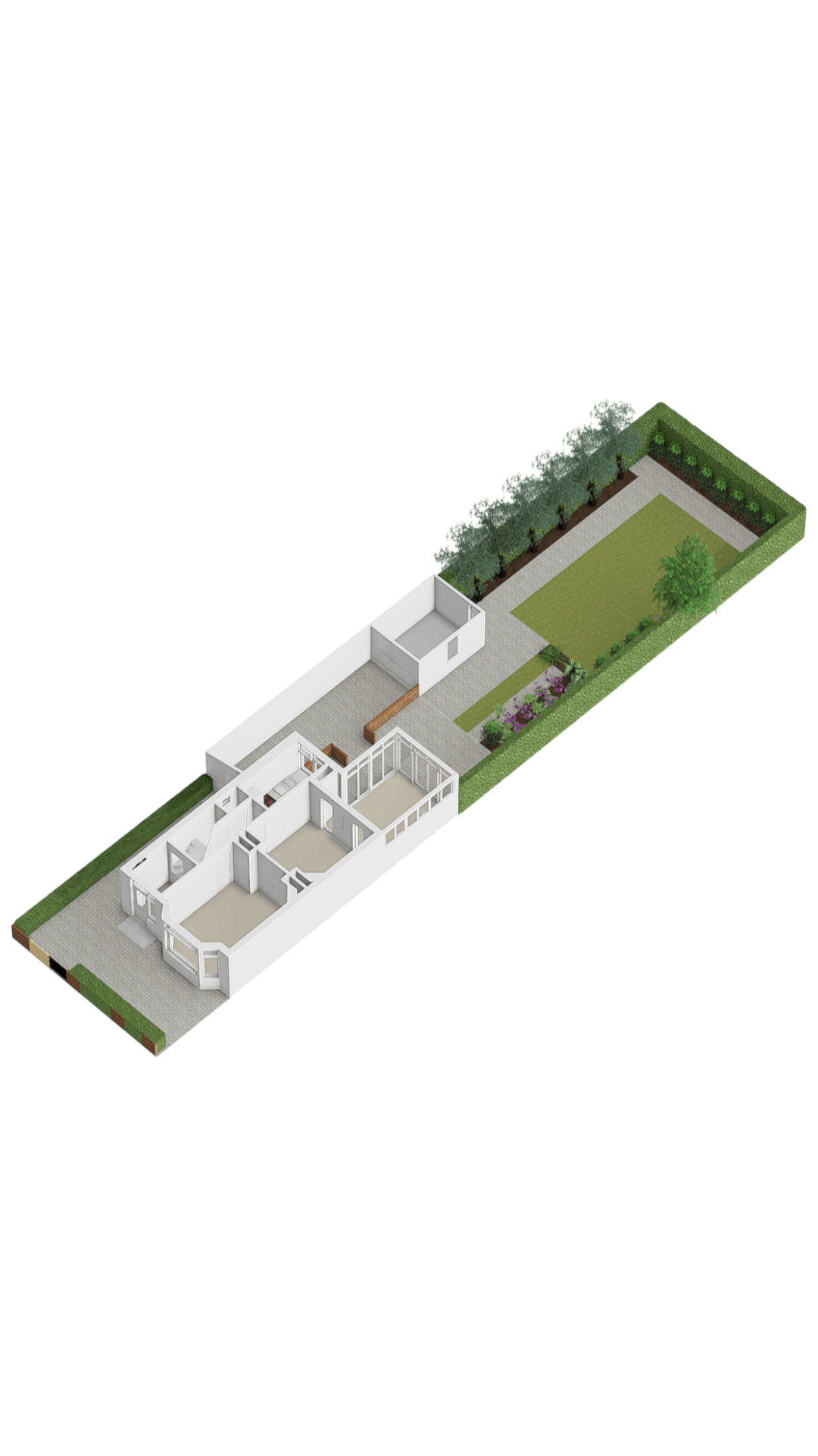 voortuin, voordeur, entree woning, vestibule met meterkast, deur naar de hal met trap naar bovengelegen verdieping, toilet en deur naar de voorkamer. kamer en suite met deur doorgang naar de prachtige aangebouwde (volledig geïsoleerde) serre. deuren naar de prachtige achtertuin. In de achtertuin bevindt zich de garage / berging.