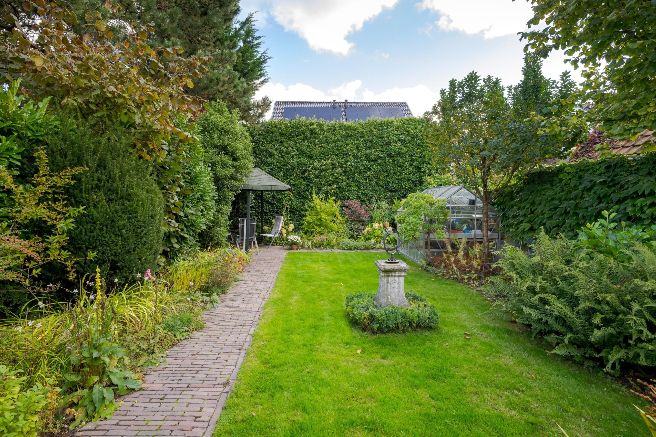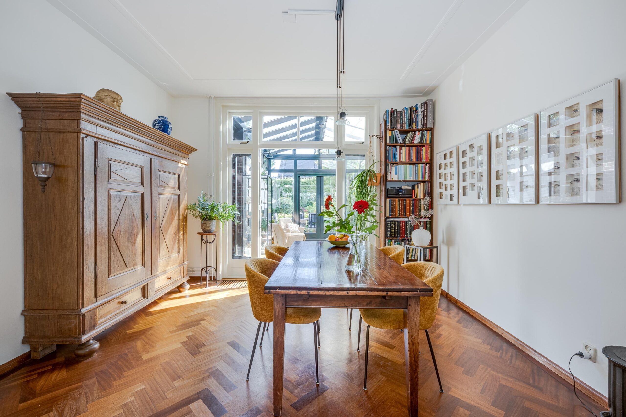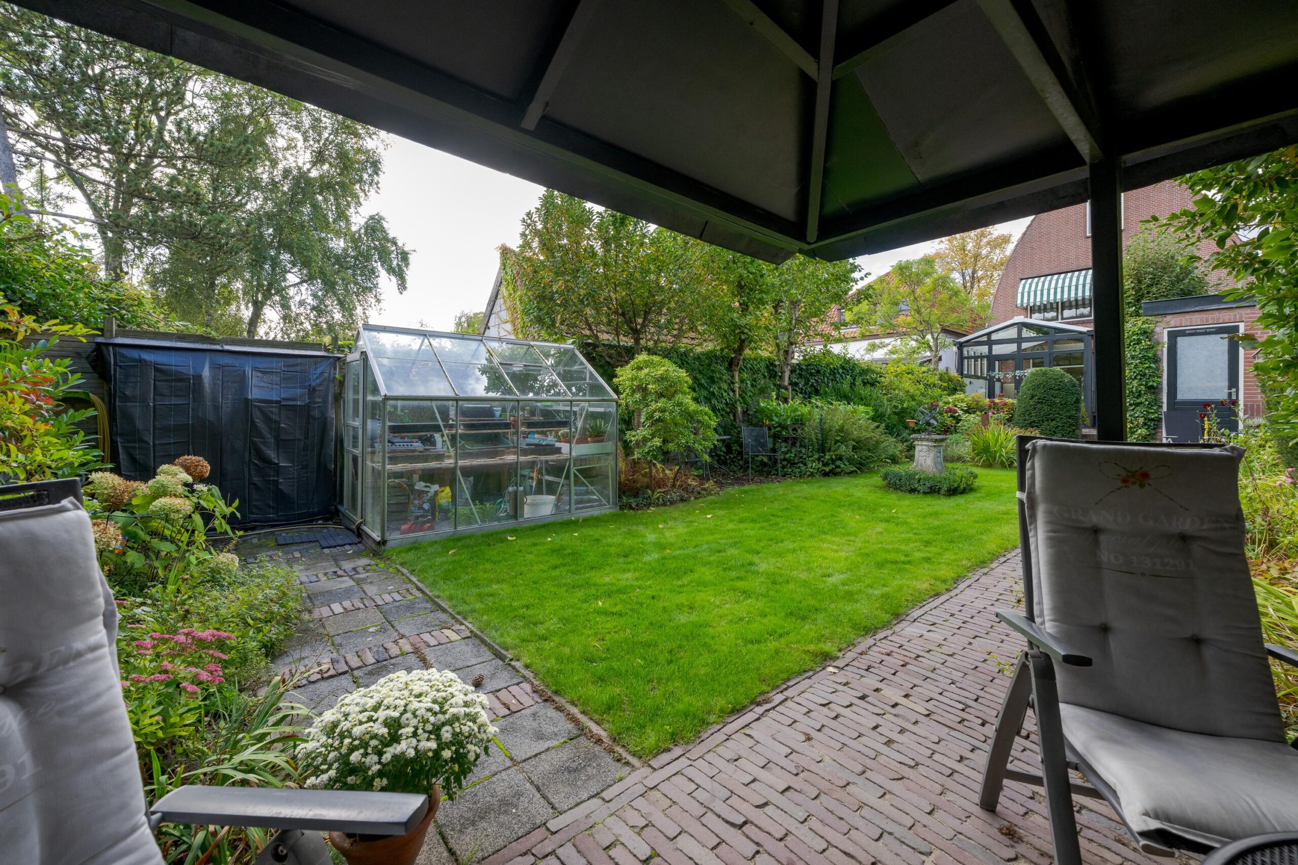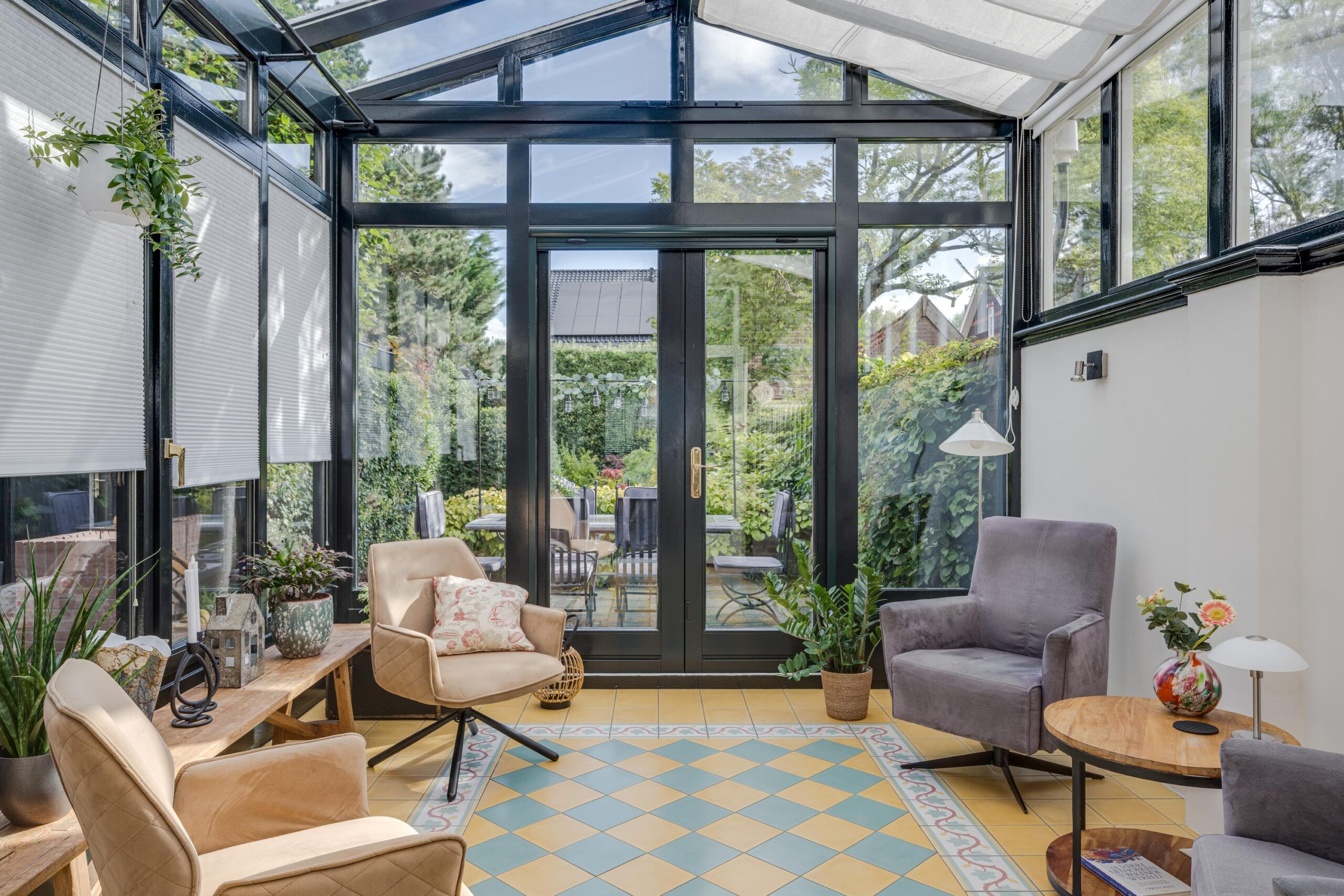 voortuin, voordeur, entree woning, vestibule met meterkast, deur naar de hal met trap naar bovengelegen verdieping, toilet en deur naar de voorkamer. kamer en suite met deur doorgang naar de prachtige aangebouwde (volledig geïsoleerde) serre. deuren naar de prachtige achtertuin. In de achtertuin bevindt zich de garage / berging.