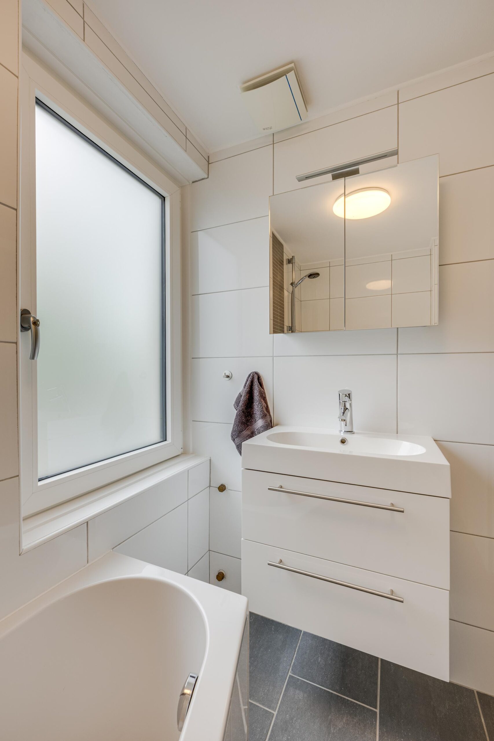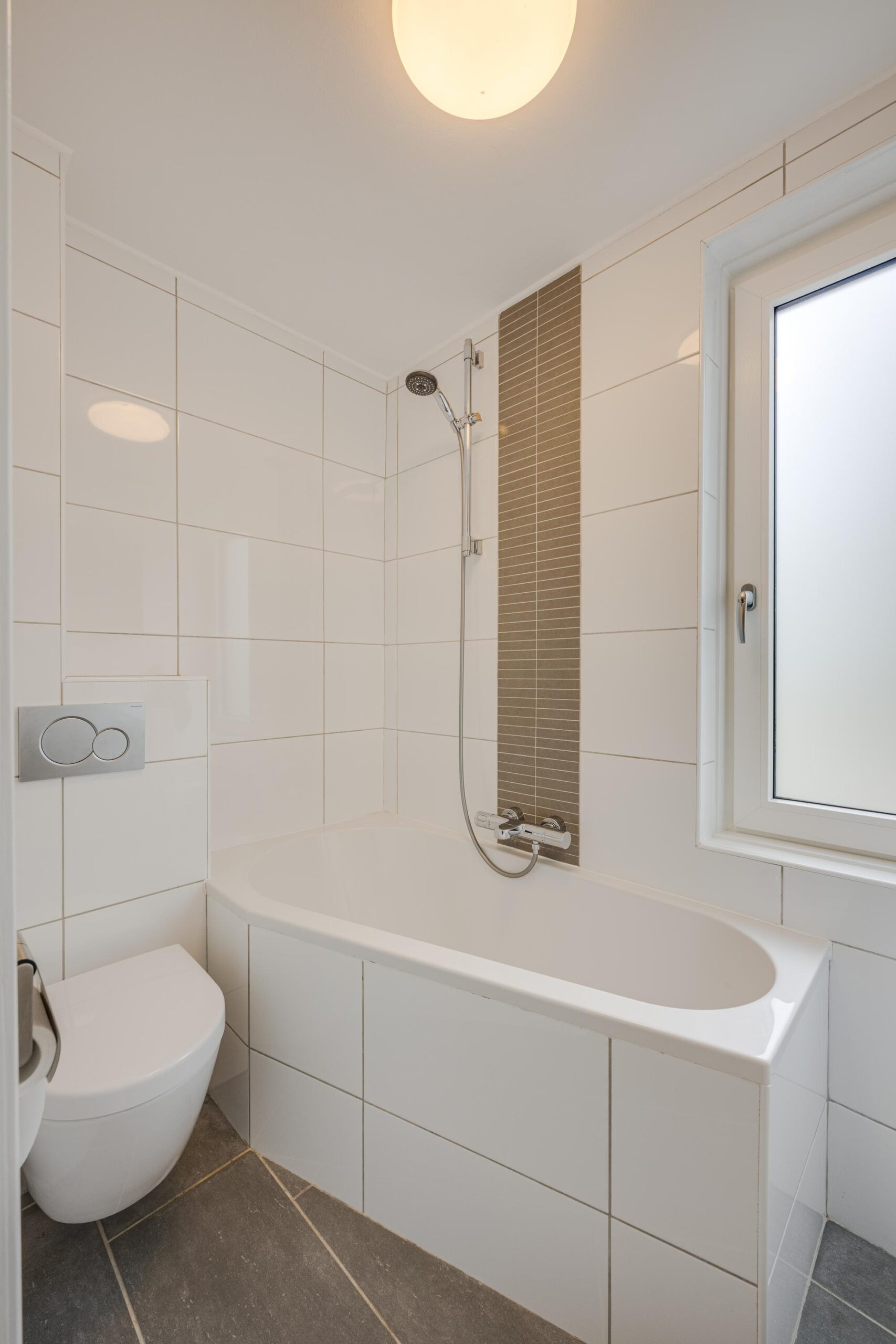 Overloop biedt toegang tot de trap naar de tweede verdieping, badkamer voorzien van bad, toilet en wastafel. Er zijn drie slaapkamers op de eerste verdieping. Twee slaapkamers bevinden zich aan de achterzijde van de woning en bieden uitzicht op de tuin.