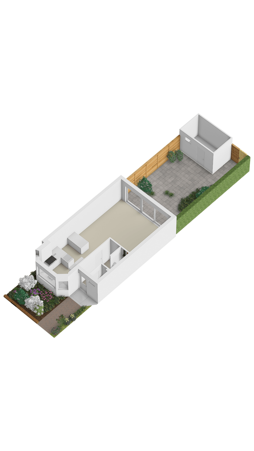 Entree, meterkast in de trapkast, modern toilet met fontein, trap naar eerste verdieping. Deur naar lichte doorzon woonkamer en een moderne open keuken aan de voorzijde van de woning. De woonkamer met haard in de aanbouw aan de achterzijde van de woning geeft door middel van een grote schuifpui toegang tot de tuin. De tuin beschikt over een stenen berging en een achterom.