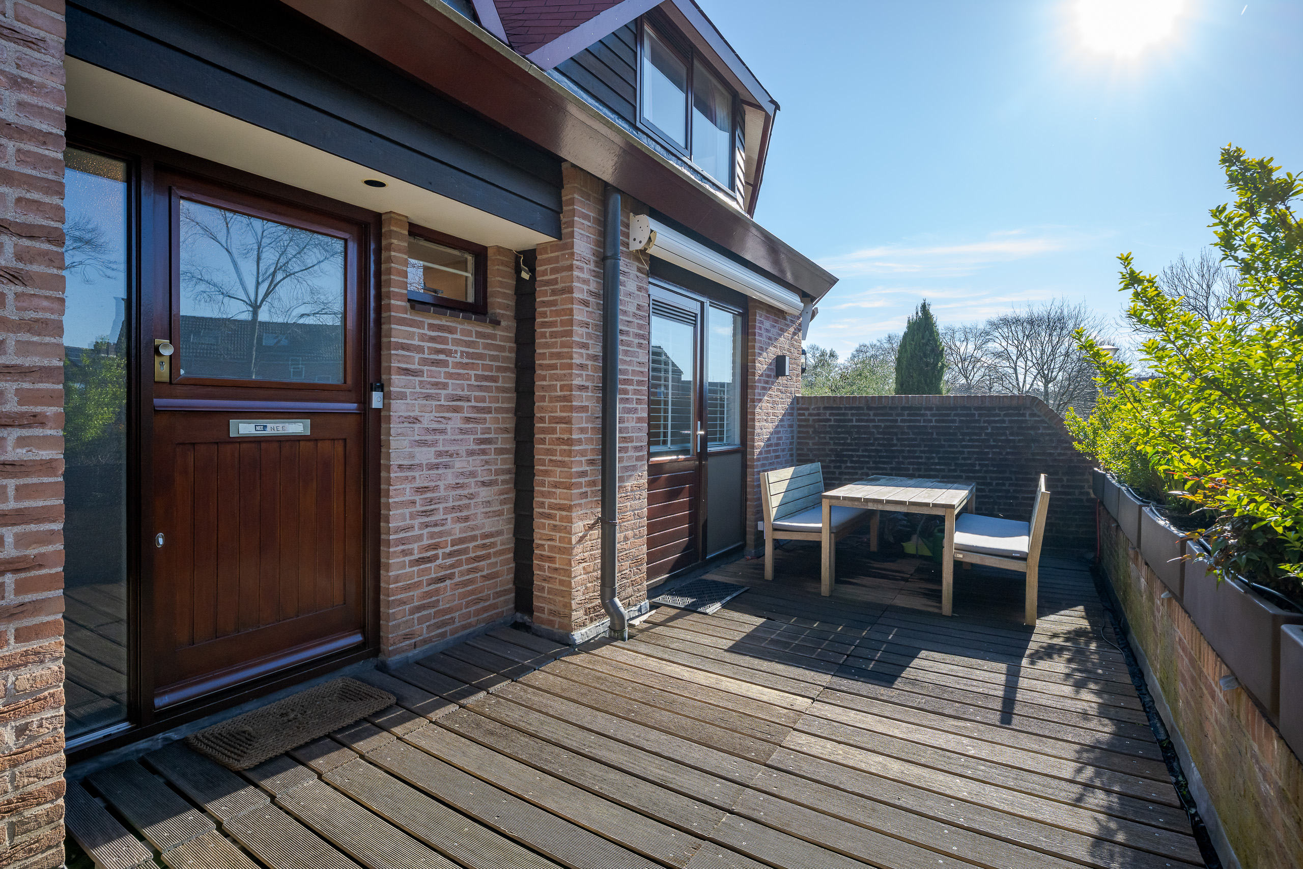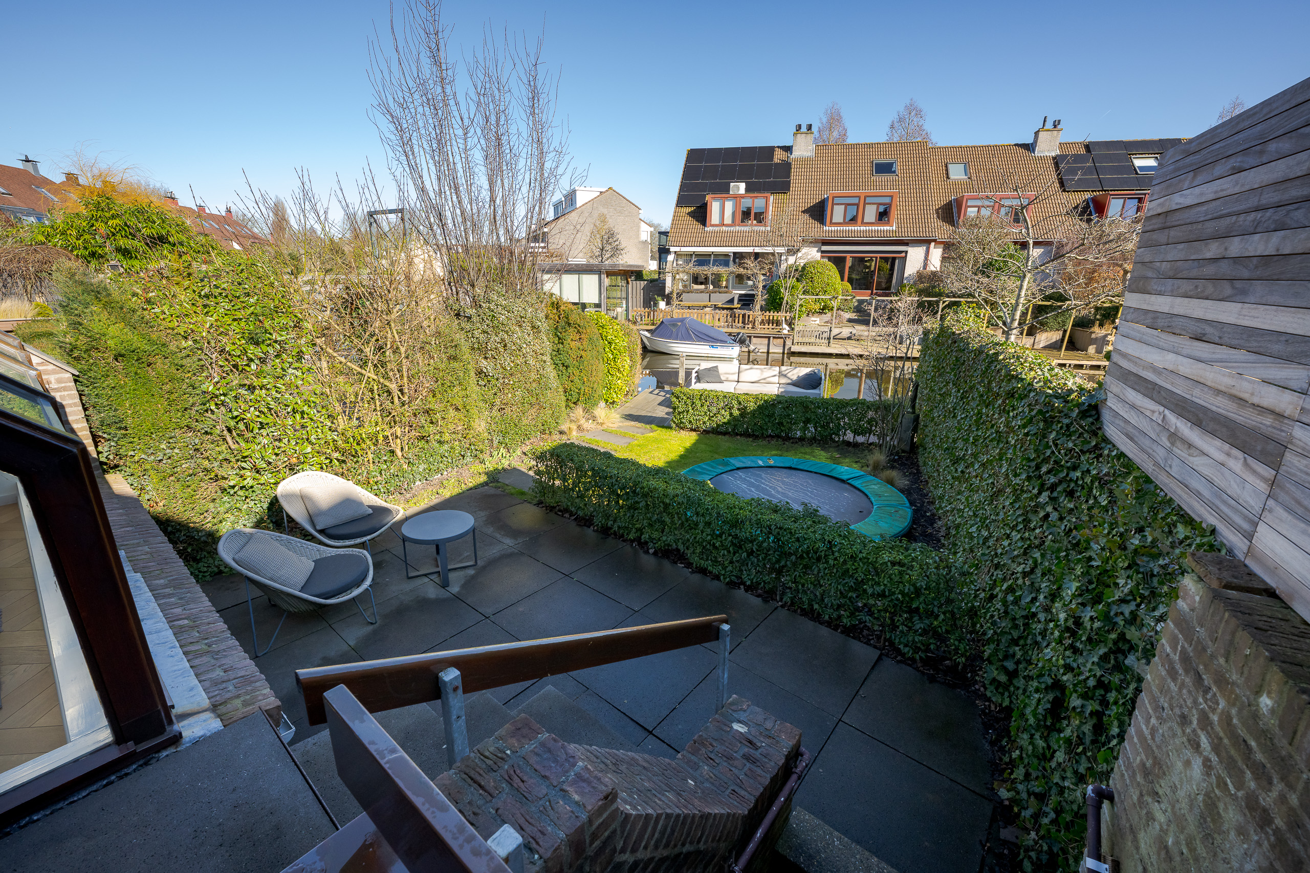 Entrance with modern toilet, spacious study at the front, stairs to both the upper and lower floors, modern kitchen with access to the terrace at the front, cozy living room, sliding doors to the sunny terrace and the beautifully landscaped backyard with two terraces and a hardwood deck with mooring space for a boat.