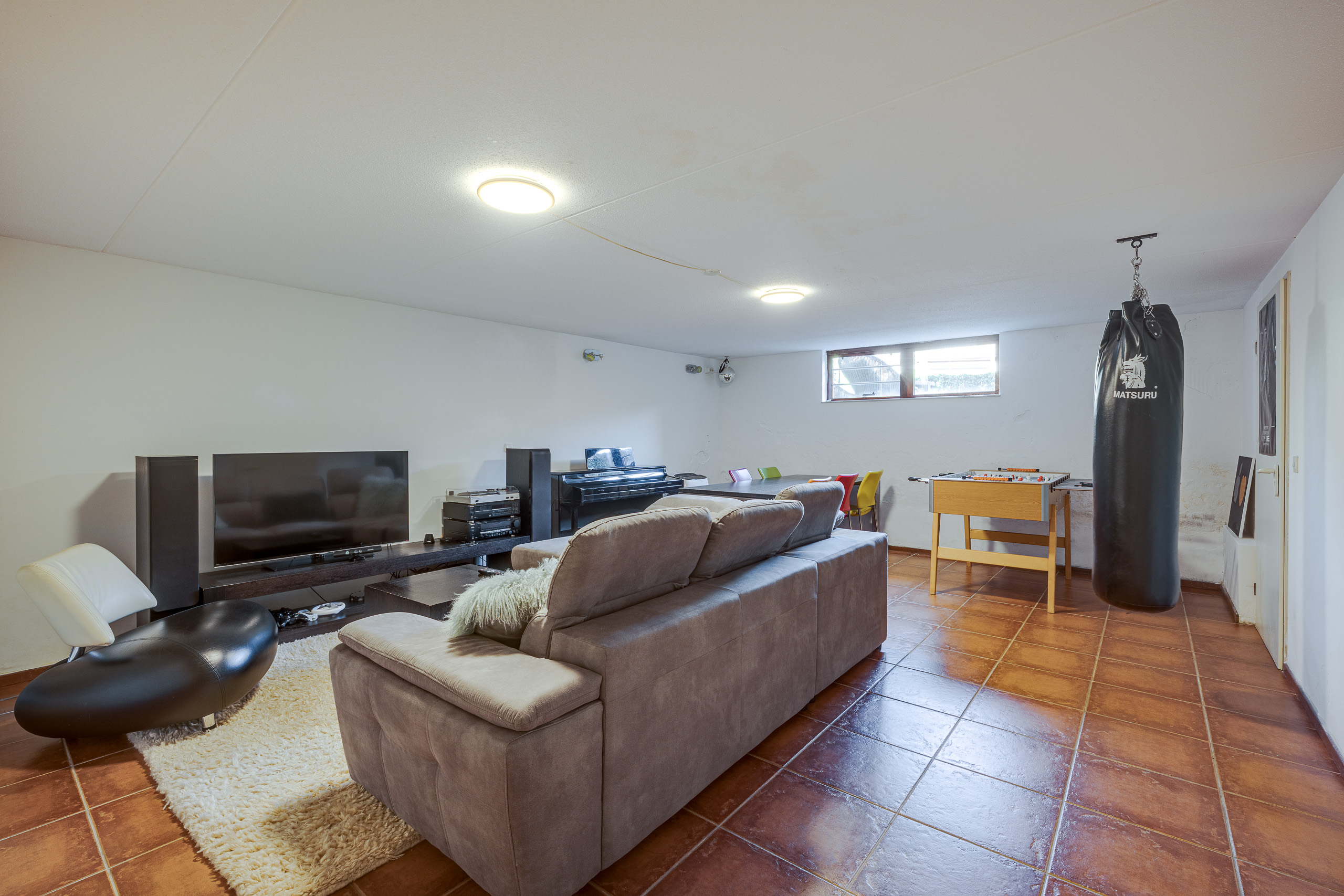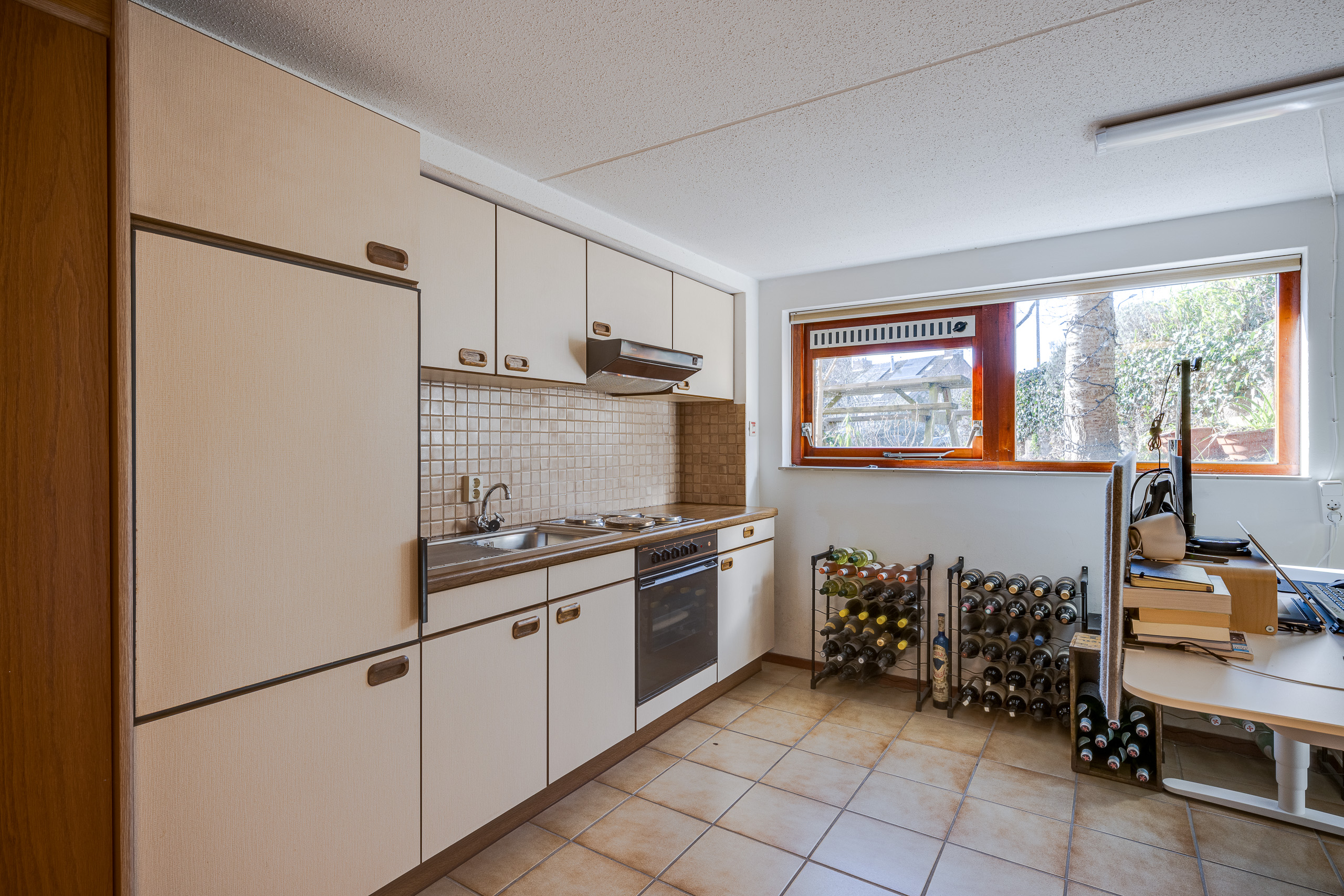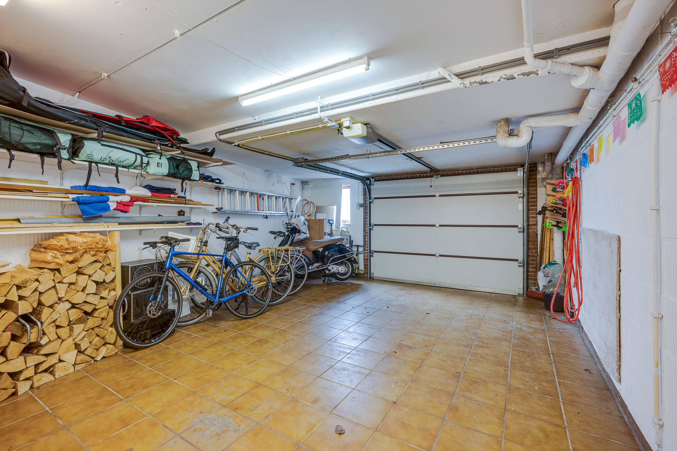 Complete apartment with private kitchen, bathroom and toilet, large hobby or multifunctional room (currently furnished as a chill-out room), storage room with access to the garage, spacious garage with space for a car, scooter and bicycles, laundry room and separate garden shed, direct access to the backyard via the garden shed.