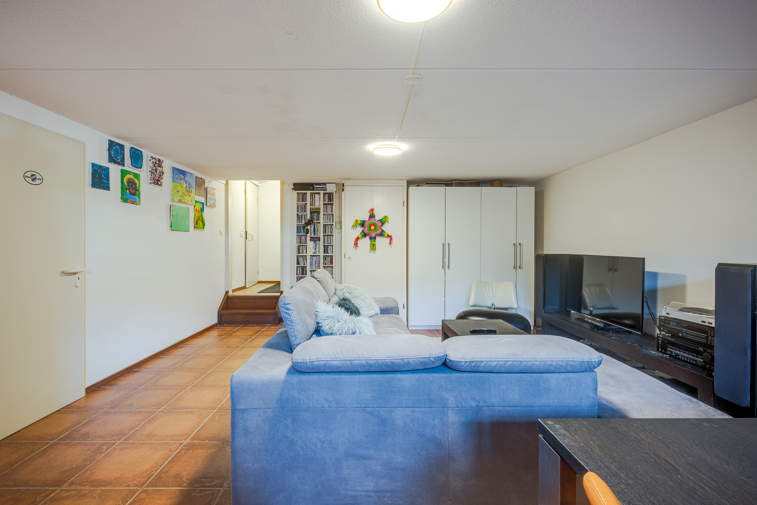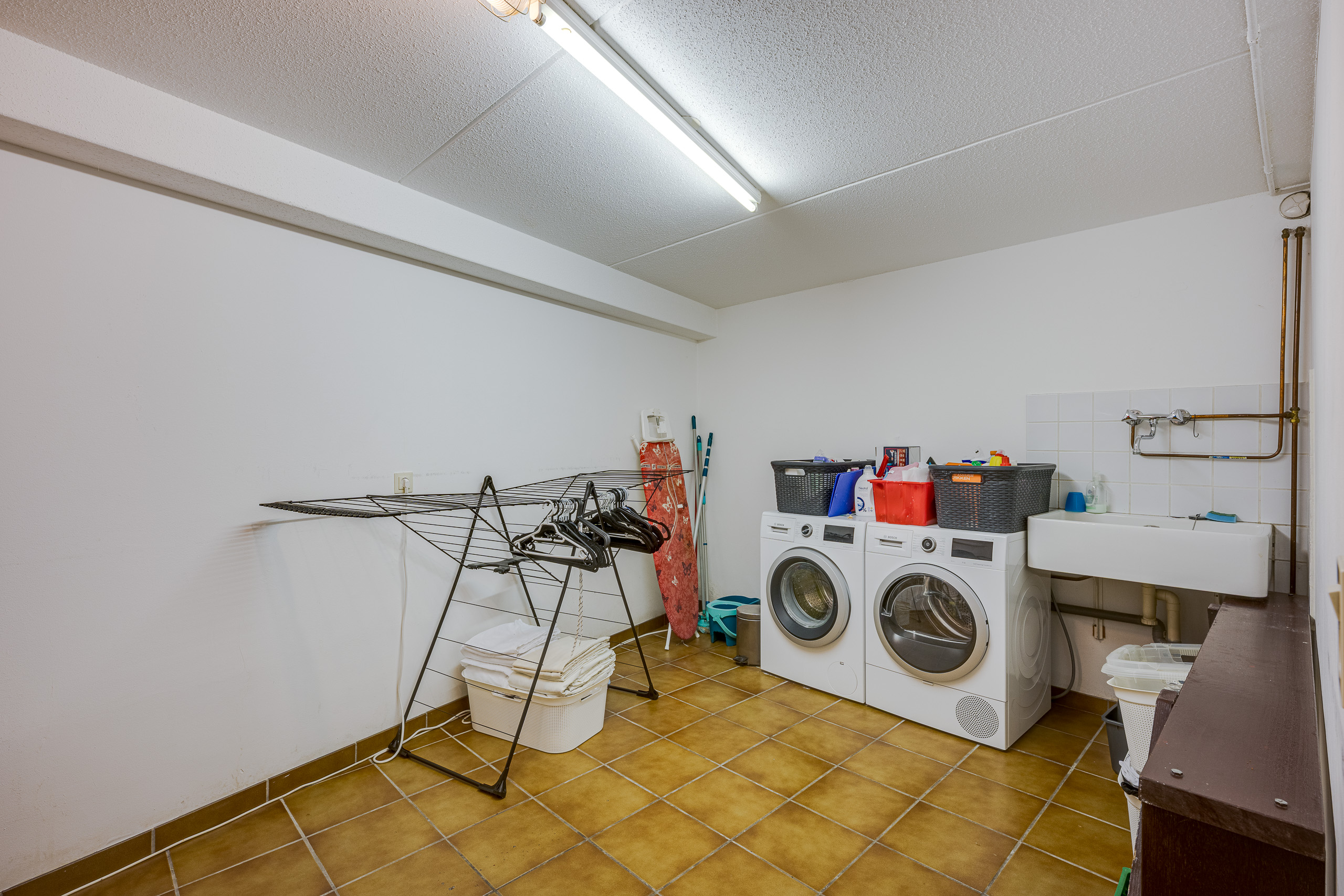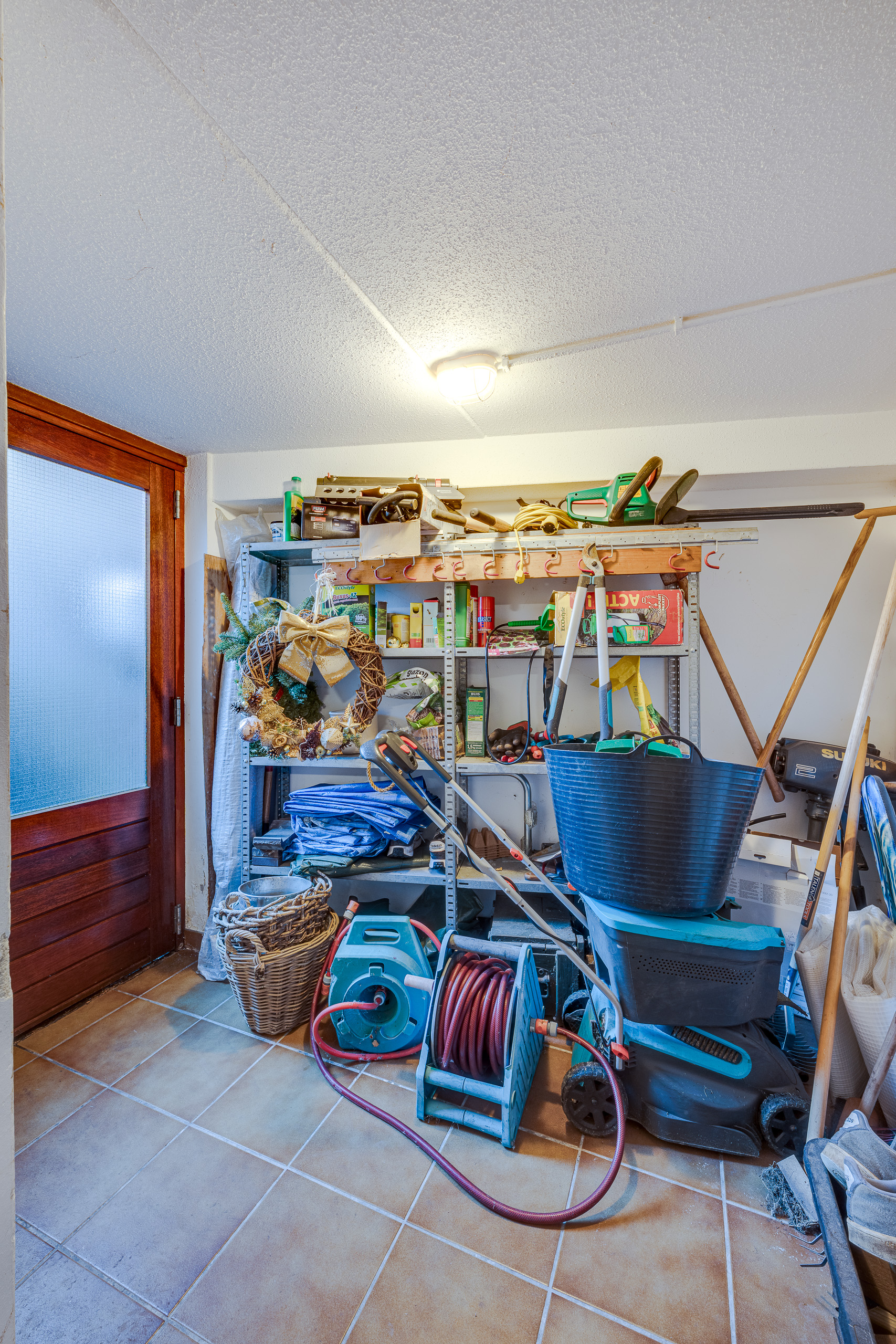 Complete apartment with private kitchen, bathroom and toilet, large hobby or multifunctional room (currently furnished as a chill-out room), storage room with access to the garage, spacious garage with space for a car, scooter and bicycles, laundry room and separate garden shed, direct access to the backyard via the garden shed.