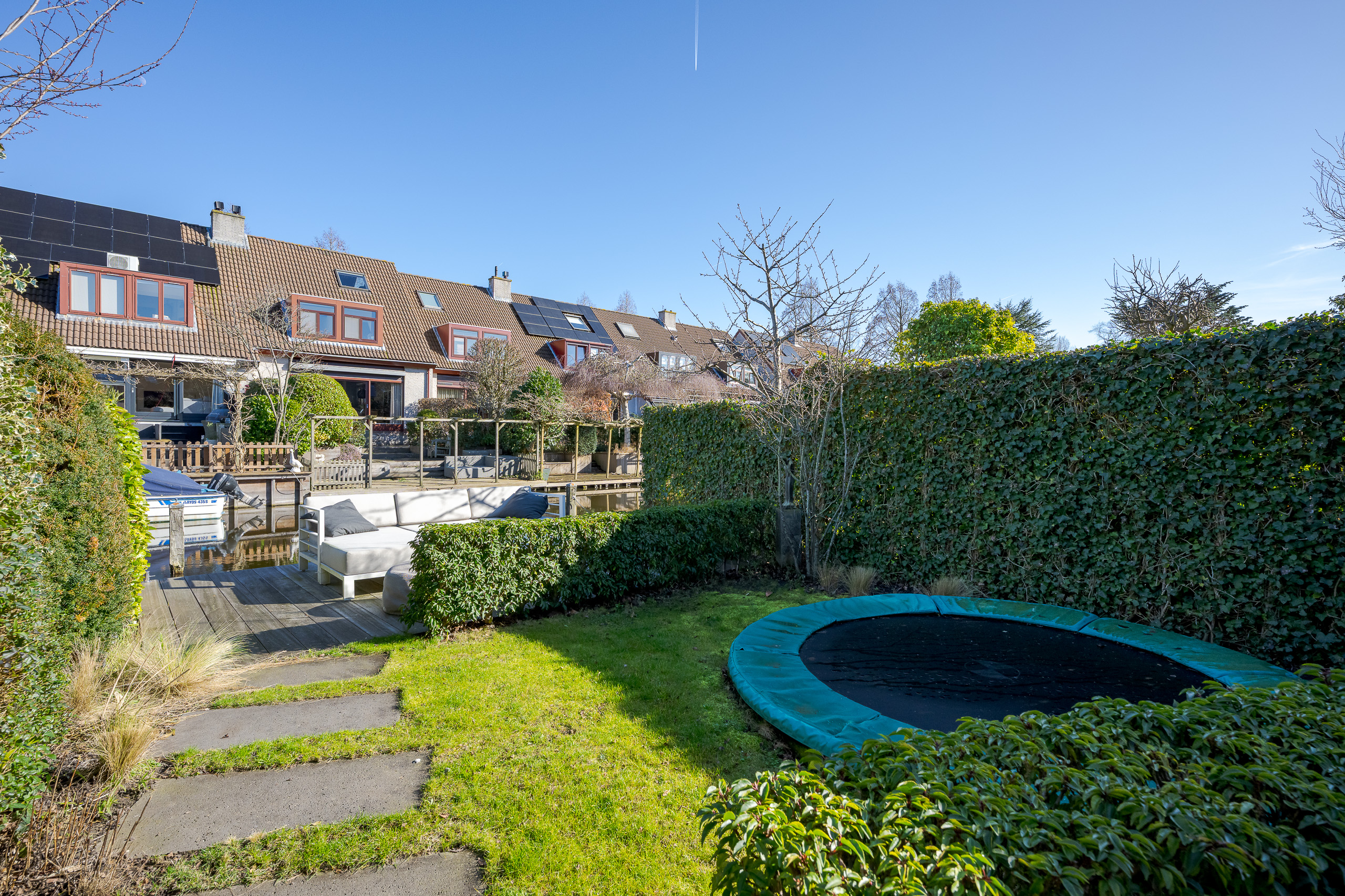 Entree met modern toilet, ruime werkkamer aan de voorzijde, trap naar zowel de boven- als benedenverdieping, moderne keuken met toegang tot het terras aan de voorzijde, sfeervolle woonkamer, schuifpui naar het zonnige terras en de fraai aangelegde achtertuin voorzien van twee terrassen en een hardhouten dek met aanlegplek voor een boot.