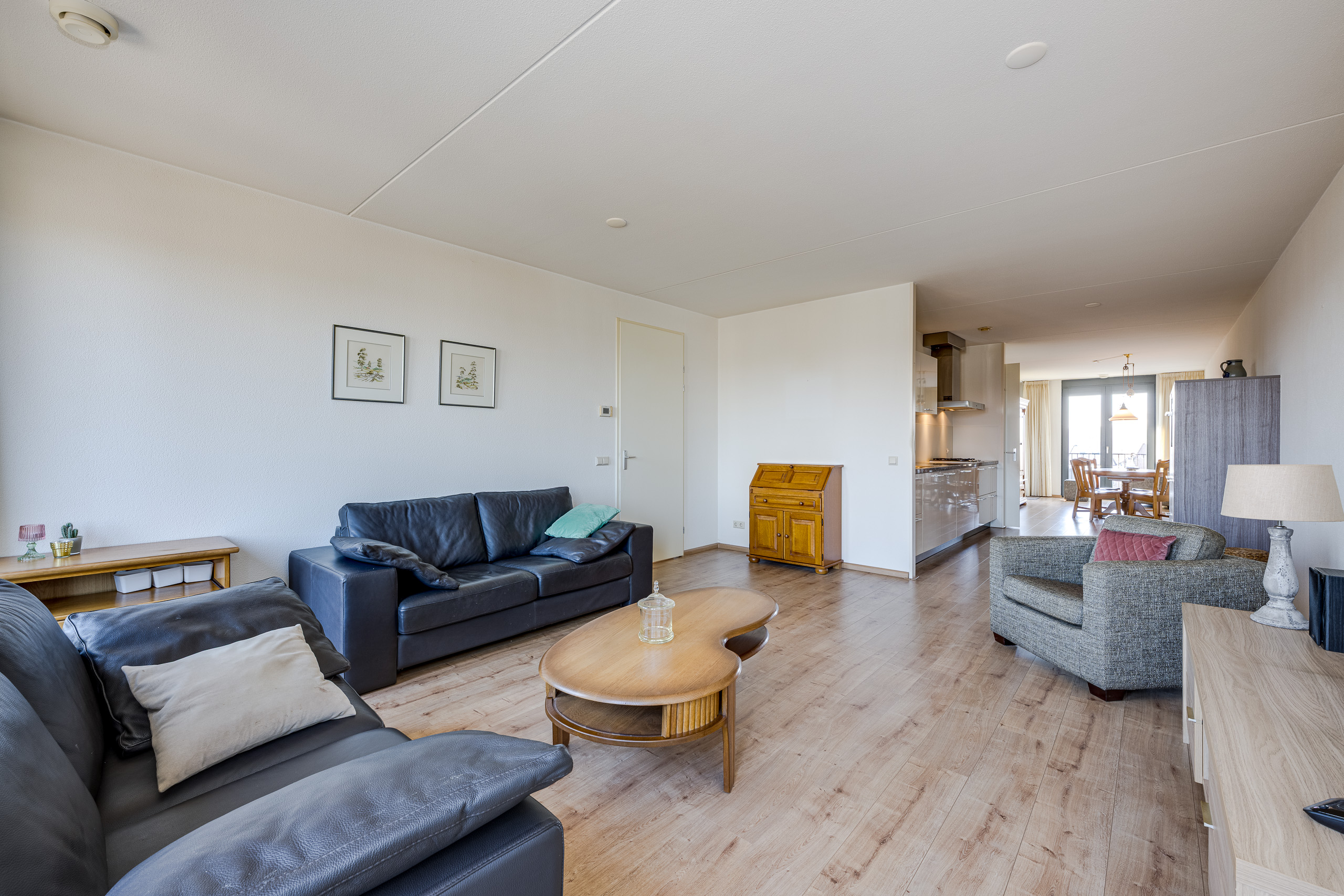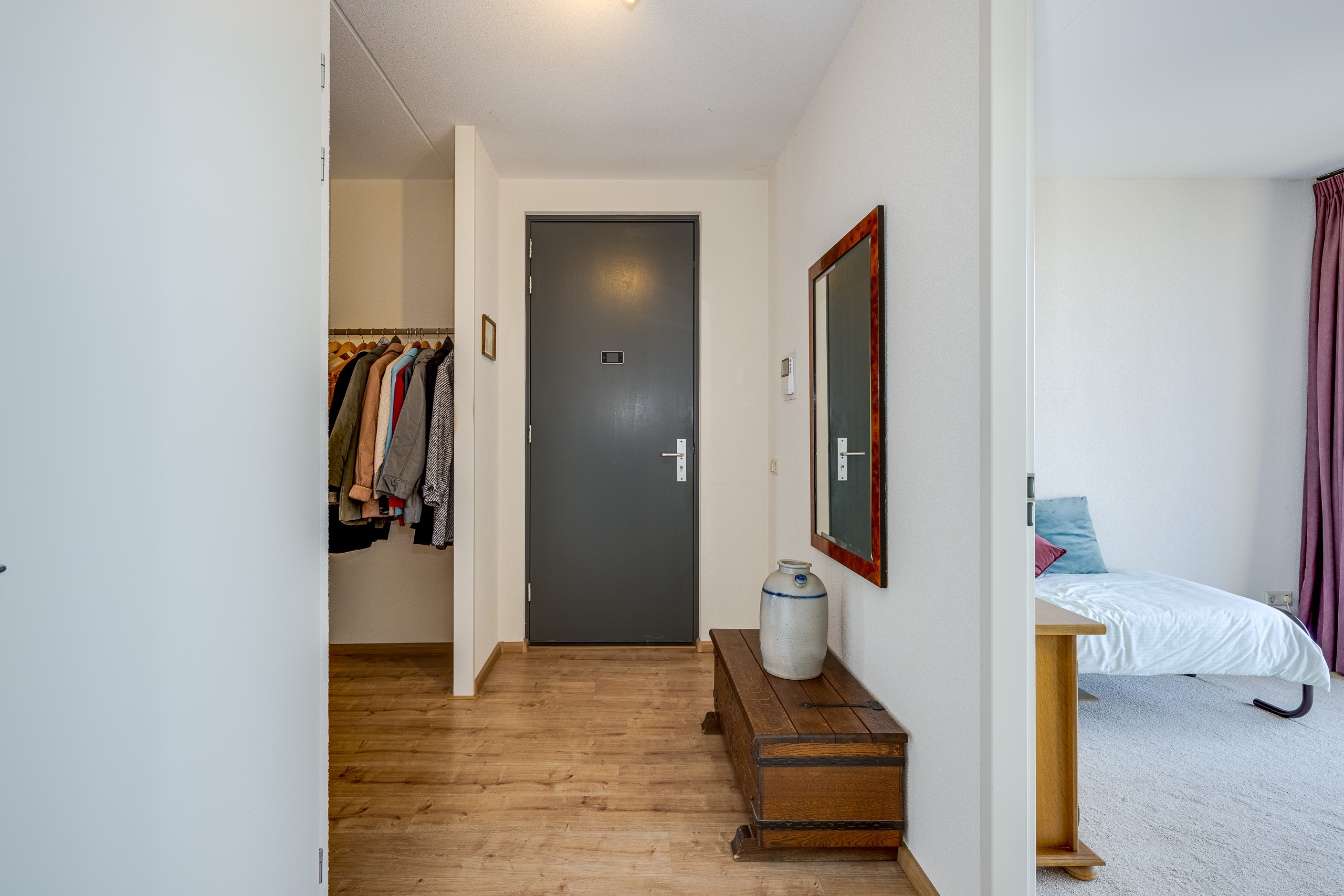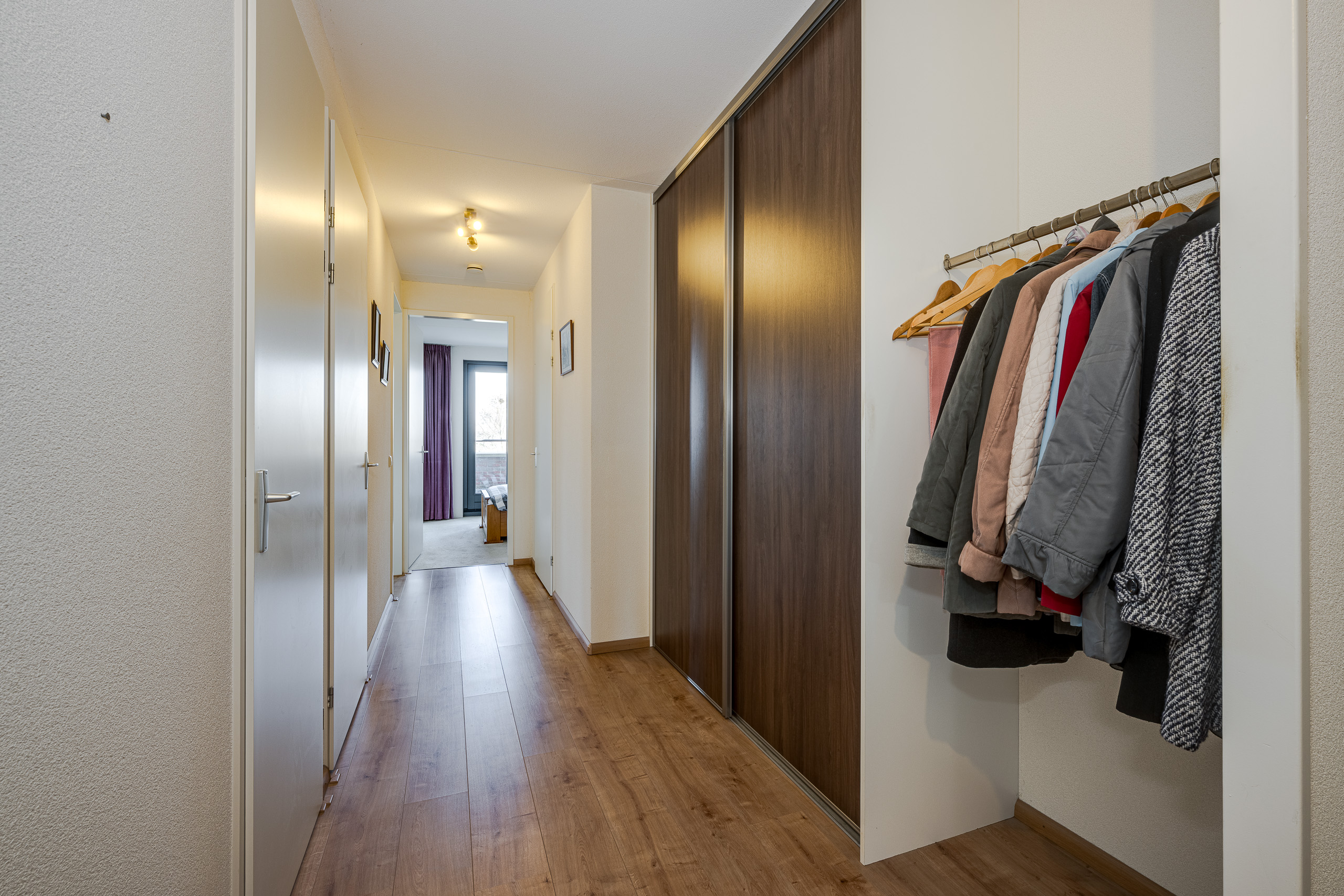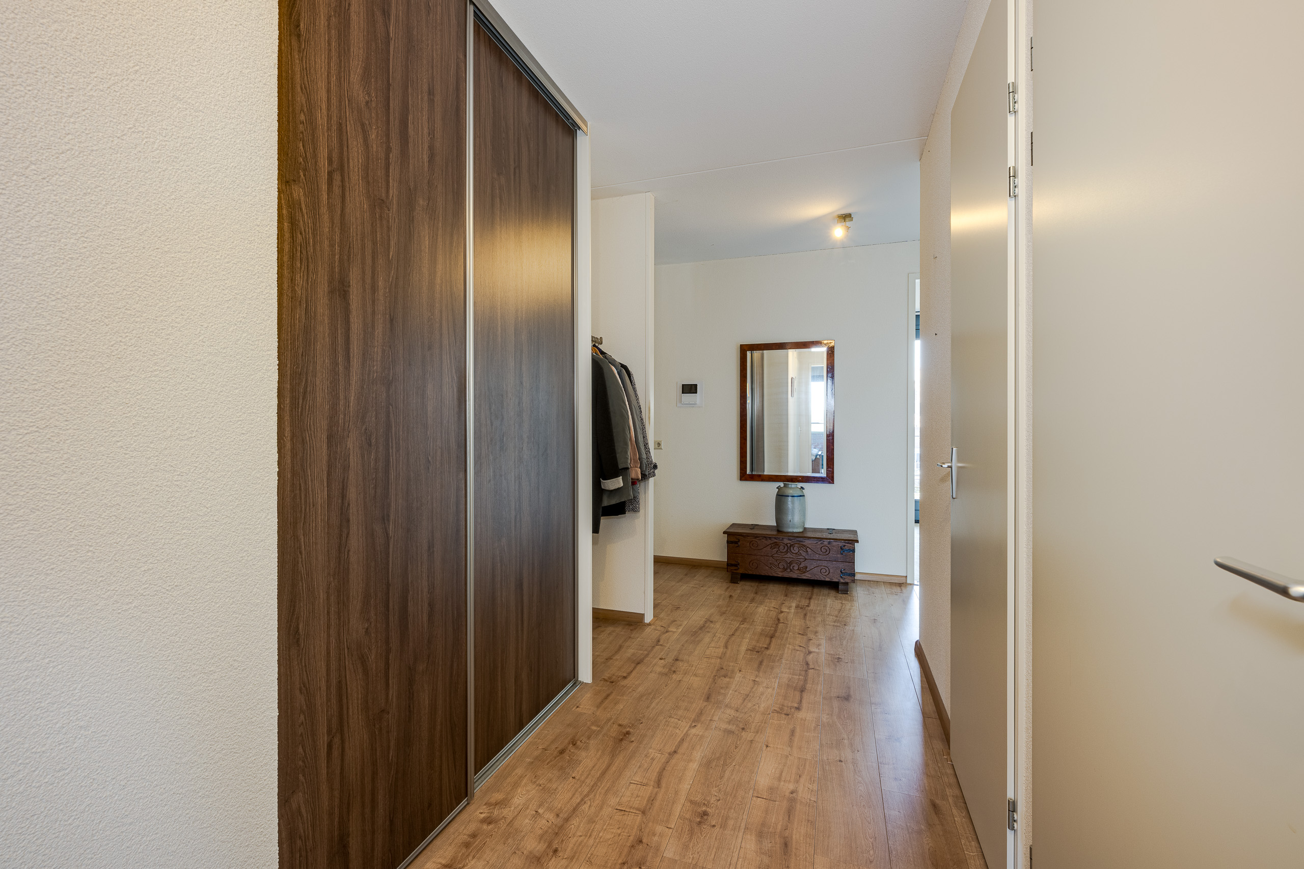 Centrale hal met garderobekasten, toegang tot twee ruime slaapkamers. Één slaapkamer en de eetkamer bieden toegang tot het balkon/terras op het zuidwesten. Toiletruimte met fonteintje. Meterkast. Inpandige berging met CV-combiketel Remeha HR 2010, wasmachine- en drogeraansluiting alsmede de mechanische ventilatie (WTW). Lichte badkamer met tegels tot aan het plafond, wastafel toilet en inloopdouche. Grote L-vormige woonkamer met naar buiten openslaande deuren die toegang geven tot het tweede balkon dat op het noordoosten ligt. Open keuken met inbouwapparatuur die de woonkamer met de eetkamer verbindt.