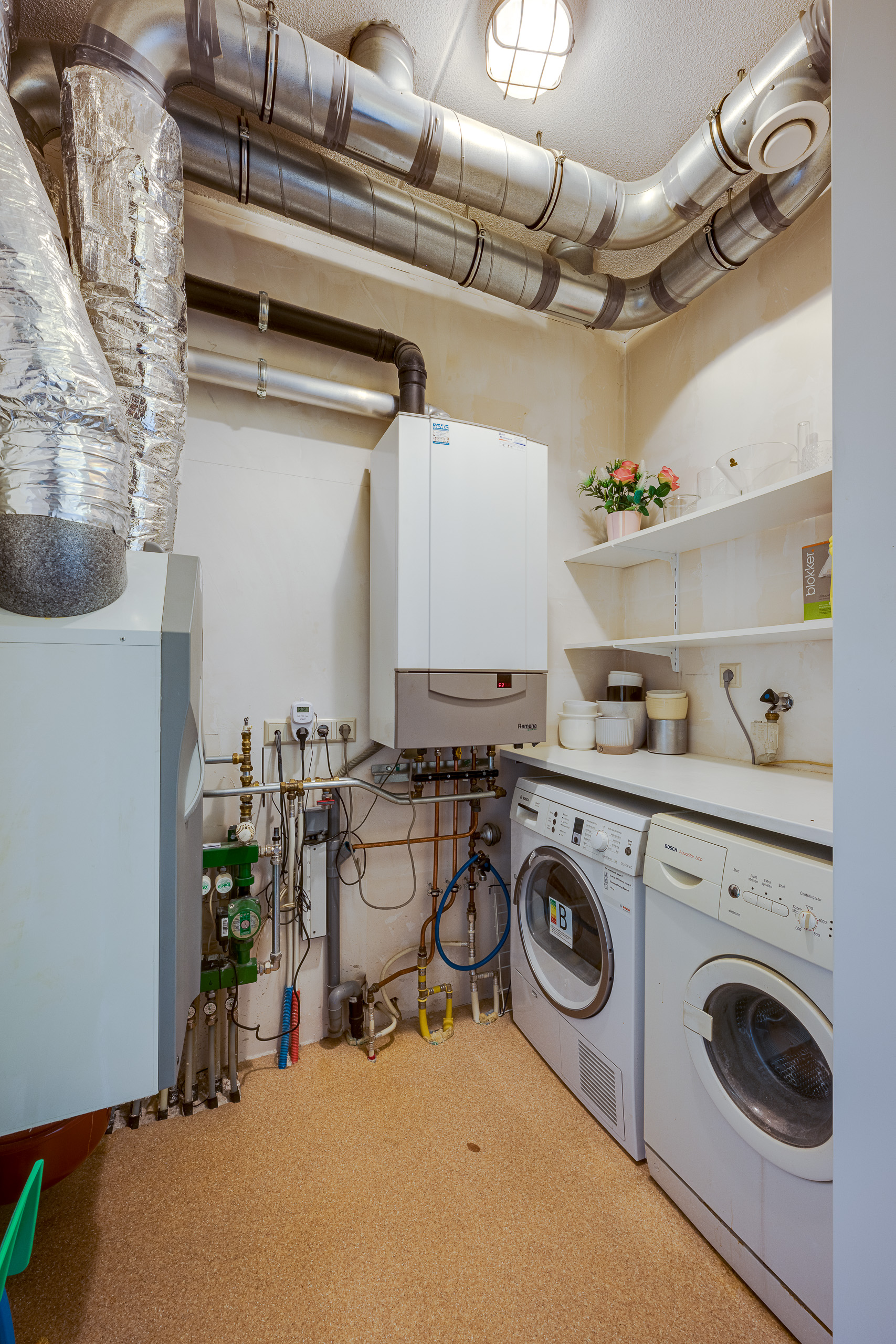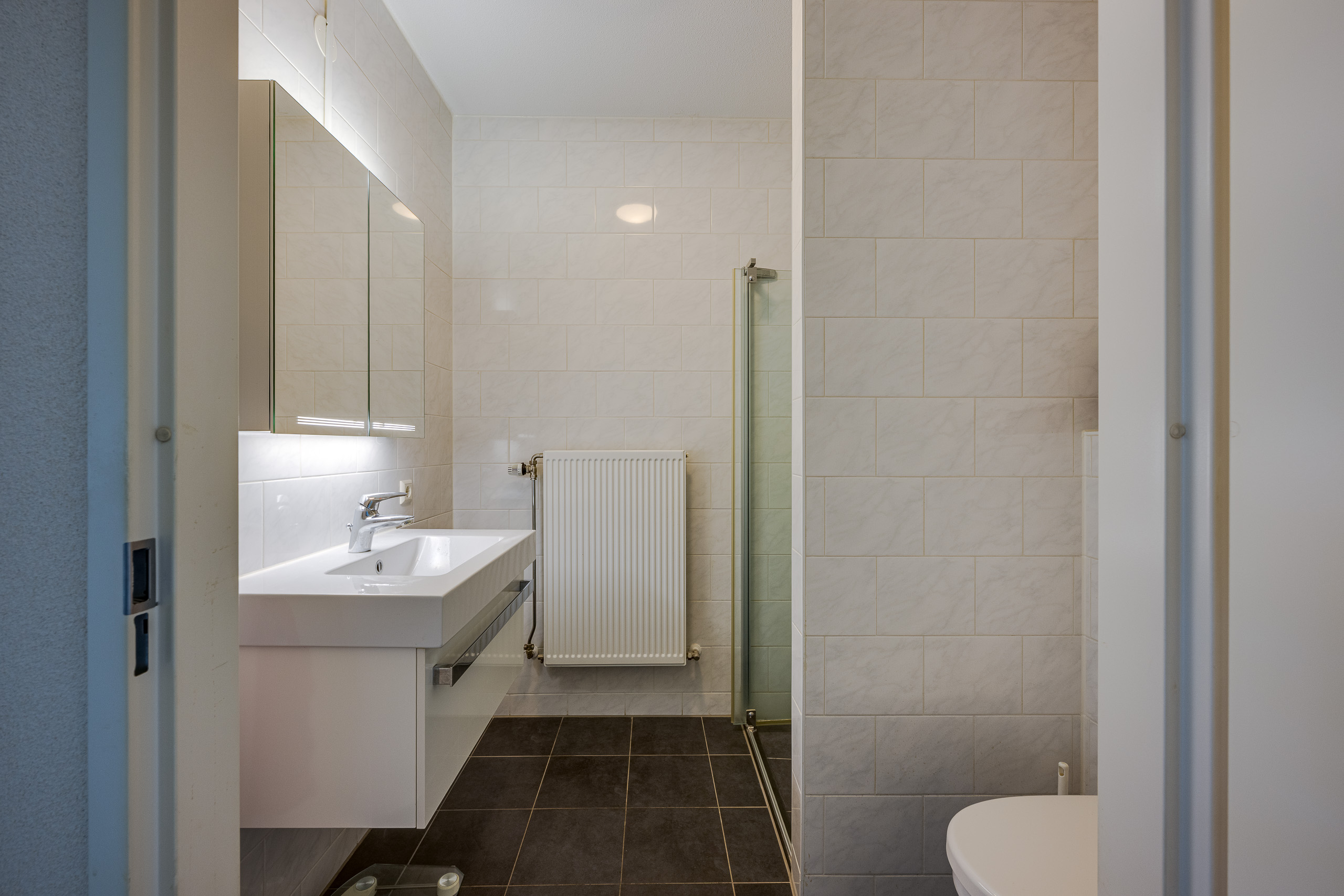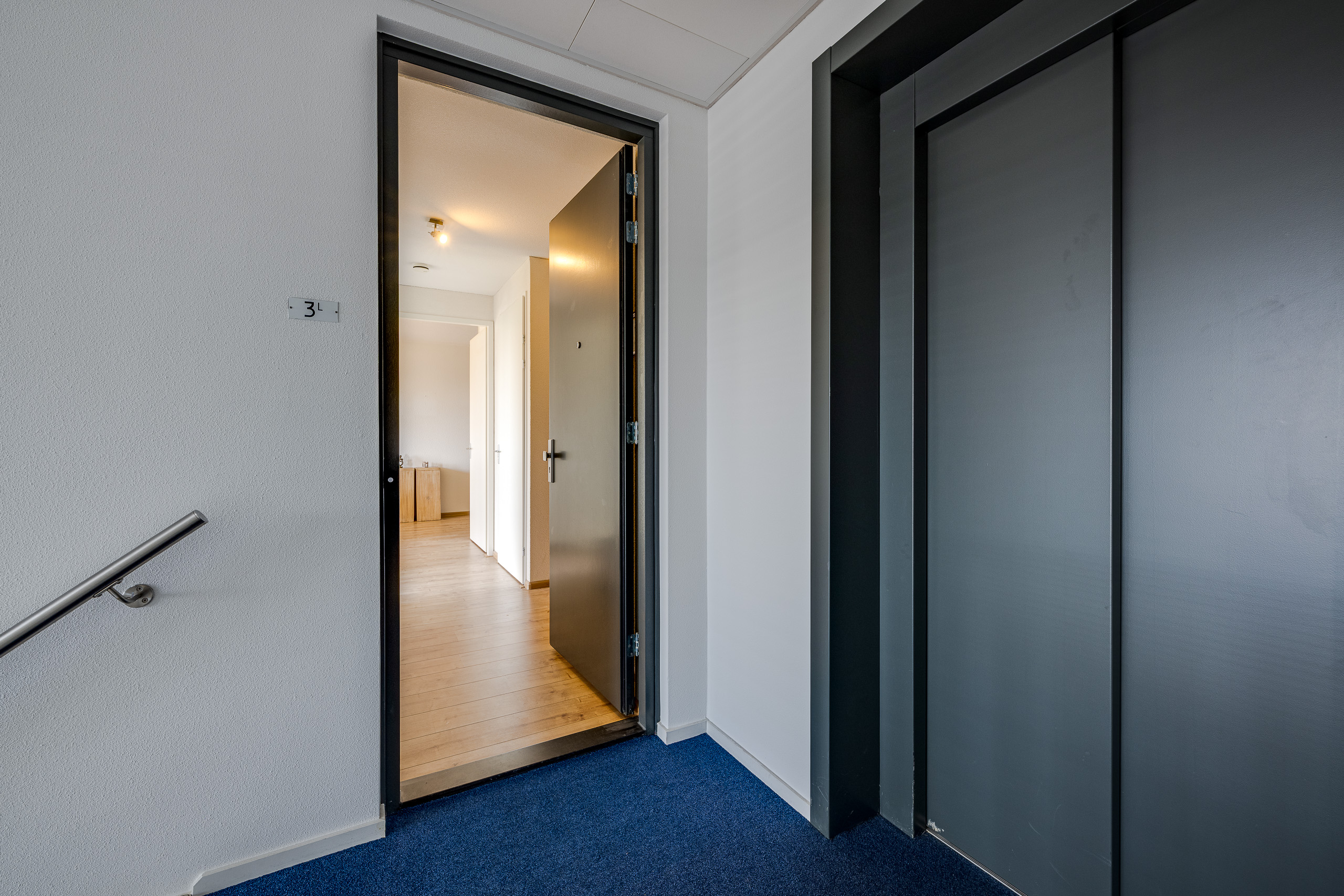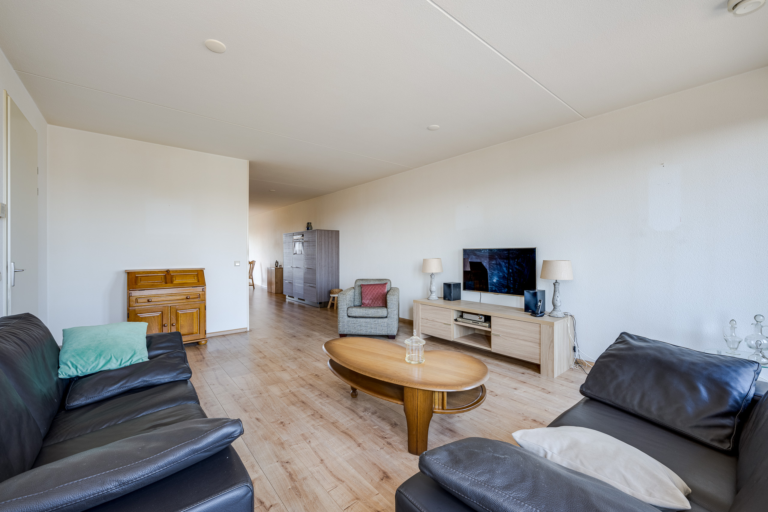 Centrale hal met garderobekasten, toegang tot twee ruime slaapkamers. Één slaapkamer en de eetkamer bieden toegang tot het balkon/terras op het zuidwesten. Toiletruimte met fonteintje. Meterkast. Inpandige berging met CV-combiketel Remeha HR 2010, wasmachine- en drogeraansluiting alsmede de mechanische ventilatie (WTW). Lichte badkamer met tegels tot aan het plafond, wastafel toilet en inloopdouche. Grote L-vormige woonkamer met naar buiten openslaande deuren die toegang geven tot het tweede balkon dat op het noordoosten ligt. Open keuken met inbouwapparatuur die de woonkamer met de eetkamer verbindt.