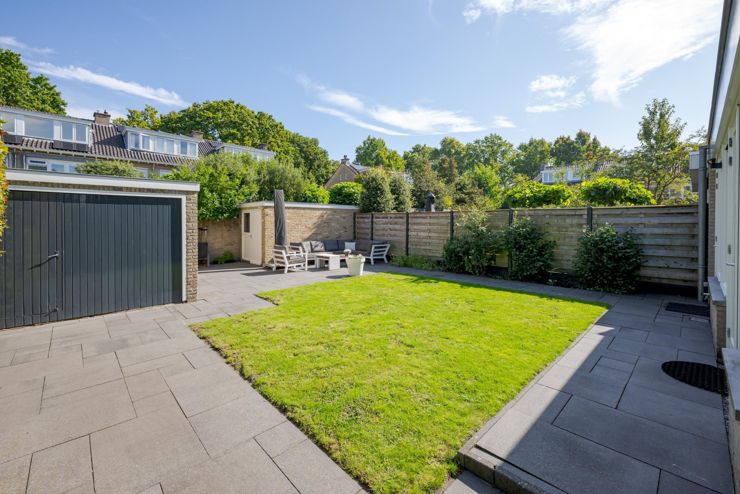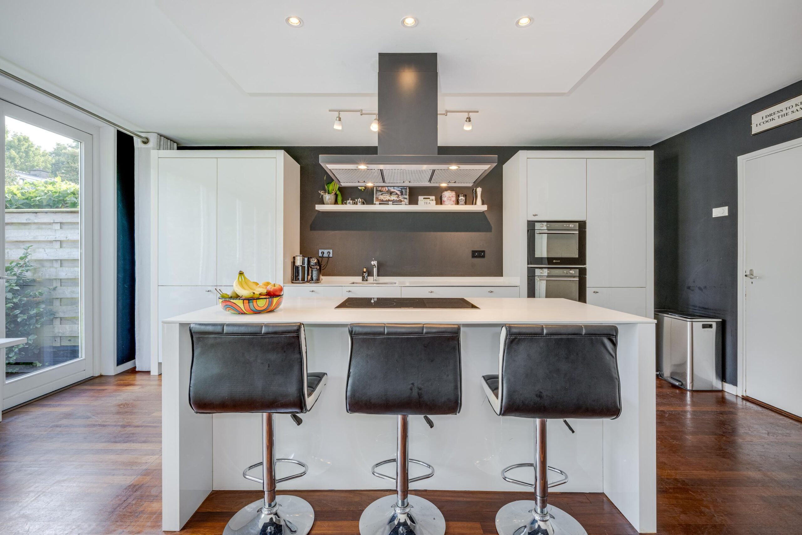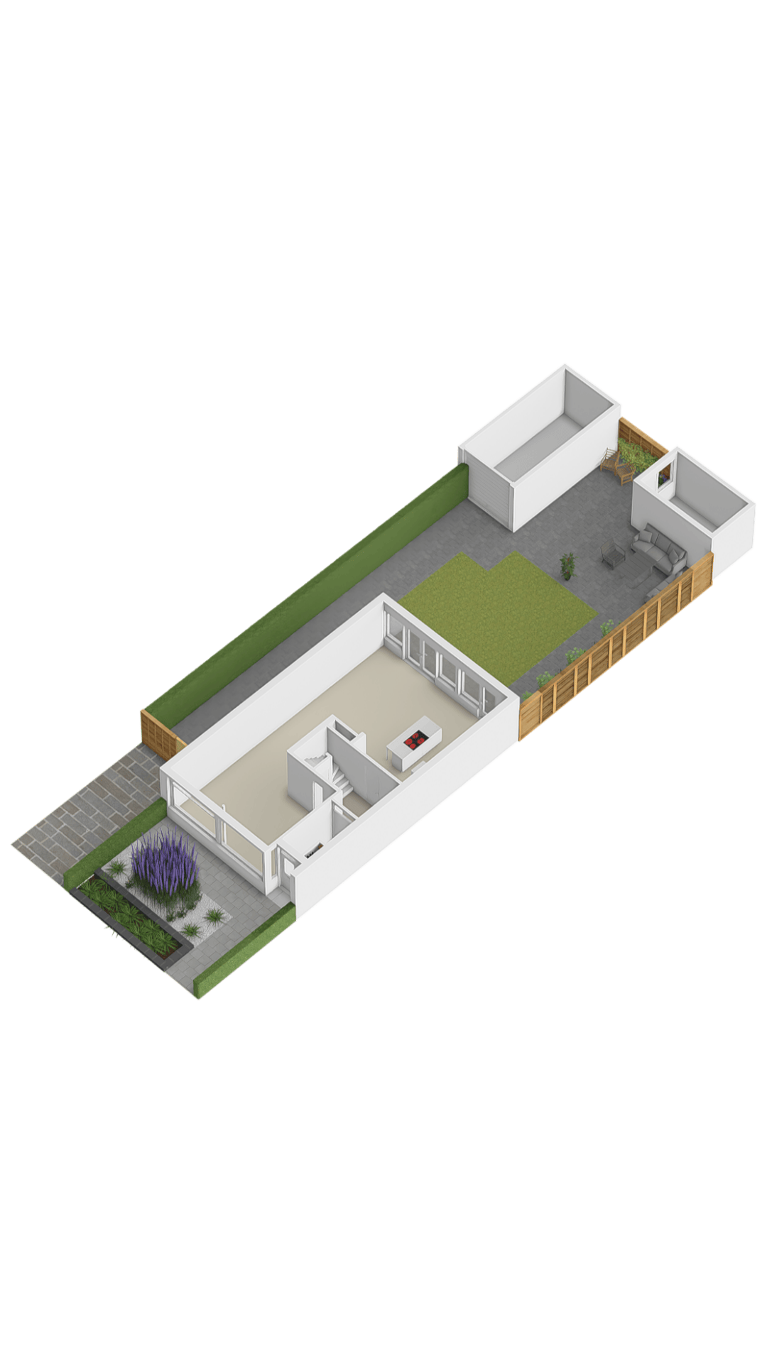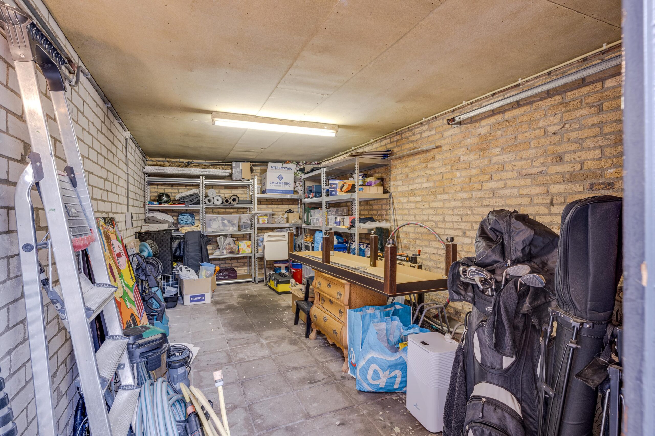 Begane grond: Voortuin en entree van de woning met een garderobe en meterkast. De entree loopt over in een hal met separaat toilet, deur naar de woonkamer en trap naar de eerste verdieping. De woonkamer loopt over in de woonkeuken. Vanuit de woonkeuken met kookeiland kijk je de enorm grote achtertuin in. Achter de openslaande deuren, bevindt zich de tuin. In de tuin bevindt zich een vrijstaande garage en stenen berging.