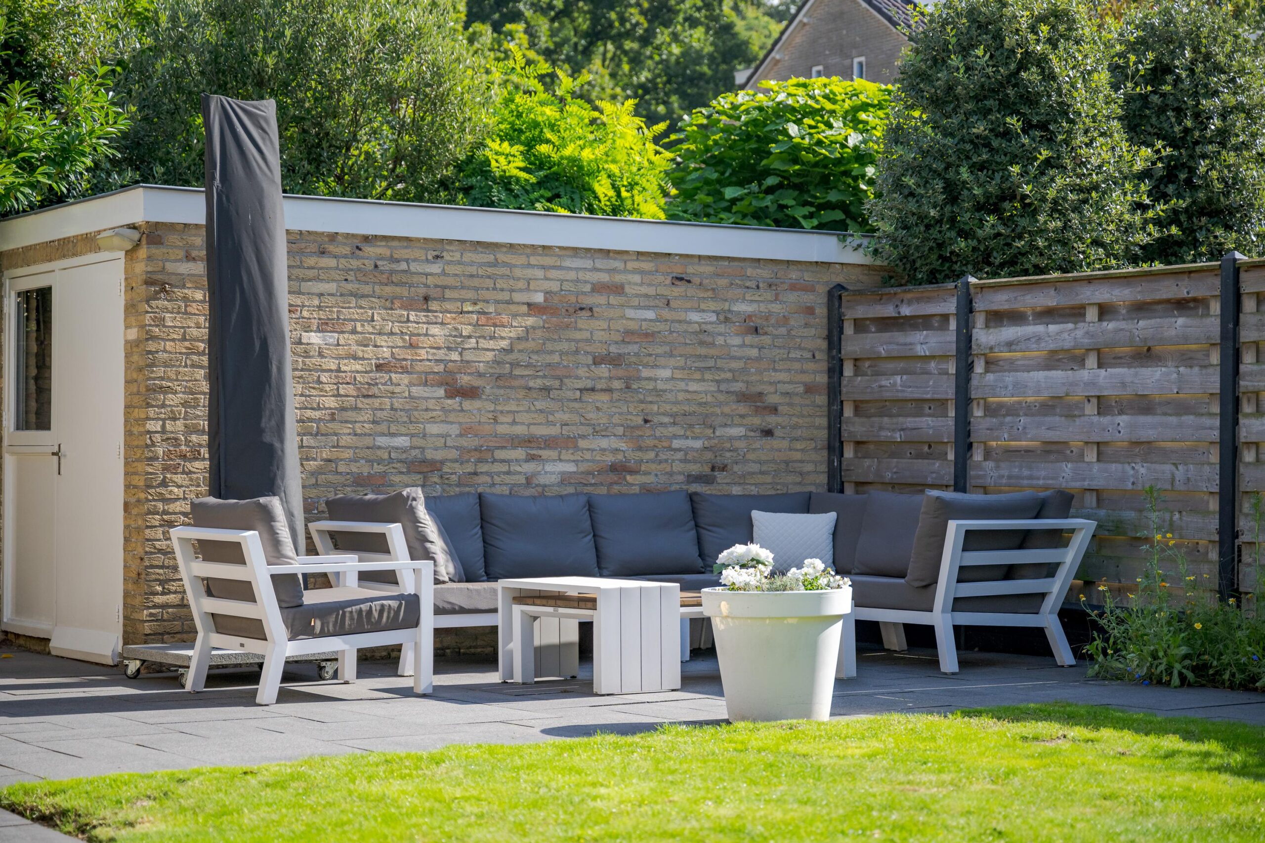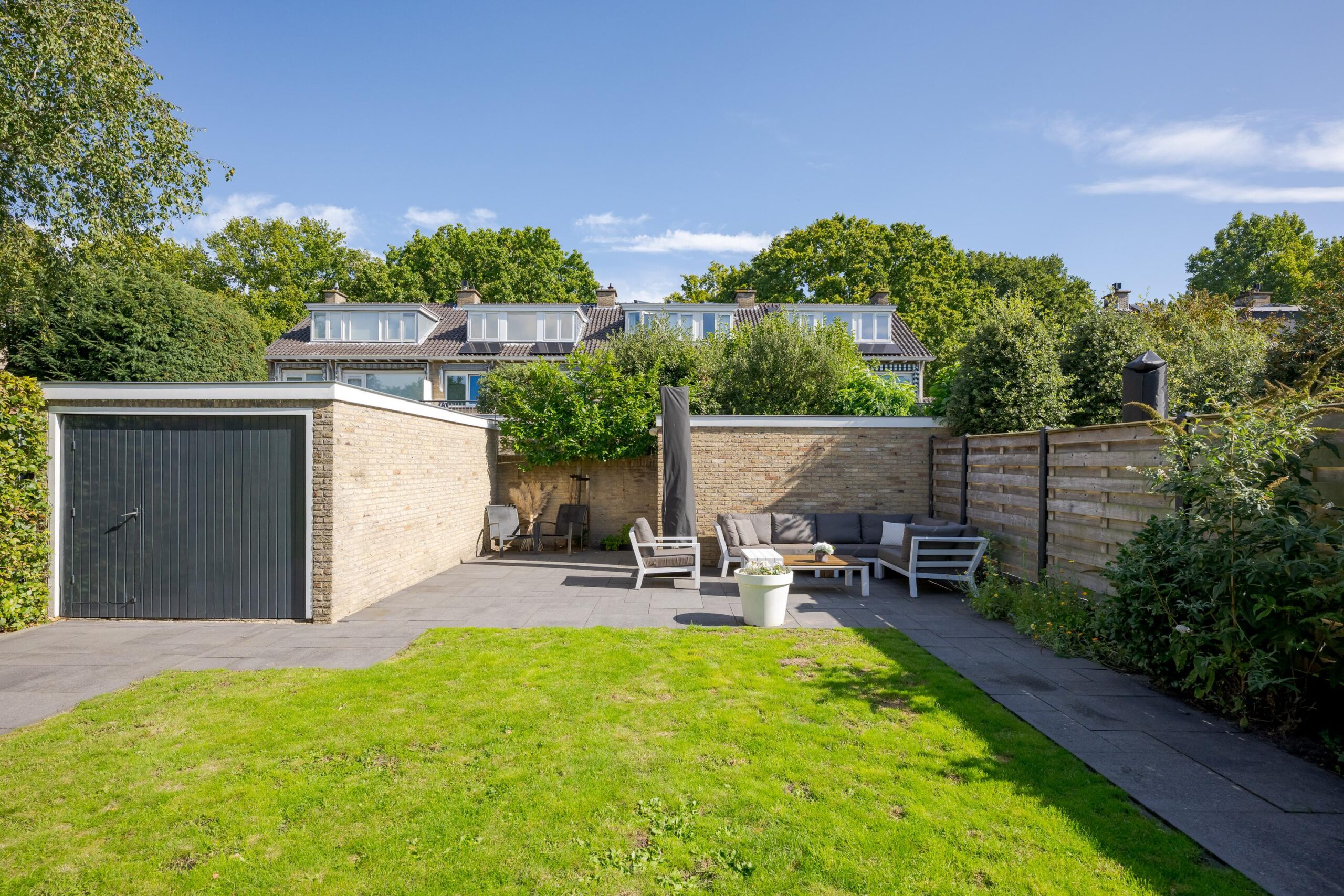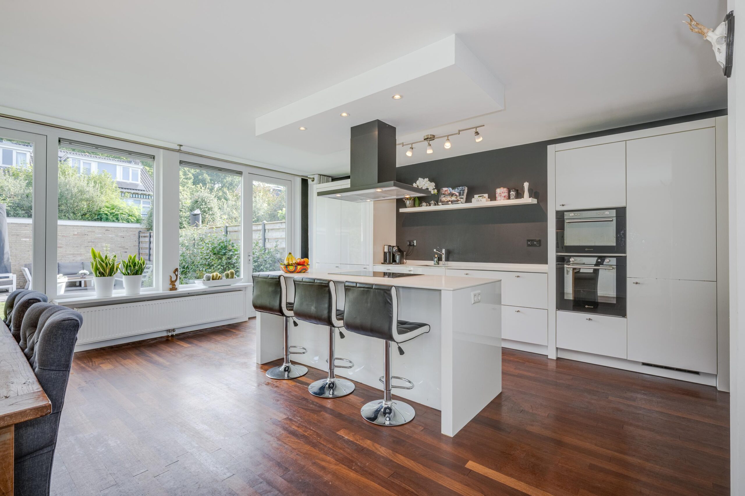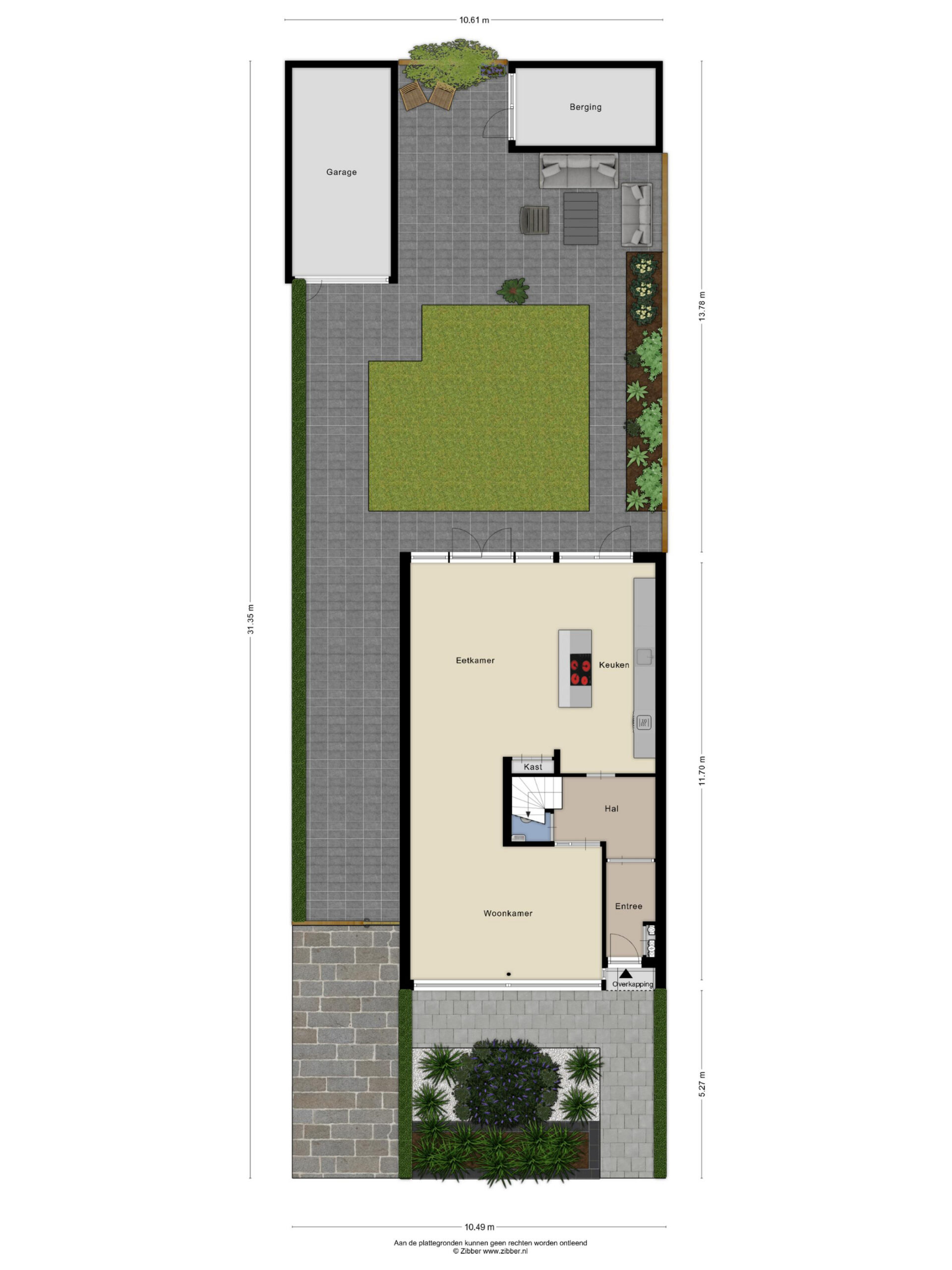 Begane grond: Voortuin en entree van de woning met een garderobe en meterkast. De entree loopt over in een hal met separaat toilet, deur naar de woonkamer en trap naar de eerste verdieping. De woonkamer loopt over in de woonkeuken. Vanuit de woonkeuken met kookeiland kijk je de enorm grote achtertuin in. Achter de openslaande deuren, bevindt zich de tuin. In de tuin bevindt zich een vrijstaande garage en stenen berging.