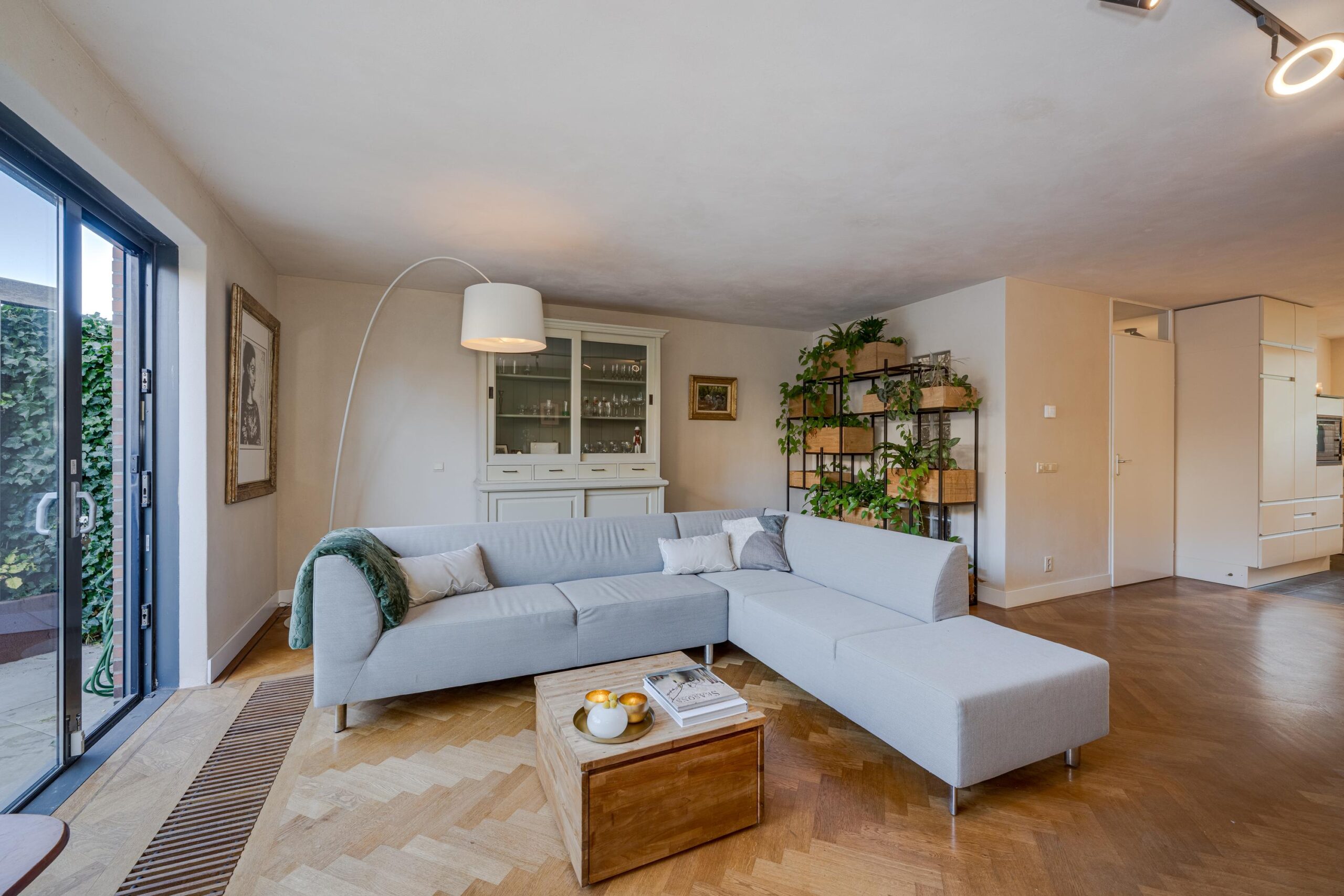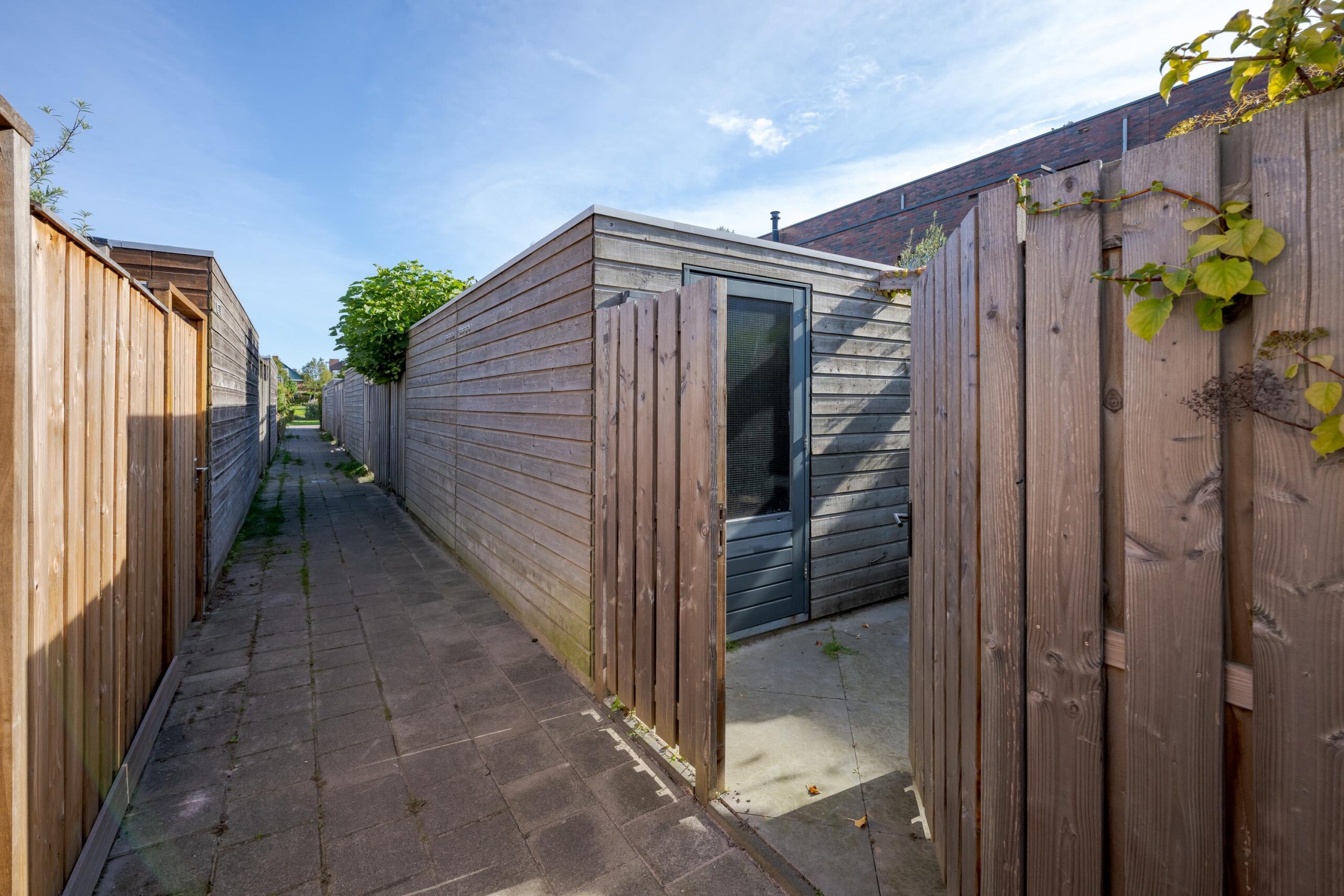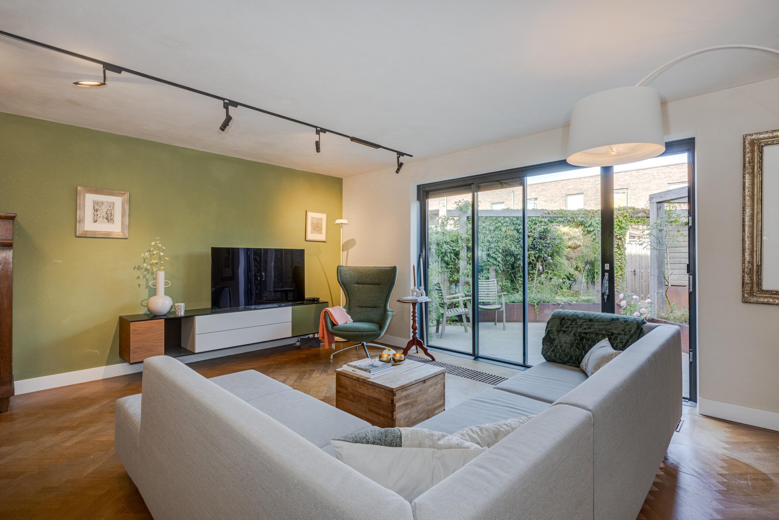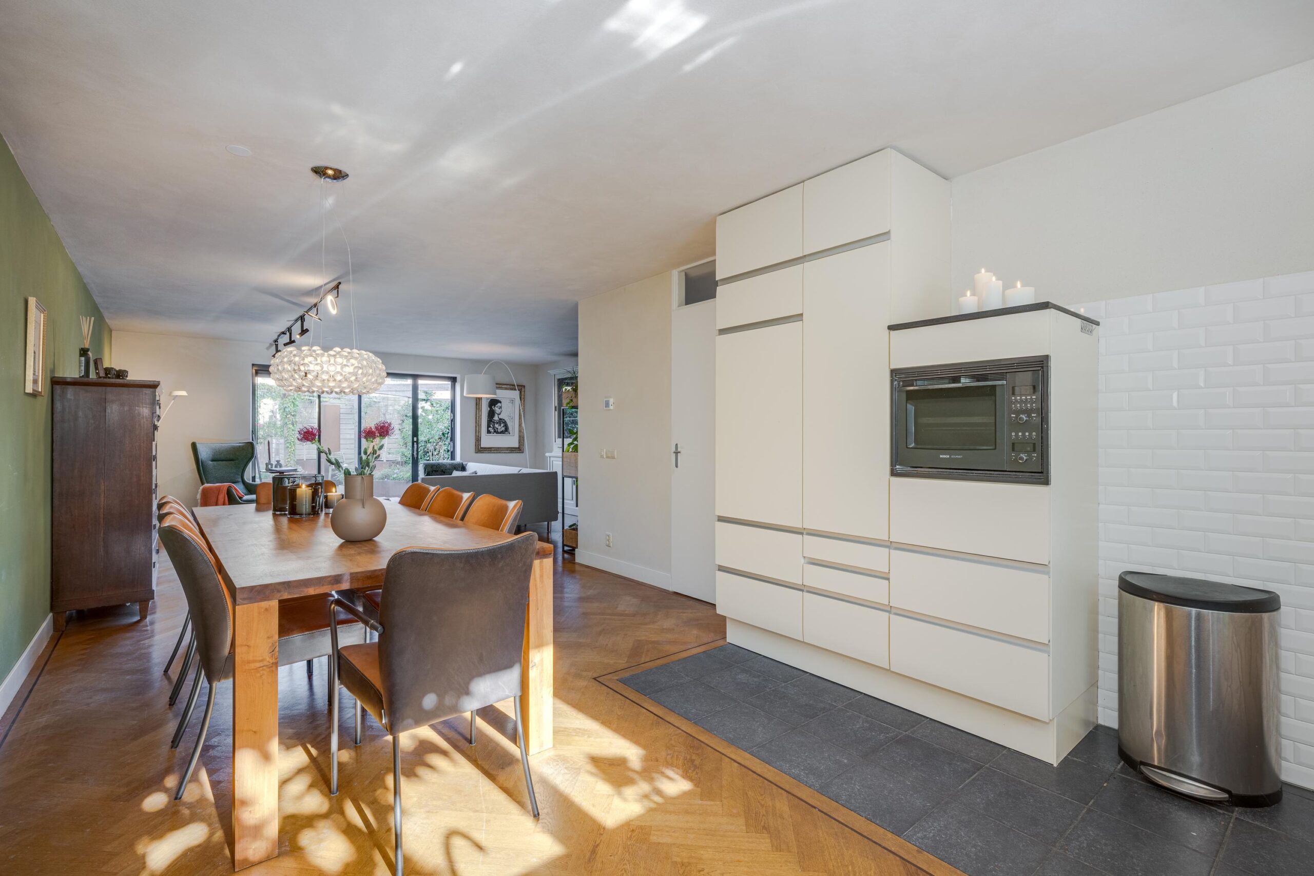 Entree, ruime hal/gang met bergkast en meterkast, toilet met fonteintje, royale L-vormige tuingerichte woonkamer met fraaie visgraat parketvloer en grote schuifpui naar de zonnige achtertuin met berging en achterom.