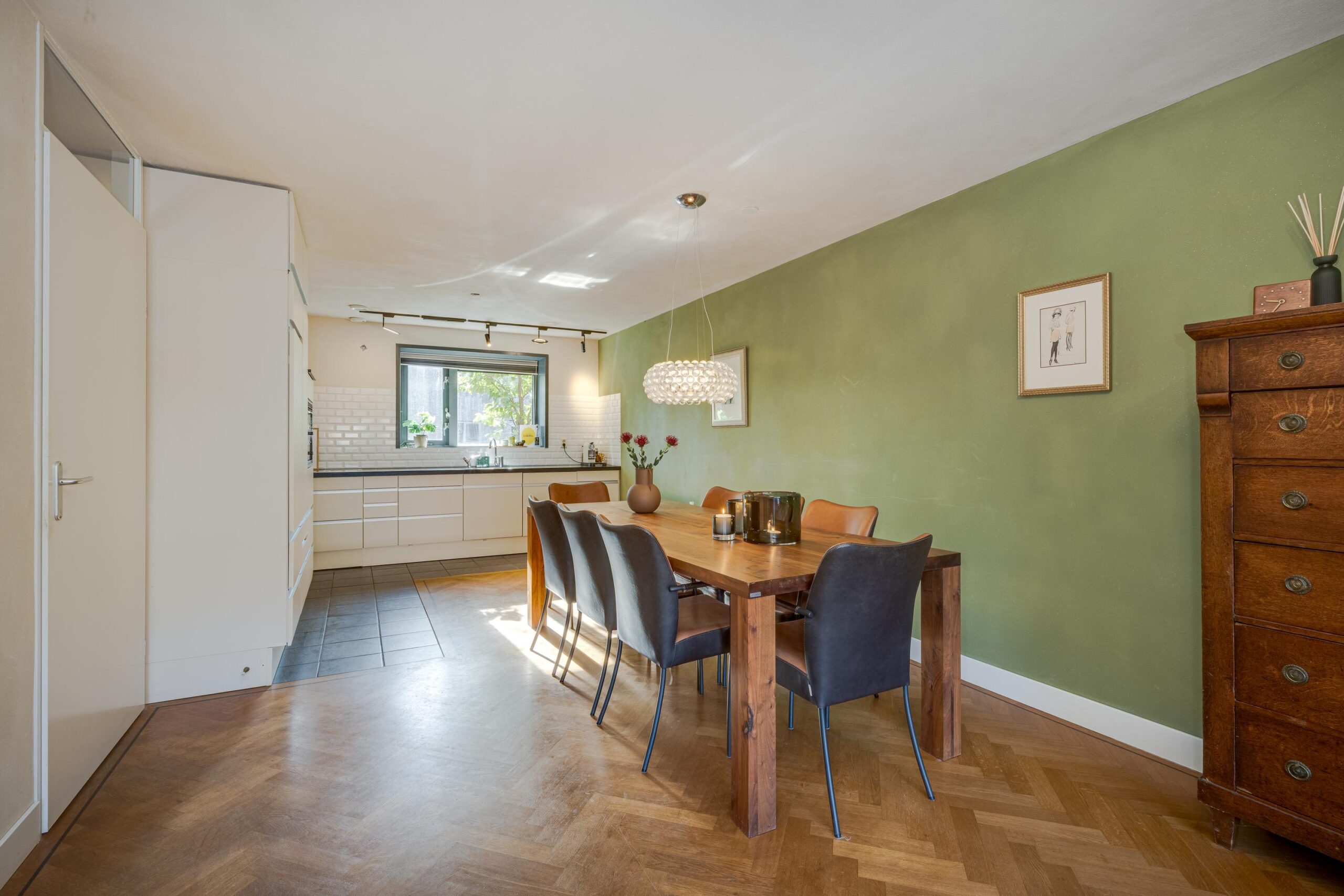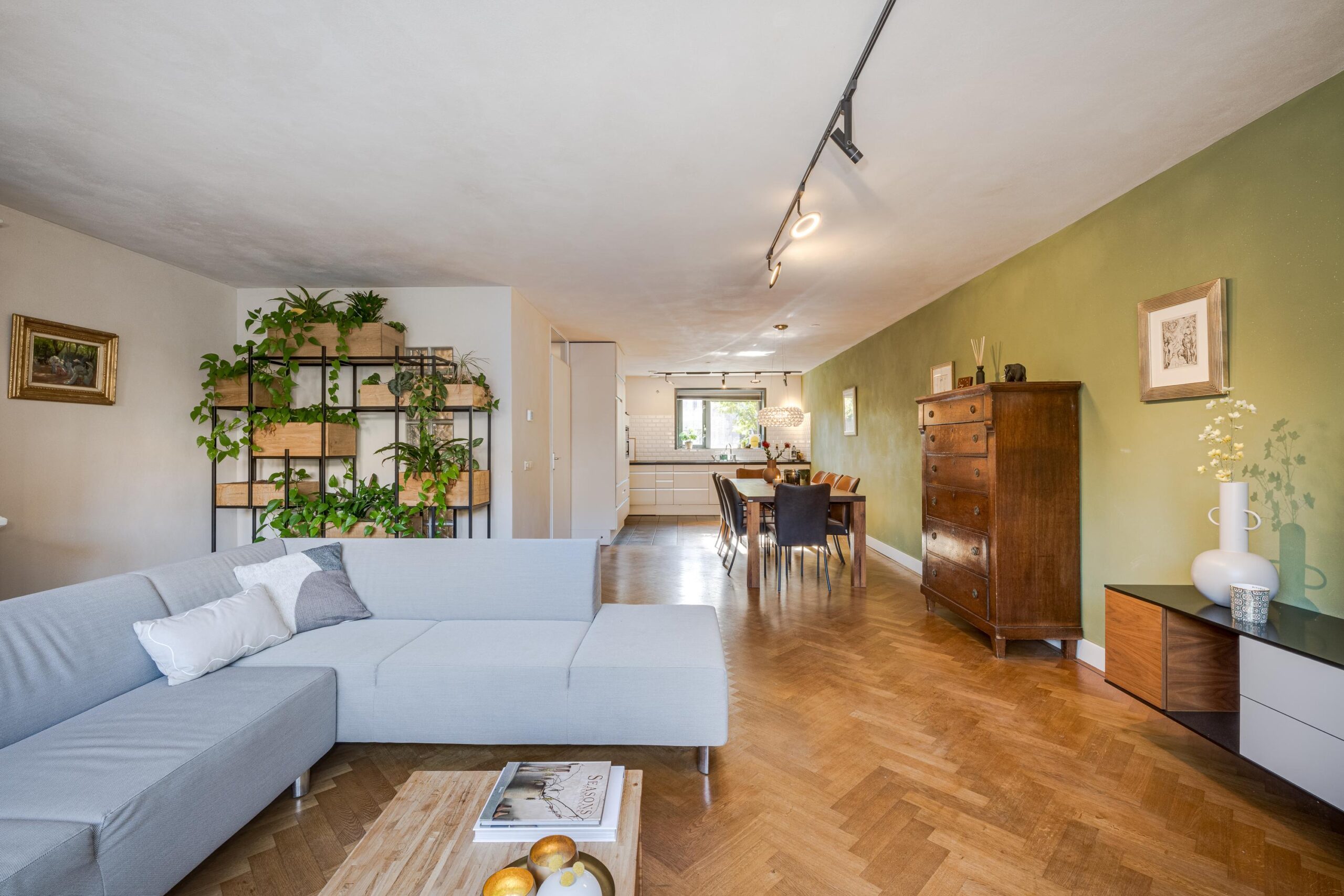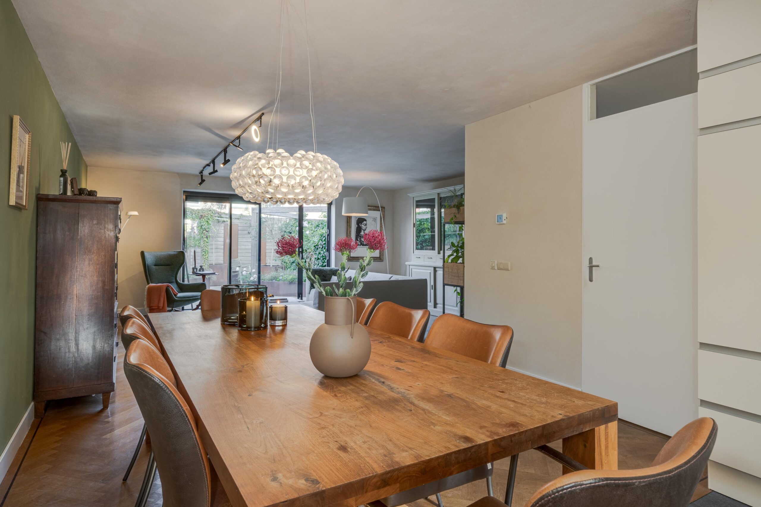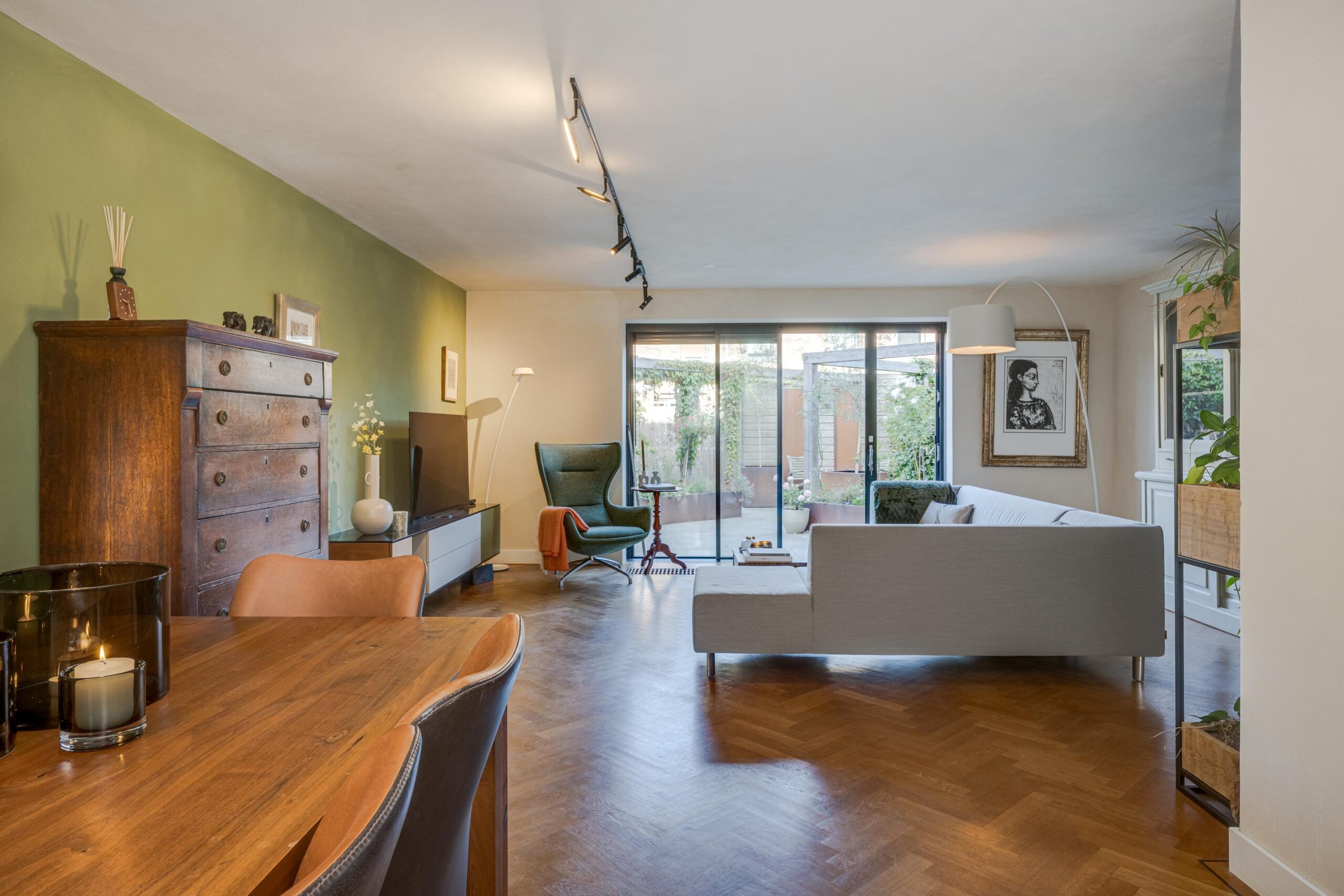 Entree, ruime hal/gang met bergkast en meterkast, toilet met fonteintje, royale L-vormige tuingerichte woonkamer met fraaie visgraat parketvloer en grote schuifpui naar de zonnige achtertuin met berging en achterom.