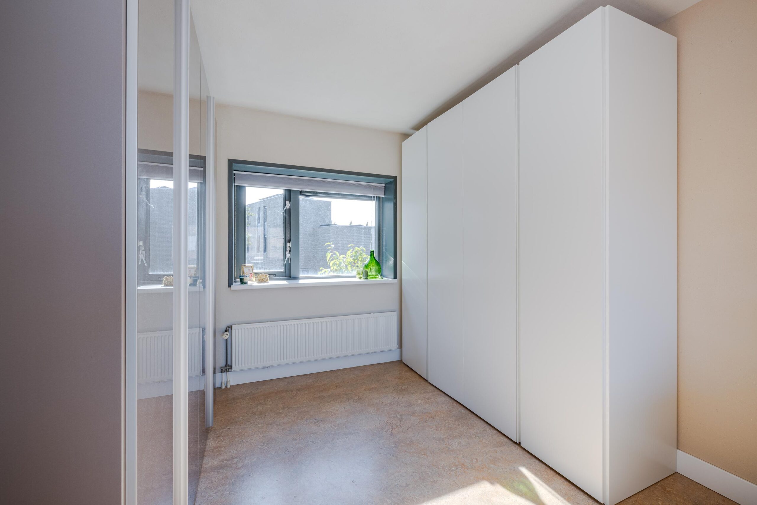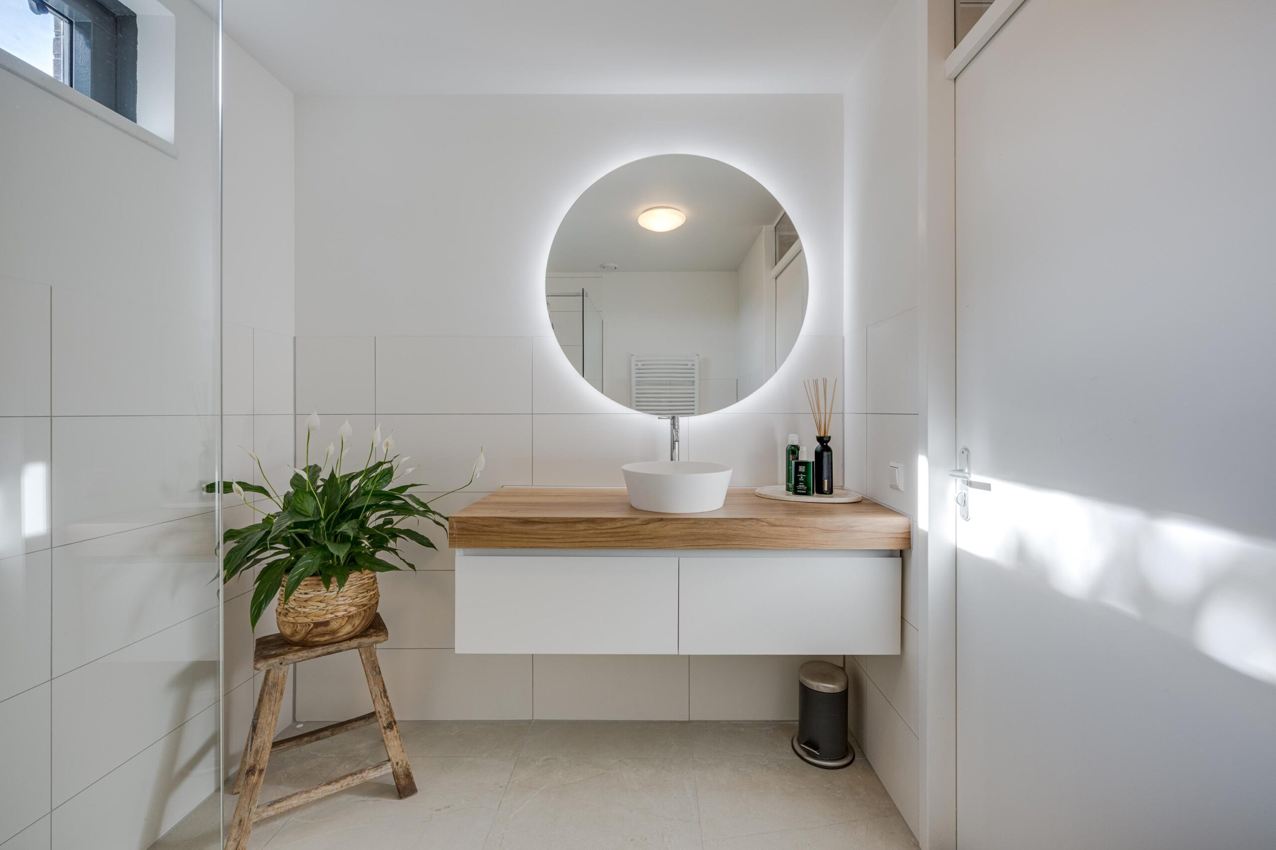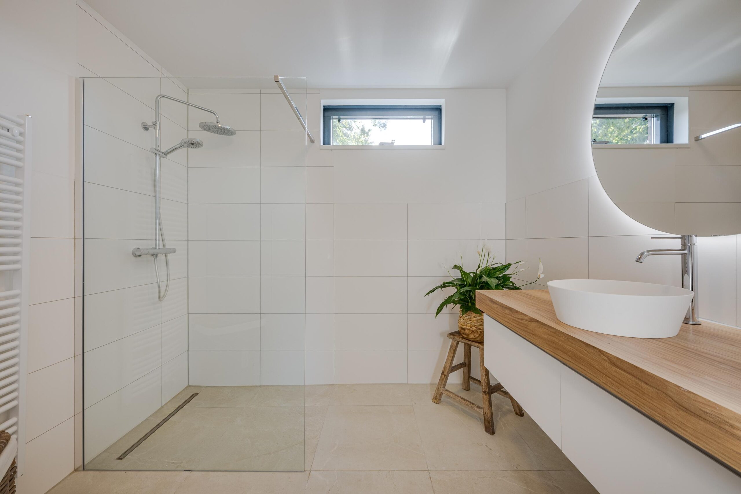 Overloop, 2e toilet, prachtige, nieuwe badkamer met vloerverwarming en een zeer ruime slaapkamer (die op eenvoudige wijze omgetoverd kan worden in twee slaapkamers). Zoals gezegd: ‘door middel van een opbouw is deze verdieping met 30 m2 uit te breiden waardoor er ruimte ontstaat voor drie grotere slaapkamers.