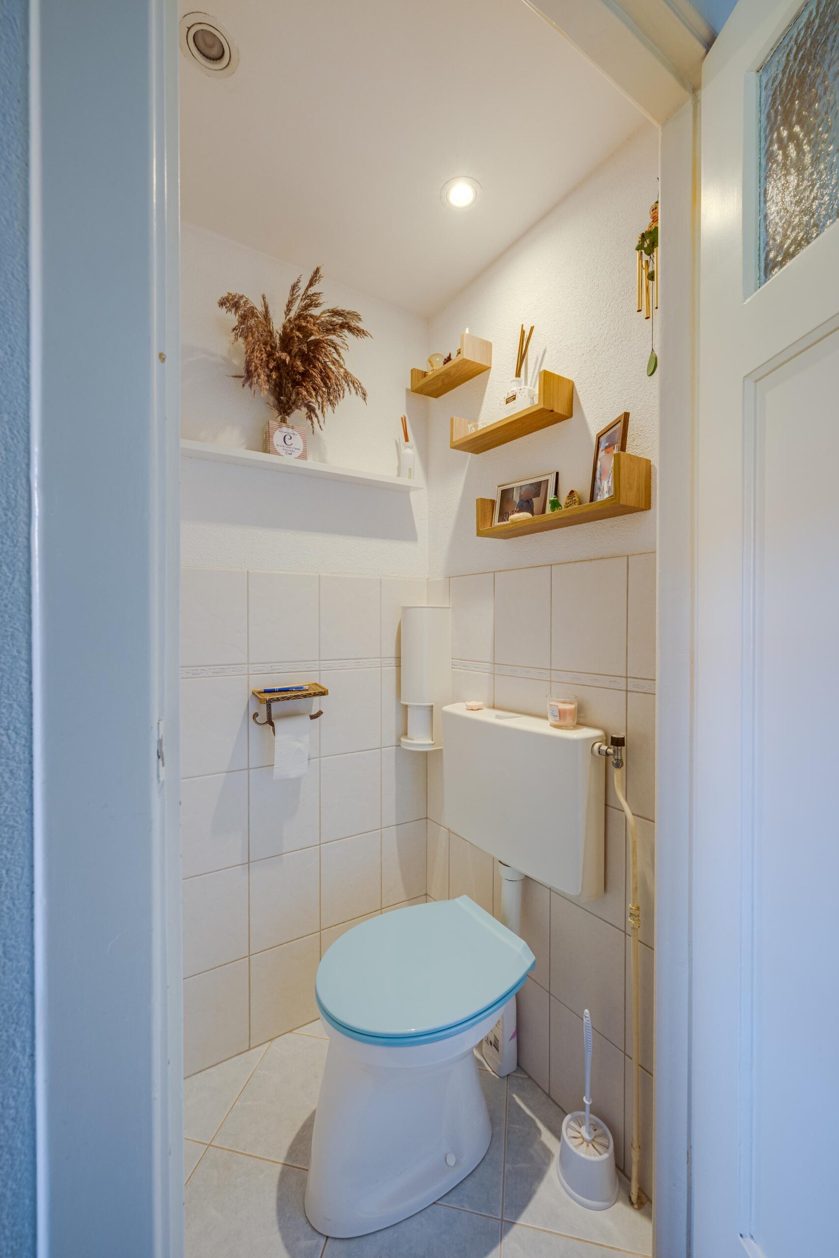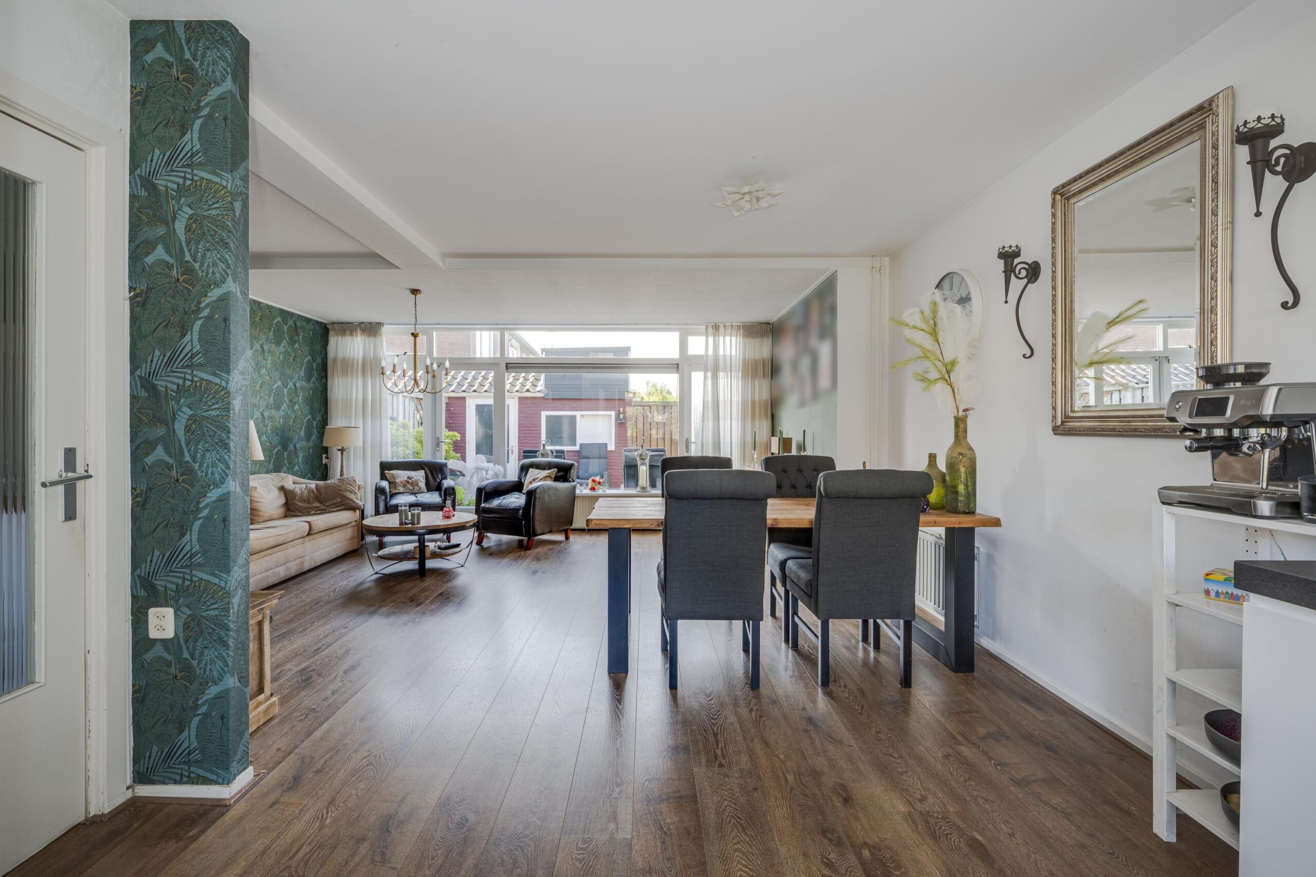 Begane grond: entree woning, meterkast, hal met trap naar eerste verdieping, trapkast met aansluiting voor de wasmachine, toilet. Deur naar de ruime en lichte woonkamer met een moderne keuken met diverse inbouwapparatuur en een ruime uitgebouwde woonkamer met openslaande deuren naar de zonnige op het zuidwesten gelegen achtertuin met stenen berging en achterom.