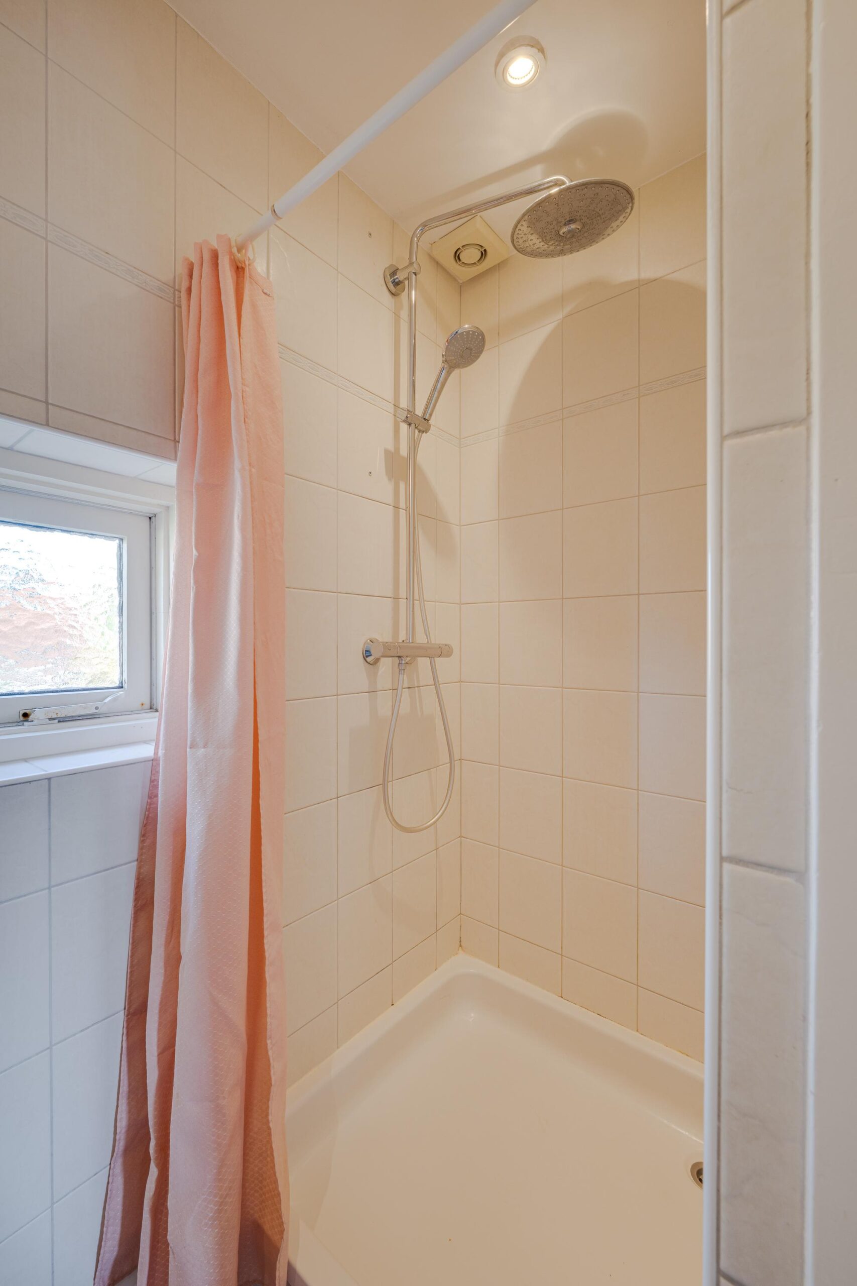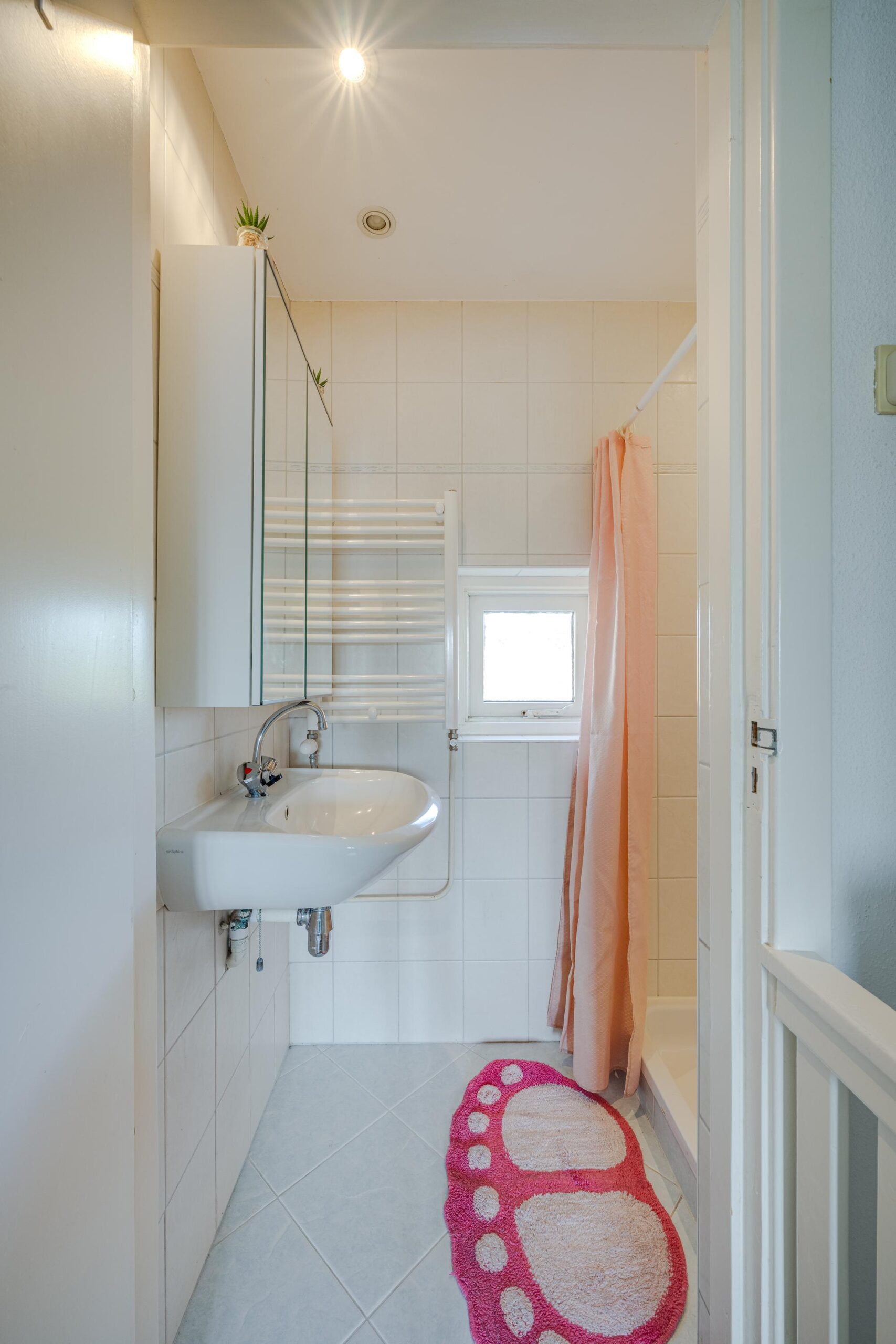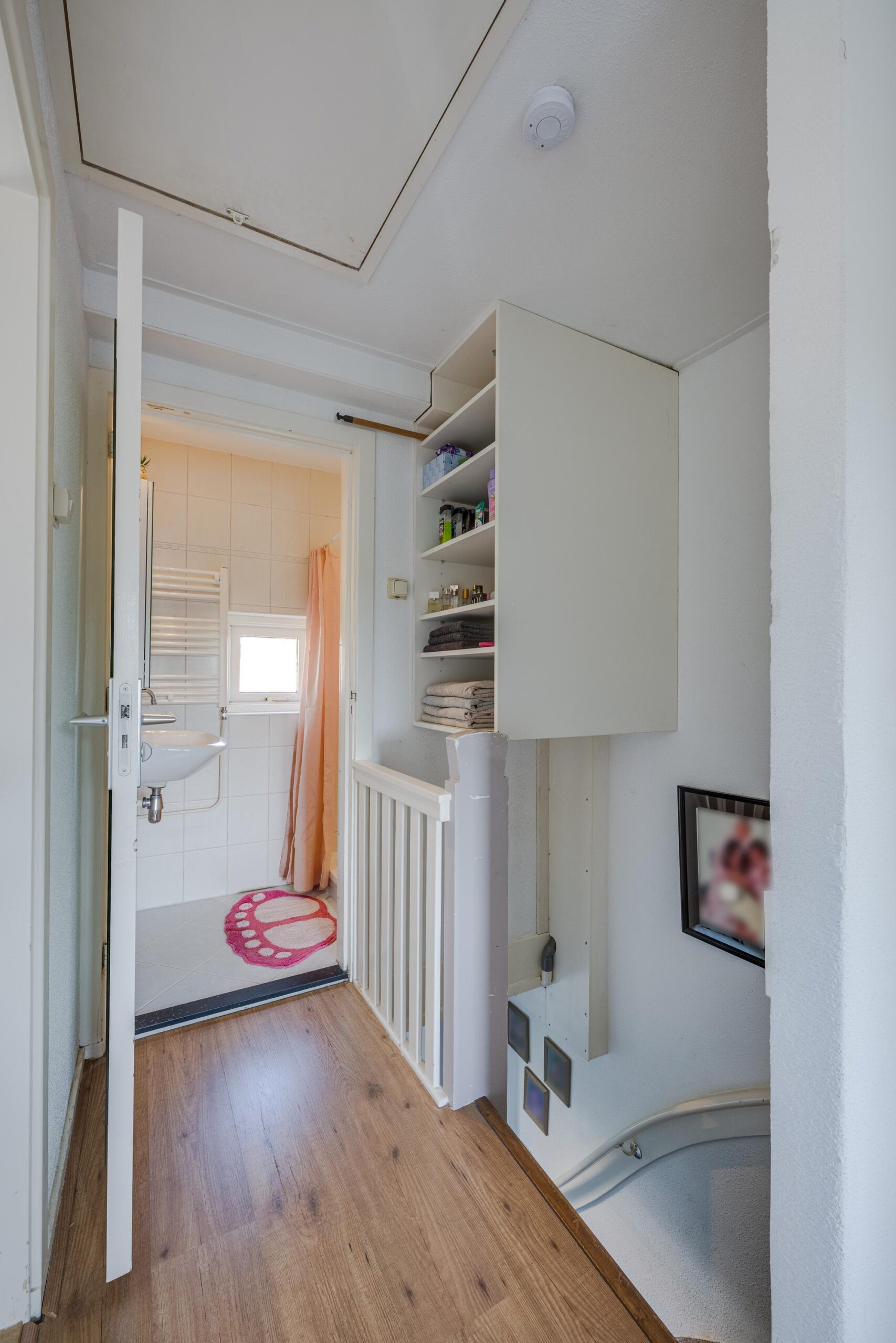 Eerste verdieping: overloop met toegang tot de drie slaapkamers, waarvan twee aan de achterzijde van de woning en een aan de voorzijde. Badkamer met douche en wastafel. Op de overloop toegang via vlizotrap naar de bergzolder.