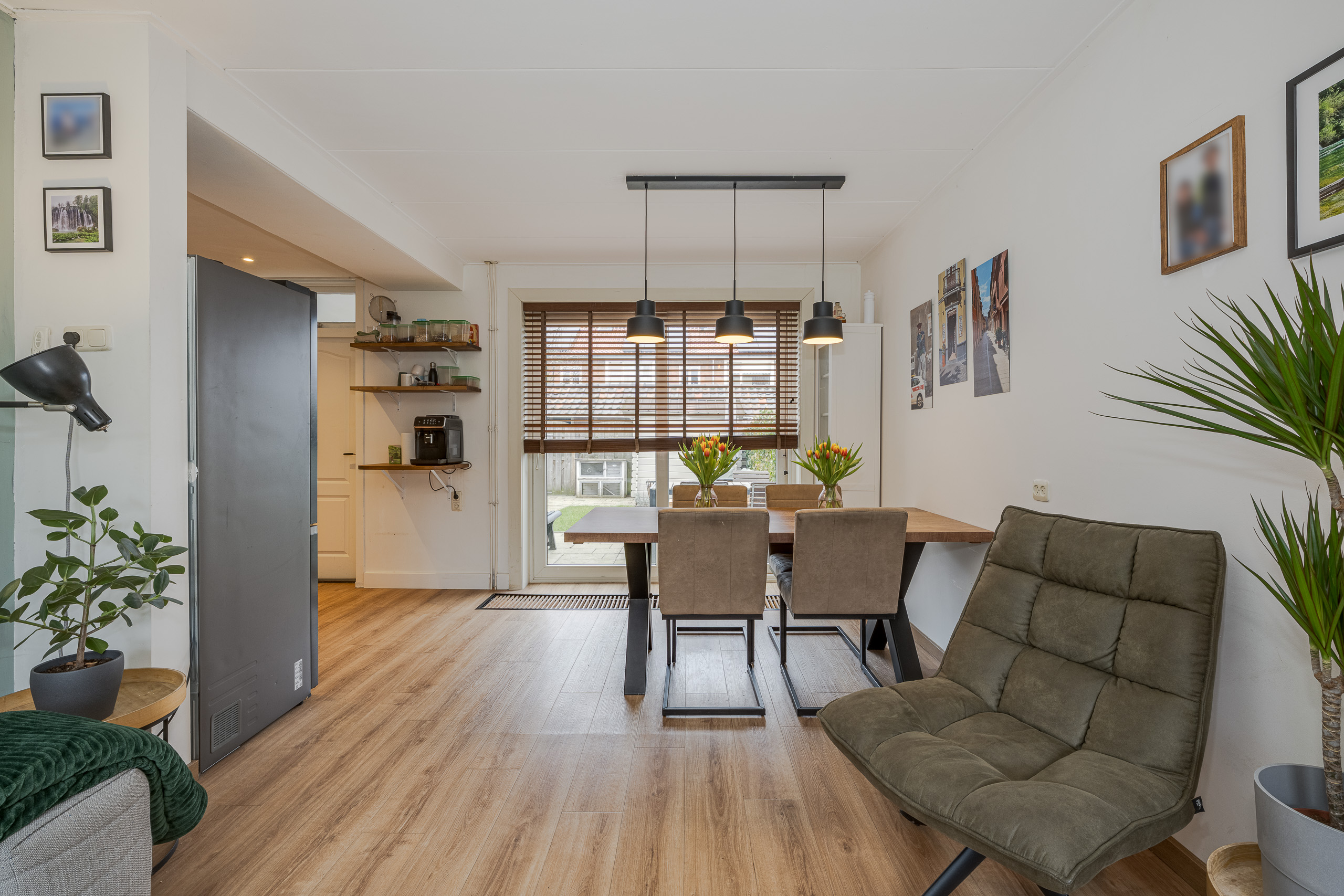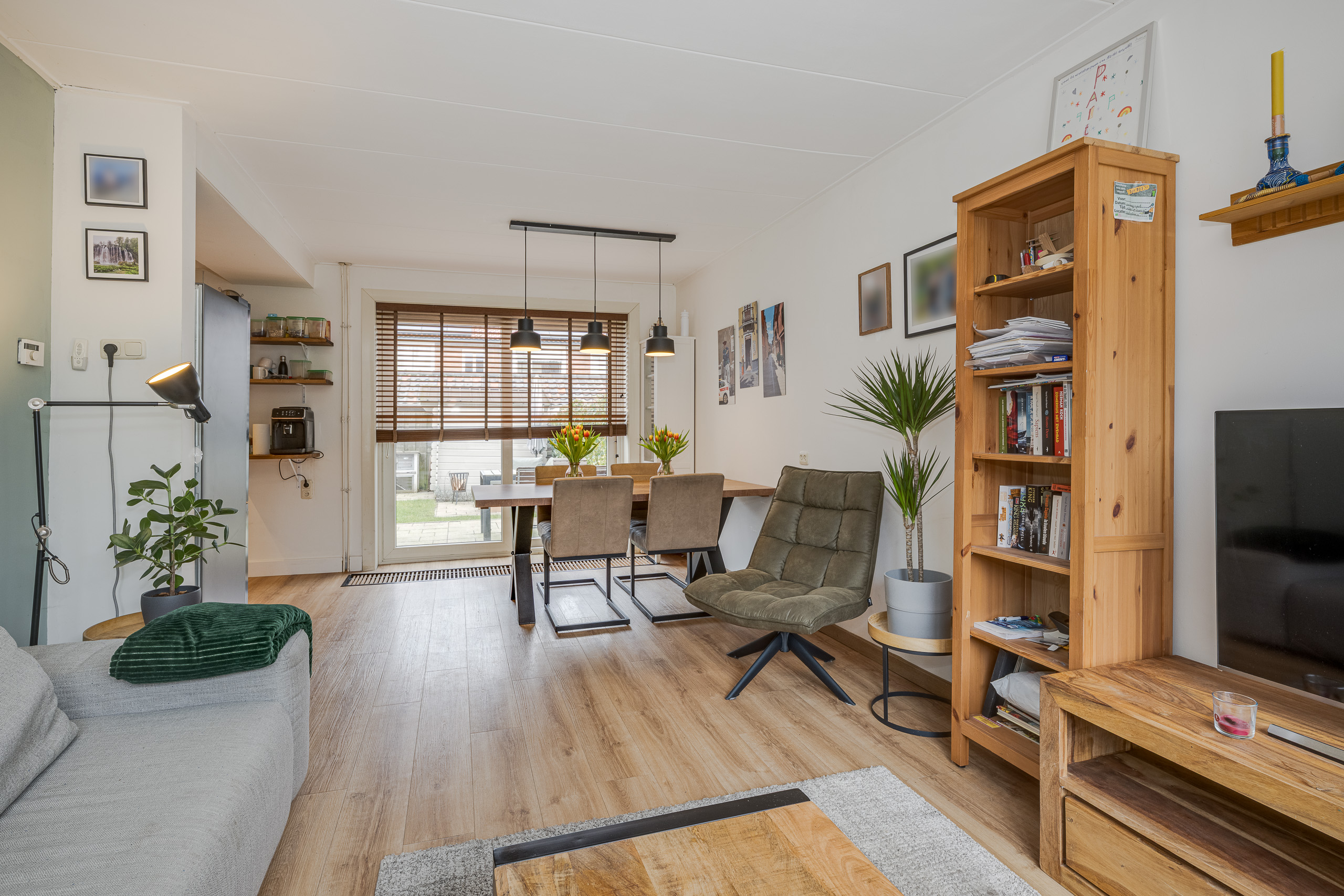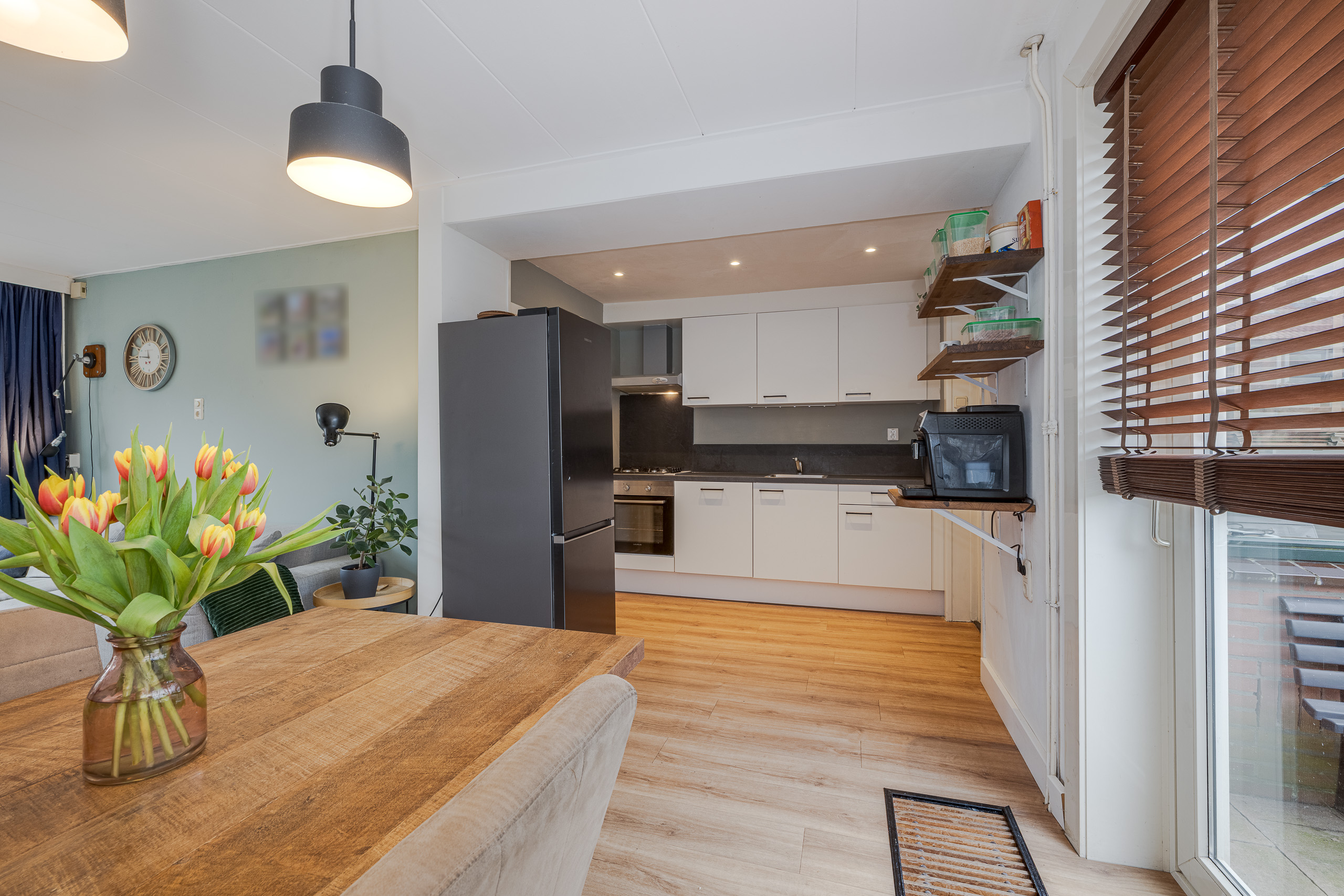 Voortuin, entree woning, gang/hal, meterkast, trapkast, toilet, doorzon woonkamer met open keuken voorzien van inbouwapparatuur. Ruime achtertuin op het westen met stenen berging en achterom.