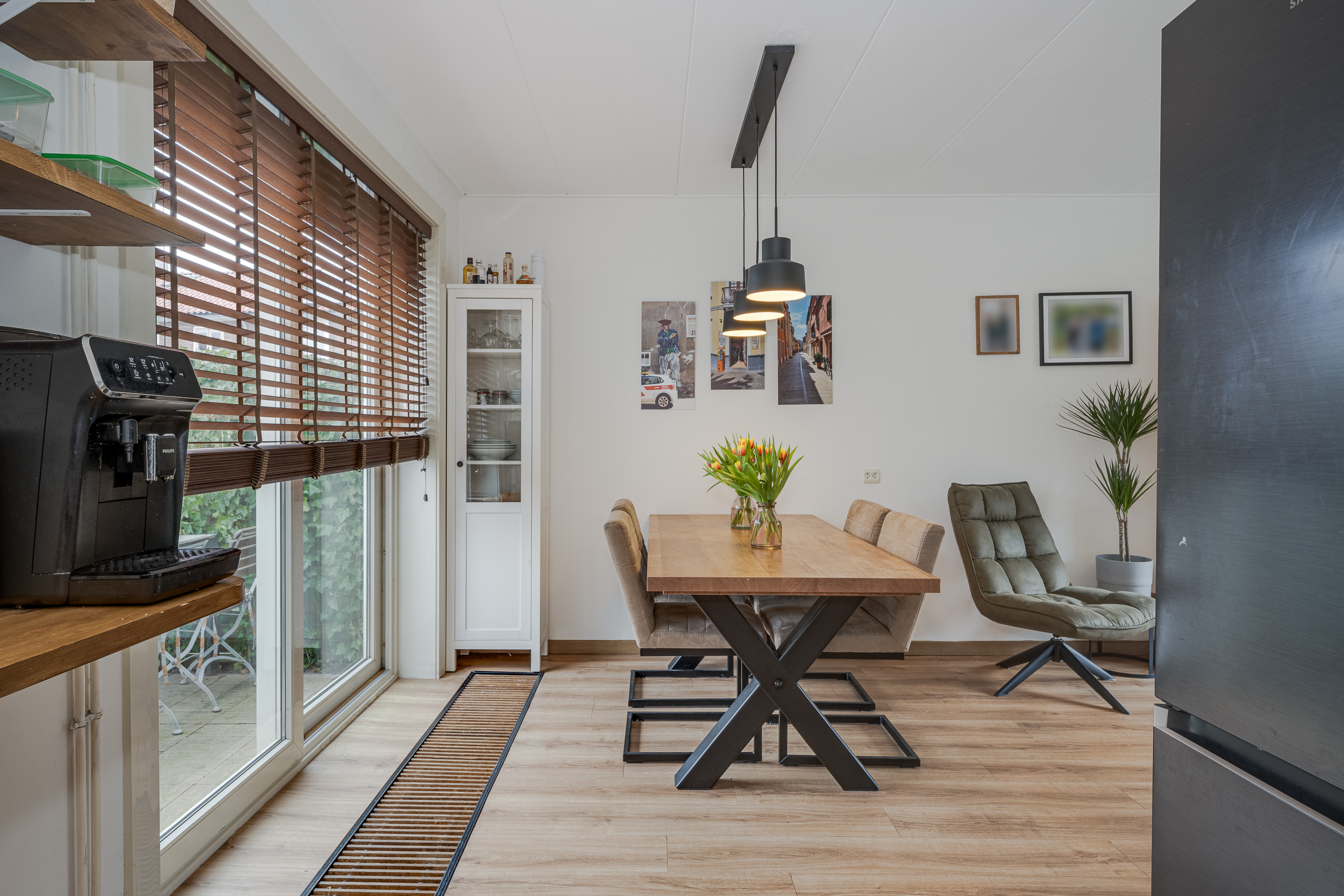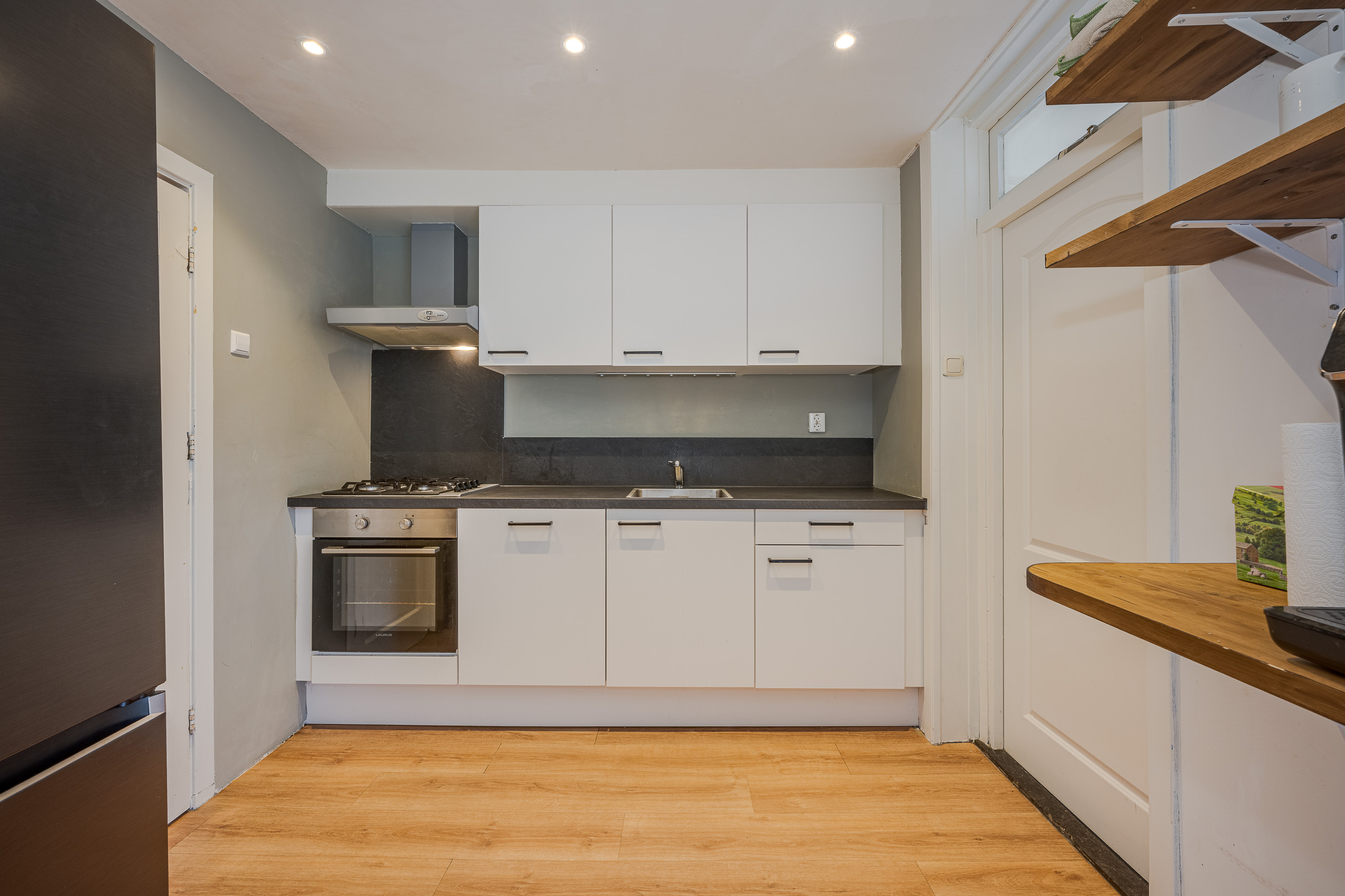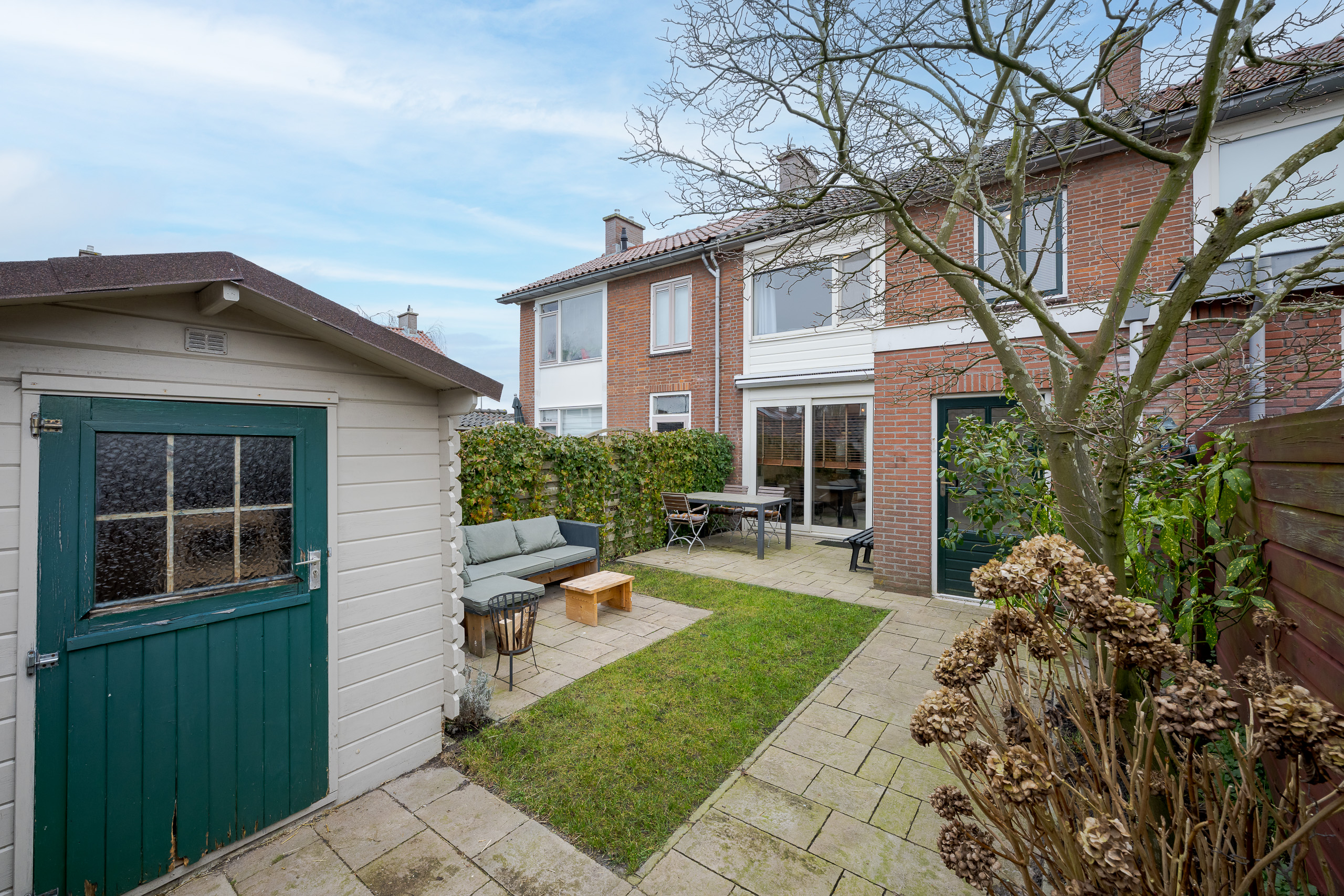 Voortuin, entree woning, gang/hal, meterkast, trapkast, toilet, doorzon woonkamer met open keuken voorzien van inbouwapparatuur. Ruime achtertuin op het westen met stenen berging en achterom.
