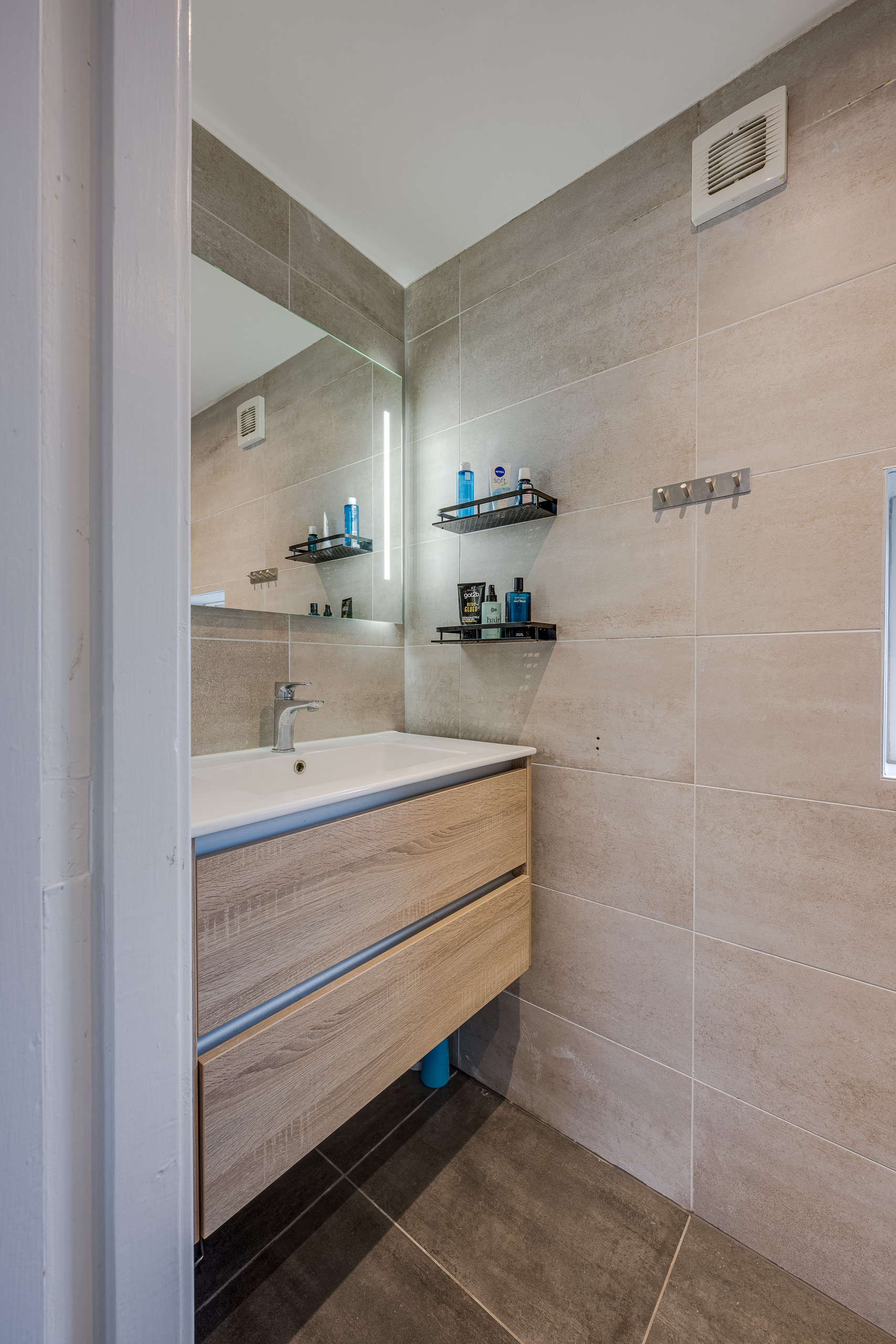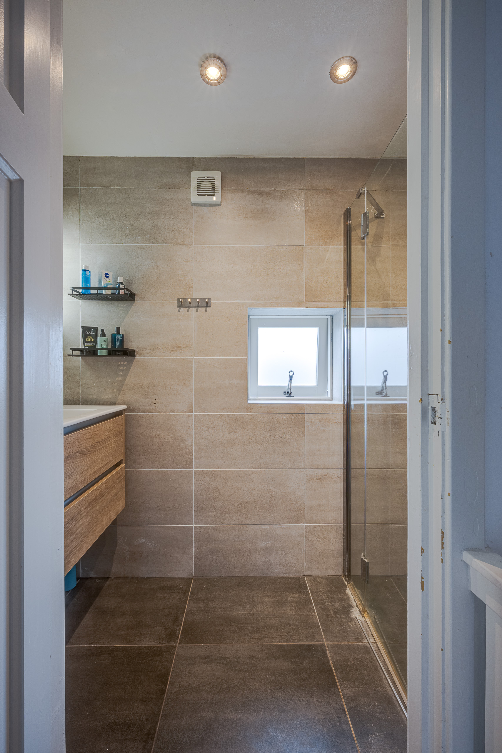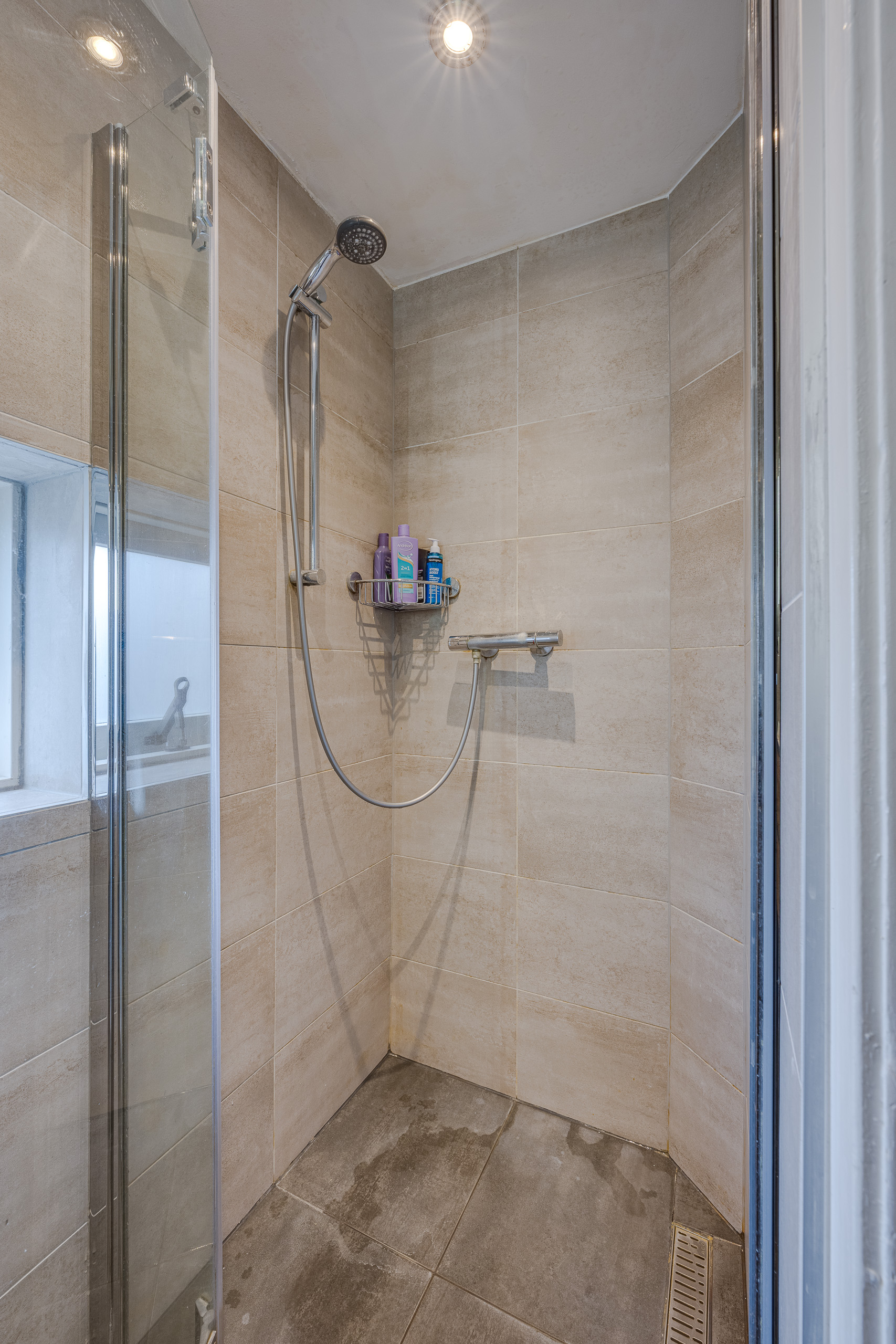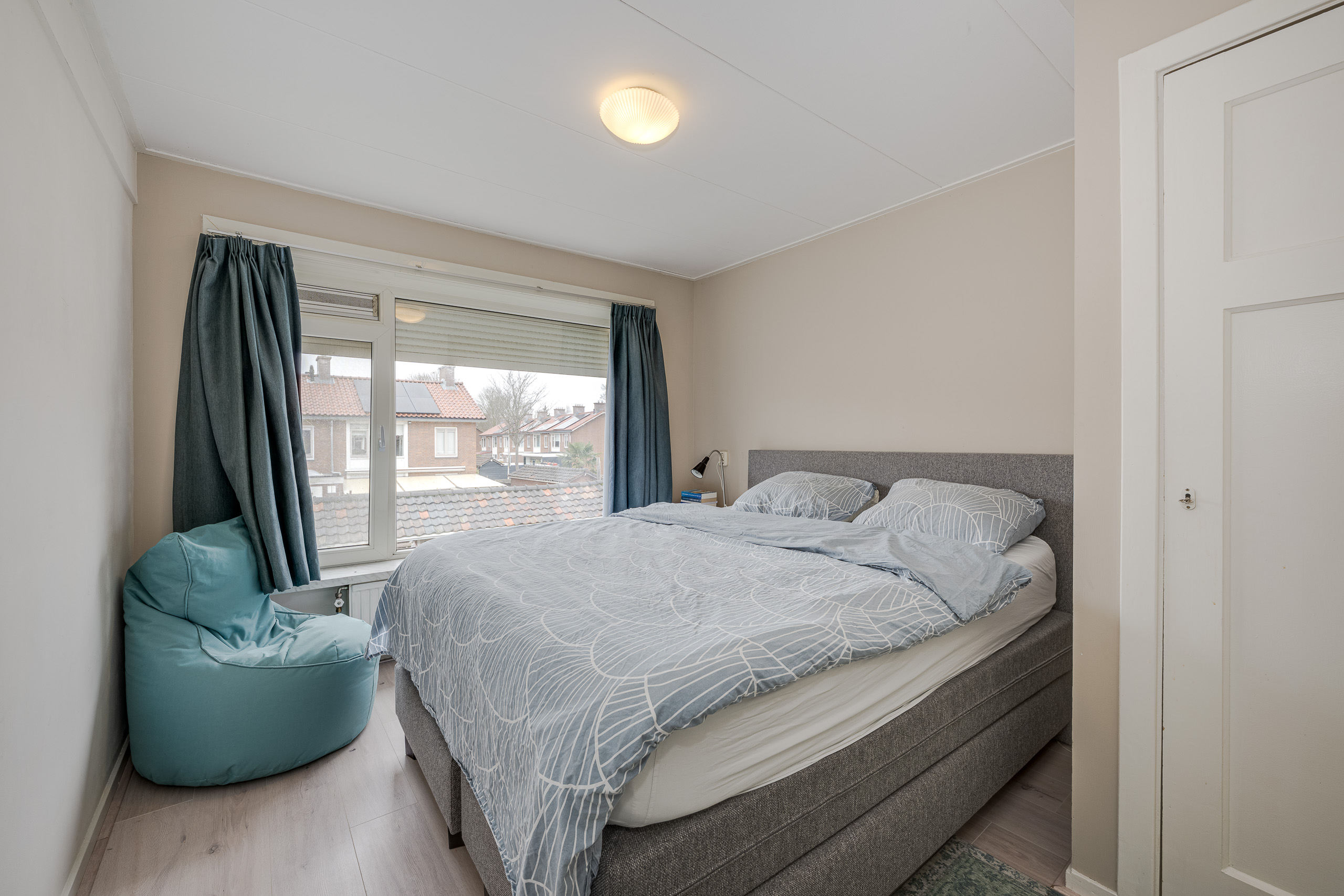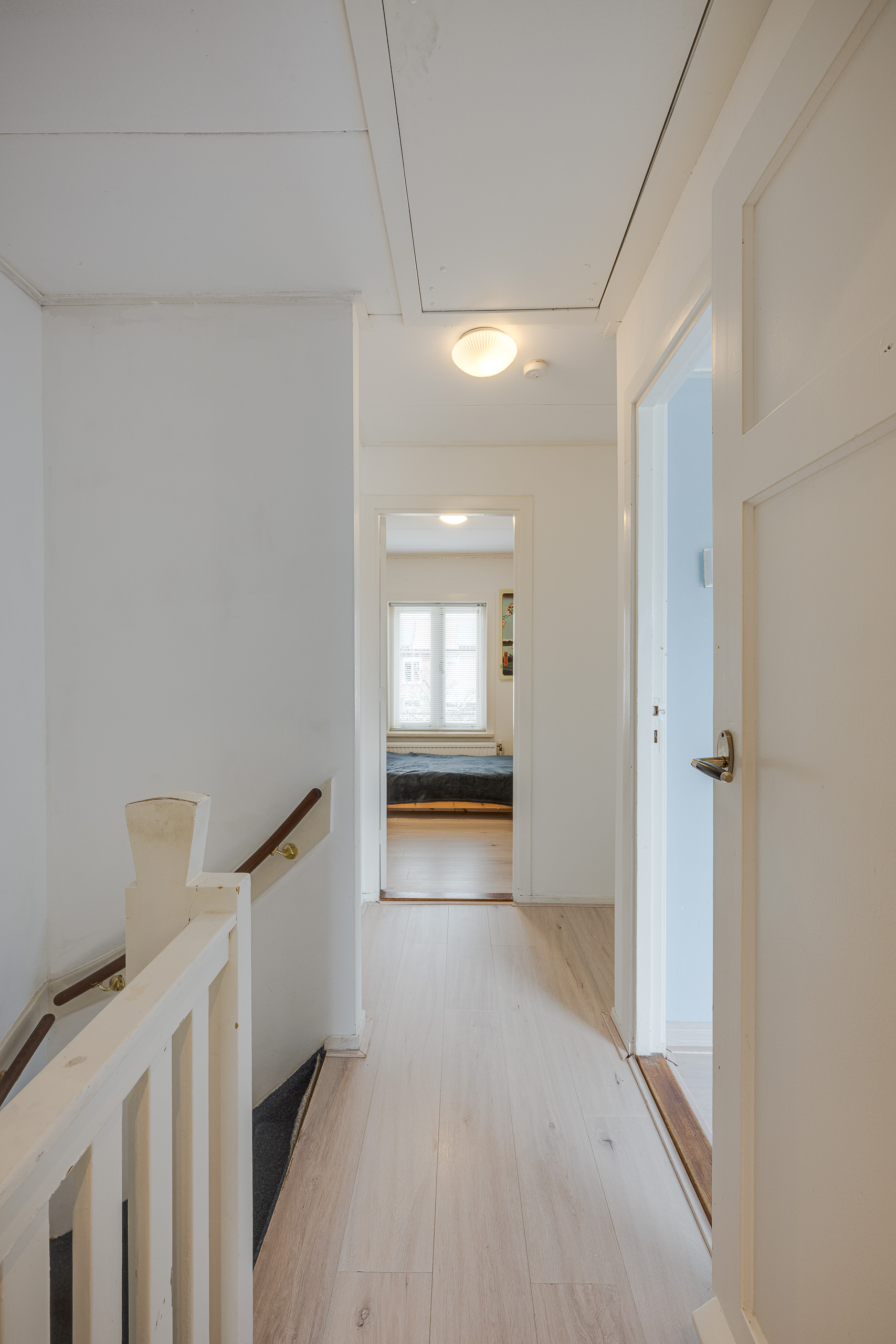 1e verdieping: Overloop met vaste kast, achterkamer, hoofdslaapkamer en voorkamer, badkamer met douche en wastafel.