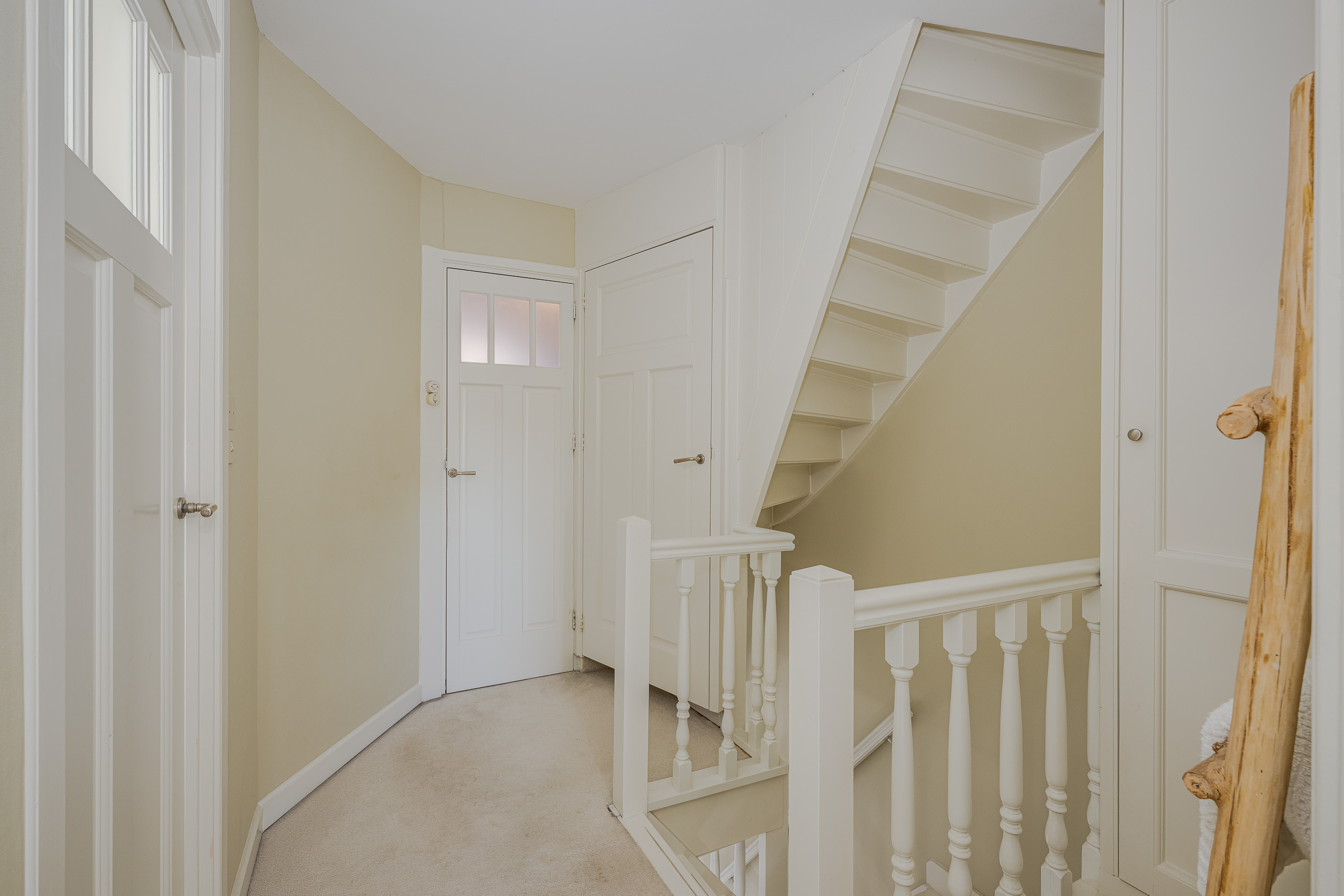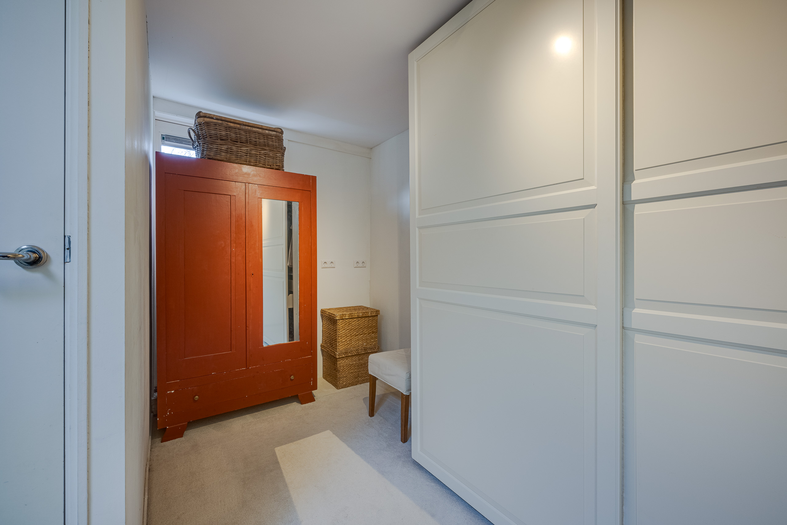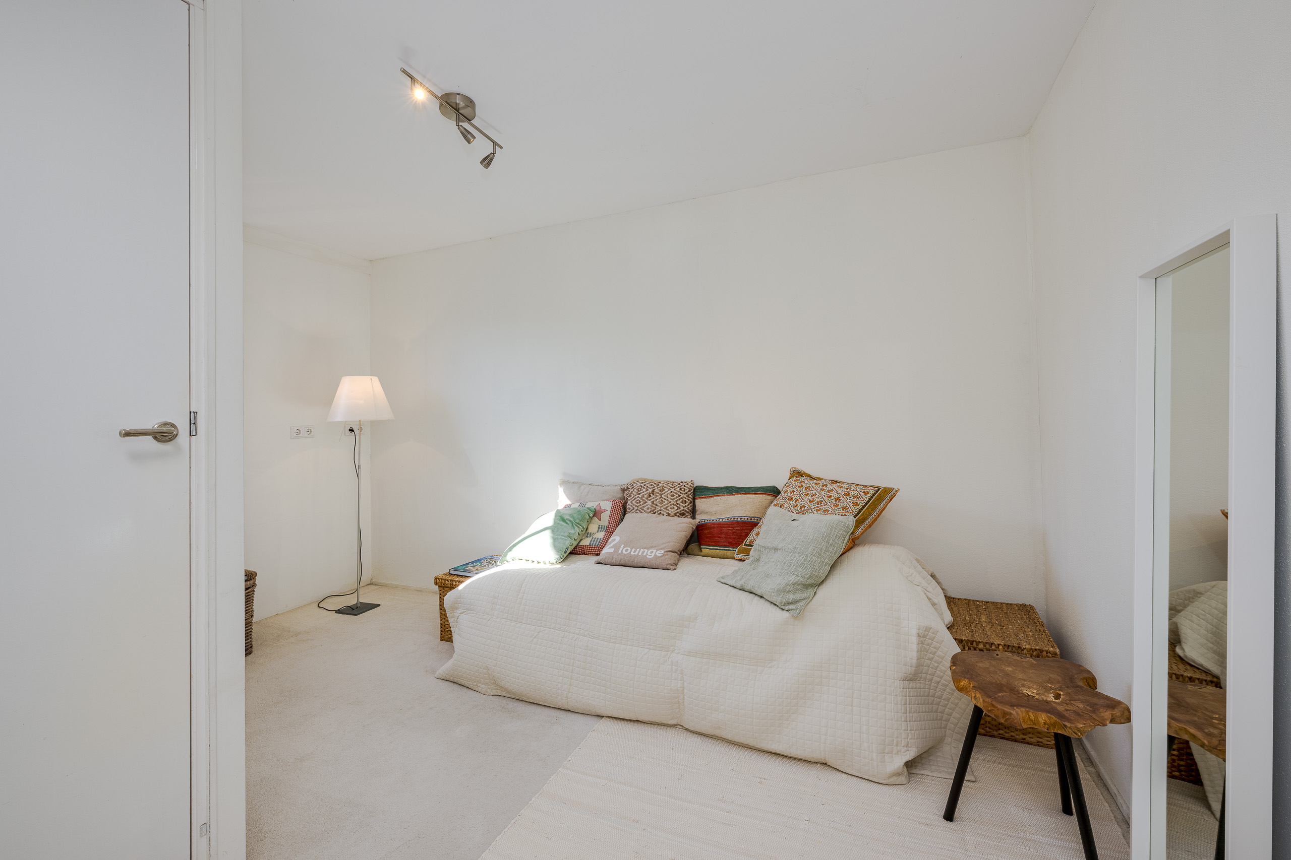 1e verdieping: overloop, deur links naar slaapkamers met veel lichtinval door de vele raampartijen. 2e deur naar kleinere slaapkamer. Deur naar nette badkamer met toilet. Trap naar zolderkamer.