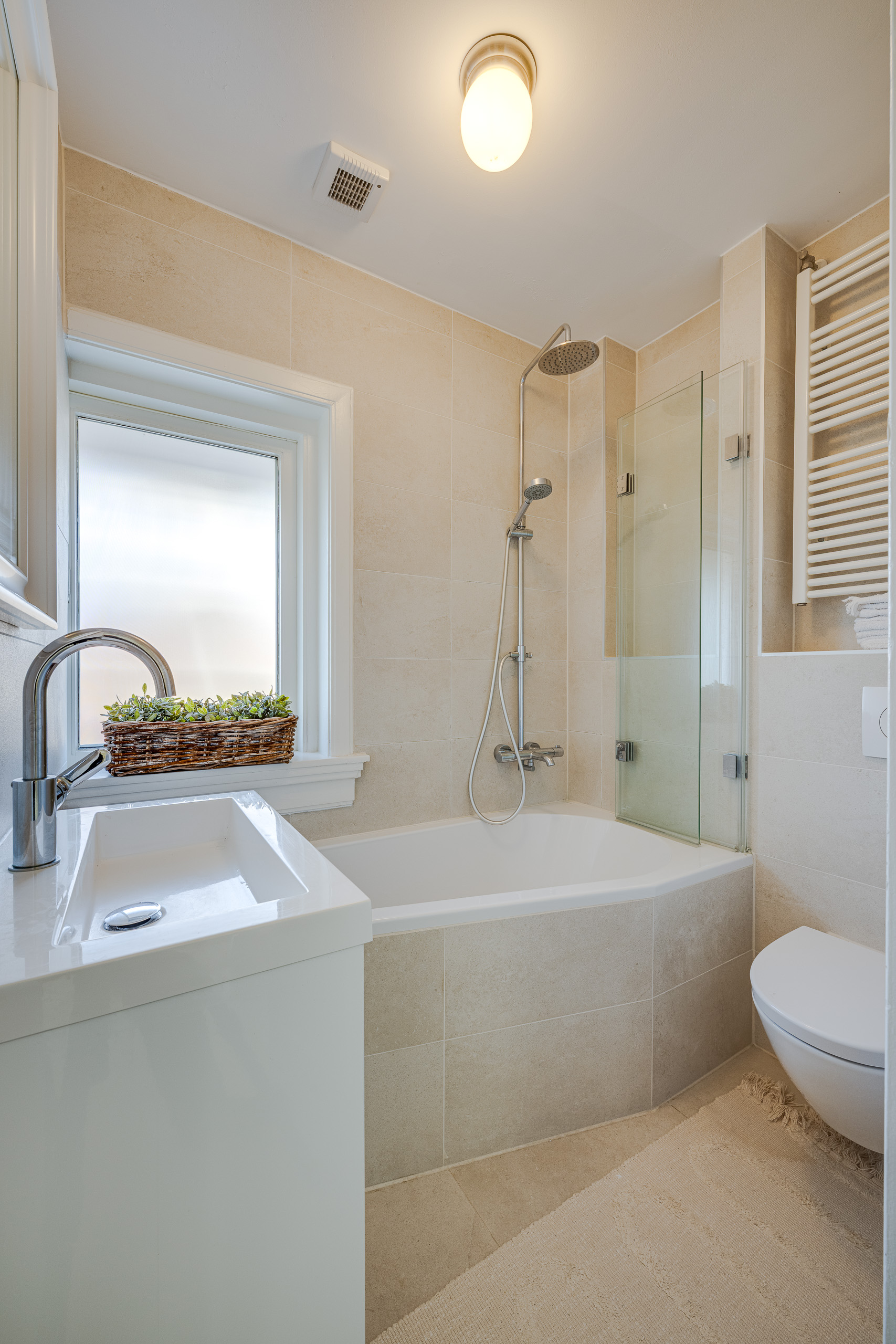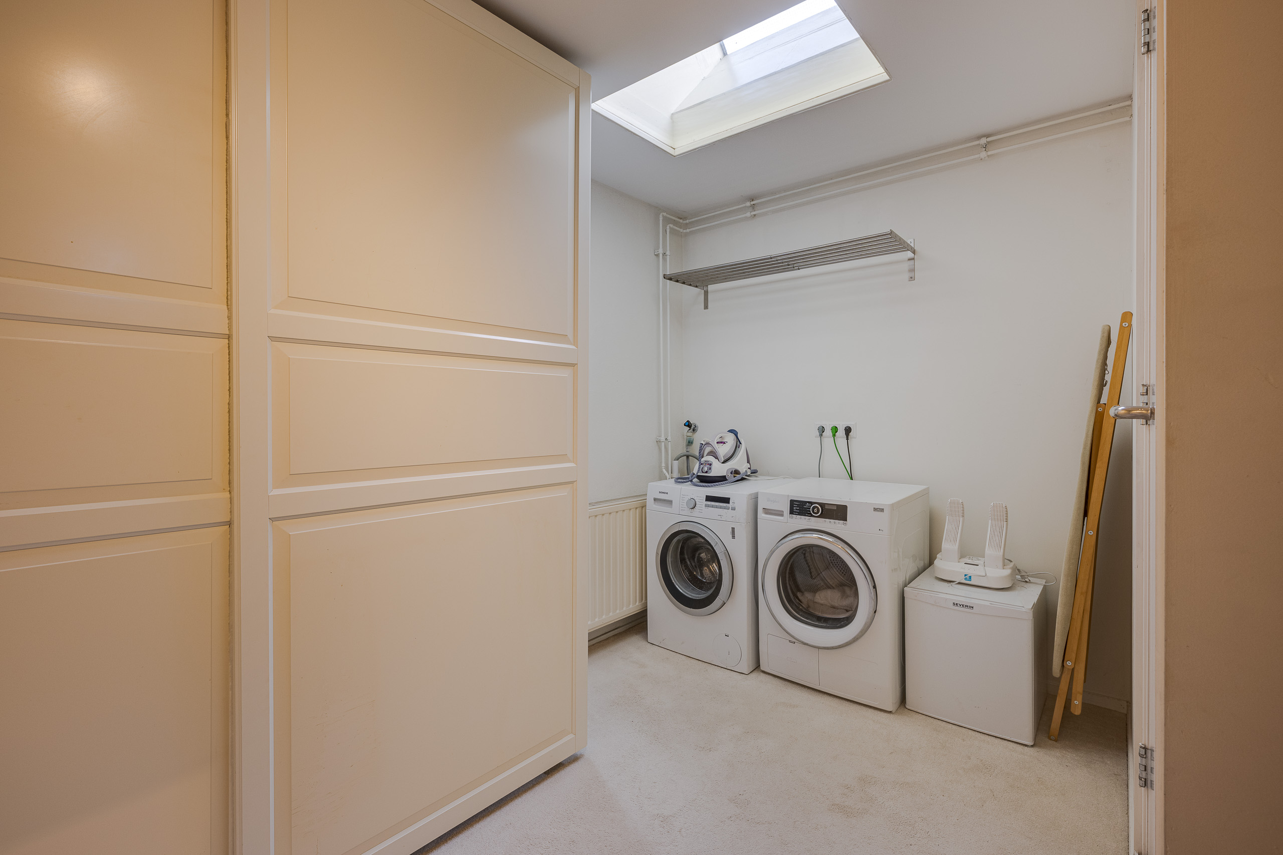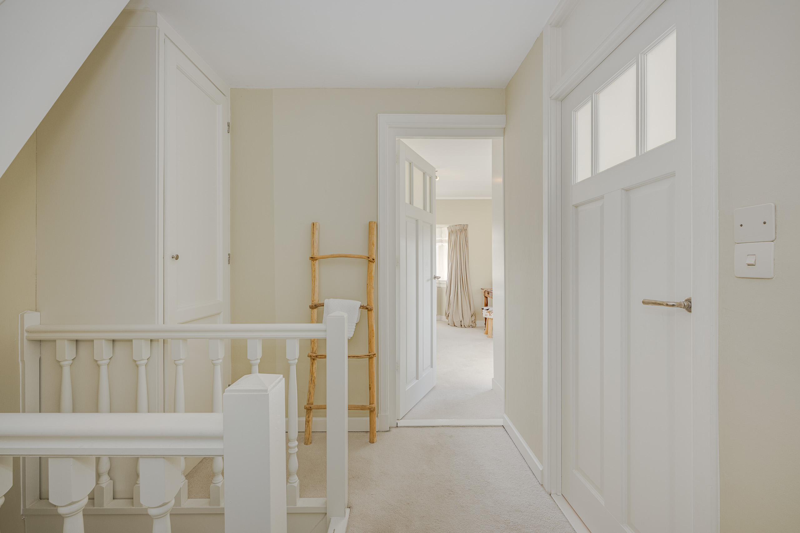 1e verdieping: overloop, deur links naar slaapkamers met veel lichtinval door de vele raampartijen. 2e deur naar kleinere slaapkamer. Deur naar nette badkamer met toilet. Trap naar zolderkamer.